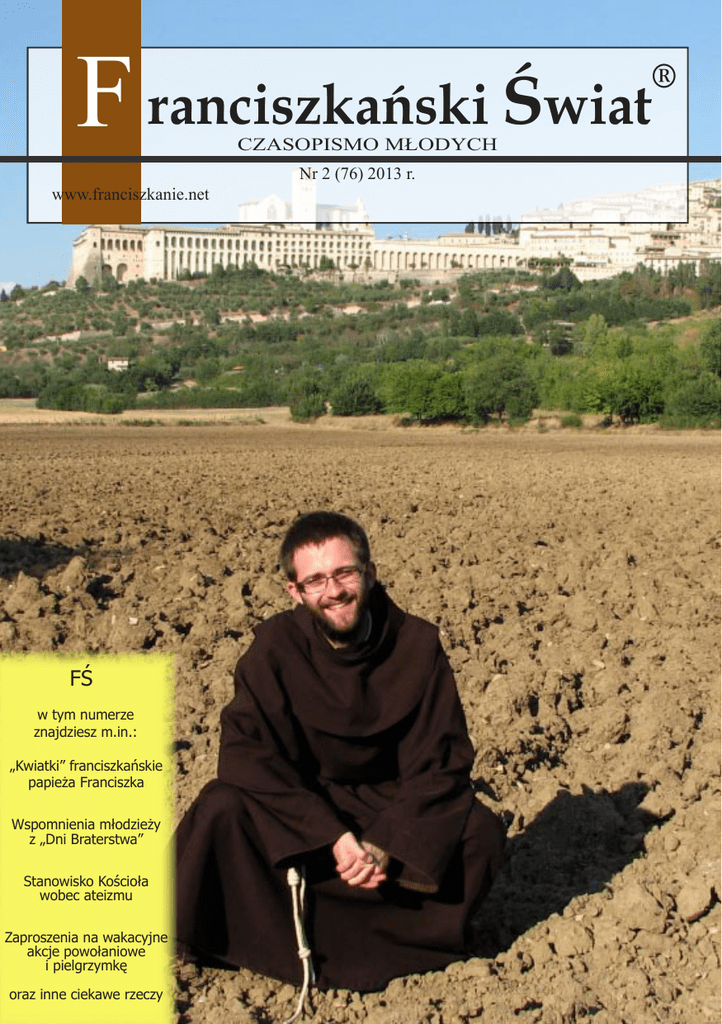 F ranciszkański Świat ® CZASOPISMO MŁODYCH www.franciszkanie.net Nr 2 (76) 2013 r. FŚ w tym numerze znajdziesz m.in.: „Kwiatki” franciszkańskie papieża Franciszka Wspomnienia młodzieży z „Dni Braterstwa” Stanowisko Kościoła wobec ateizmu Zaproszenia na wakacyjne akcje powołaniowe i pielgrzymkę oraz inne ciekawe rzeczy Franciszkański Świat Pokój i Dobro! Pokój i Dobro! Drodzy Czytelnicy Franciszkańskiego Świata Nie tak dawno świętowaliśmy zakończenie starego i rozpoczęcie nowego roku, a w tej chwili zbliżamy się do przerwy wakacyjnej. Myślę, że znane jest nam stwierdzenie, że od Pana Boga nie ma wakacji. To prawda. Odpocząć moża - i trzeba nawet - od pracy, nauki, ale nie od wiary. Wiarę należy potwierdzać uczynkami, bo inaczej jest ona martwa, nie istnieje. Niech czas nadchodzących wakacji będzie czasem przeżytym po Bożemu, z Jego słowem na ustach, pokojem w sercu i dobrem dla wszystkich ludzi. Z najlepszymi życzeniami odpoczynku i nabrania sił do dalszej pracy. Nasz adres: Franciszkański Świat ul. Mickiewicza 1 64 - 510 Wronki Franciszkański Świat o. Sylwester Brzeziński OFM Spis treści: Na Dzień Matki....................................................................................................4 /br. Justyn Berus OFM/ Jak trudno /wiersz/..............................................................................................6 /Weronika/ Franciszkański Świat na Facebook’u...................................................................7 Wybrane „kwiatki” franciszkańskie papieża Franciszka...............................8 /o. Salezy Tomczak OFM/ Z Pism świętego Franciszka z Asyżu...............................................................11 „Dni Braterstwa” w Pakości - wspomnienia uczestników.............................12 /Nikola, Dominika, Kasia/ Zaproszenie na powołaniowy weekend w klasztorze w Osiecznej............15 Stanowisko Kościoła wobec ateizmu.........................................................16 /o. Grzegorz Błoch OFM/ Zaproszenie do Franciszkańskiego Liecum Ogólnokształcącego..............19 Krzyżówka............................................................................................................20 Mój Patron - Patronem Europy........................................................................22 /br. Benedykt Stolarski OFM/ Powołaniowe akcje franciszkańskie.................................................................25 Wyższa Szkoła Filologii Hebrajskiej w Toruniu zaprasza..........................26 „Abyście ogłaszali chwalebne dzieła...” - siła modlitwy uwielbienia.............28 /Zuzanna Mikołajczak - Książek/ Zaproszenie na pielgrzymkę brodnicką.........................................................31 Święta Maria Magdalena - nawrócona kobieta cudzołożna?...................32 /o. Sylwester Brzeziński OFM/ Franciszkański Świat Kościół i rodzina Pokój i Dobro! Na Dzień Matki aj kojarzy się nam najczęśM ciej z majówkami, maturami oraz kwitnącymi kwiatami. Dla lu- dzi wierzących maj jest szczególnie związany z Maryją i jej kultem, to właśnie wtedy odbywają się tradycyjne nabożeństwa ku czci Matki Najświętszej. Wierni gromadzą się wtedy w kościołach lub przy figurach Matki Bożej, aby na Jej chwałę śpiewać litanię loretańską i pieśni. Oprócz tego w maju jest jeszcze jeden szczególny dzień, który dotyczy zarówno katolików, jak i wszystkich innych ludzi. Tym dniem jest 26 maja, kiedy obchodzimy Dzień Matki. Dzień, który zasadniczo nie różni się niczym od innych dni roku, a jednak ma w sobie pewien urok, urok związany z naszym sercem, naszym dzieciństwem, początkiem naszego życia. Dlatego ten dzień w sposób szczególny powinien być przeżyty z naszymi Mamami. Jest to okazja, aby złożyć im życzenia, usiąść, porozmawiać, wręczyć mały upominek, czy zanieść kwiaty na grób, jeśli nasza Mama już nie żyje. Spójrzmy co mówi Pismo święte na temat szacunku do naszych Rodzicielek: Kto szanuje matkę, jakby skarby gromadził (Syr 3, 4). W tych słowach zawarta jest wielka obietnica dla każdego człowieka, który z godnością i szacunkiem będzie się odnosił do swojej Mamy! Skoro sam Bóg przez swoich proroków mówi nam o takich sprawach, to w myśl posłuszeństwa Jego słowu, my musimy szanować nasze Mamy! Nie może być tak, abyśmy traktowali Je jak innych ludzi. Choćby były złe, choćby miały problemy z różnymi nałogami, choćby nie zajmowały się nami, to my winniśmy im dziękować mimo wszystko, ponieważ gdyby nie One, to nie byłoby nas na świecie! Prawda jest taka, że bez Mamy nikt nie mógłby pojawić się na tym świecie. Nawet Jezus Chrystus, Bóg, Franciszkański Świat kiedy przyszedł na świat miał Mamę w osobie Maryi. Jak dobrze wiemy pod krzyżem dał Maryję również nam za Matkę. Od tego momentu, możemy być pewni, że zawsze mamy Matkę, nawet wtedy, kiedy rodzona już nie żyje lub kiedy nas opuściła. Ze słów Pisma świętego wynika również, że Mama jest skarbem, którego nikt nam nie zastąpi. Któż z nas nie wzrusza się, kiedy przypomni sobie, jak Mama czytała mu bajki na dobranoc, czy troszczyła się, kiedy był chory i leżał w łóżku. Komu nie zakręci się łezka w oku, kiedy wspomni troskę Mamy o nasze potrzeby, czy o to abyśmy dobrze przygotowani ruszali do szkoły każdego dnia. Pomijam już fakt samego dbania o nasze żołądki, opartego na przygotowywaniu codziennie pysznego obiadu czy trosce, abyśmy mieli w ogóle co jeść. Nie można też policzyć zasług za czyny, których nie da się opisać, a tym bardziej nie da się sprawdzić poziomu miłości, jaki Mama ma w sercu względem nas, swoich dzieci. Fakt jest też taki, że miedzy dzieckiem nawiązuje się specyficzny kontakt z Mamą przez pępowinę. Czasem nam się wydaje, że uda się coś ukryć przed Mamą, wtedy jednak potrafi Ona nas 