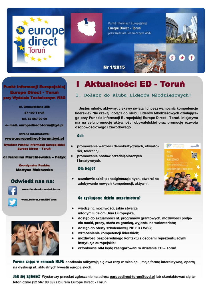 N A Z W A F I R M Y Nr 1/2015 Punkt Informacji Europejskiej Europe Direct - Toruń 1. Dołącz do Klubu Liderów Młodzieżowych! przy Wydziale Technicznym WSG ul. Grunwaldzka 25b Jesteś młody, aktywny, ciekawy świata i chcesz wzmocnić kompetencje liderskie? Nie czekaj, dołącz do Klubu Liderów Młodzieżowych działającego przy Punkcie Informacji Europejskiej Europe Direct - Toruń. Inicjatywa ma na celu promocję aktywności obywatelskiej oraz promocję rozwoju osobowościowego i zawodowego . 87-100 Toruń tel. 52 567 00 09 e- mail. [email protected] Strona internetowa: Cel: www.europedirect-torun.byd.pl Dyrektor Punktu Informacji Europejskiej Europe Direct – Toruń: dr Karolina Marchlewska – Patyk Koordynator Punktu: Dla kogo? Martyna Makowska Odwiedź nas na: promowanie wartości demokratycznych, otwartości, tolerancji promowanie postaw przedsiębiorczych i kreatywnych. uczniowie szkół ponadgimnazjalnych, otwarci na zdobywanie nowych kompetencji, aktywni. www.facebook.com/ed.torun Co zyskujecie dzięki uczestnictwu? www.twitter.com/EDTorun wiedzę nt. możliwości, jakie stwarza młodym ludziom Unia Europejska, dostęp do aktualności nt. programów grantowych, możliwości podjęcia nauki, pracy, stażu za granicą, wyjazdu na wolontariatu; dostęp do oferty szkoleniowej PIE ED i WSG; wzmocnienie kompetencji liderskich; możliwość bezpośredniego kontaktu z osobami reprezentującymi instytucje europejskie; członkowie KIM będę zaangażowani w działania ED – Toruń. Forma zajęć w ramach KLM: spotkania odbywają się dwa razy w miesiącu, mają formę interaktywną, opartą na dyskusji nt. aktualnych kwestii europejskich. Jak się zgłosić? Wystarczy przesłać zgłoszenie na adres: [email protected] lub skontaktować się telefonicznie (52 567 00 09) z biurem Europe Direct - Toruń. 2. Rozstrzygnięta V edycja konkursów z okazji EDJ Serdecznie dziękujemy wszystkim uczestnikom konkursów za nadesłanie prac. Wszystkie trzy konkursy cieszyły się dużym zainteresowaniem. Serdecznie gratulujemy! Kolejna edycja konkursów już w przyszłym roku! Uroczyste rozdanie nagród odbędzie się 9 lutego 2015 r. (poniedziałek) o godz. 11:00 w Wyższej Szkole Gospodarki w Bydgoszczy (ul. Królowej Jadwigi 14, budynek L – Akademicka Przestrzeń Kulturalna, Galeria nad Brdą). Na tę uroczystość serdecznie zapraszamy wszystkich laureatów i osoby wyróżnione wraz z opiekunami. Uprzejmie prosimy o wcześniejsze potwierdzenie przybycia drogą mailową na adres [email protected] lub telefoniczną pod nr: (52) 567 00 69. Lista laureatów dostępna jest na stronie internetowej ED-Toruń. Organizatorami konkursu są: Punkty Informacji Europejskiej Europe Direct – Toruń i Bydgoszcz, Punkty Eurodesk w Bydgoszczy i Inowrocławiu, Szkoła Języków Obcych w Bydgoszczy, Centrum Europejskie im. Roberta Schumana oraz Wyższa Szkoła Gospodarki Partnerzy: Posłowie do Parlamentu Europejskiego Janusz Zemke i Tadeusz Zwiefka 3. Spotkanie z ekspertem — 23 lutego 2015 r. 3. Zapraszamy na comiesięczne bezpłatne spotkanie z ekspertem ds. funduszy europejskich. Odbędzie się ono 23 lutego 2015 r. (poniedziałek) w godzinach od 16.00 do 19.00. Wszystkich zainteresowanych zapraszamy do biura Punktu Europejskiej Europe Direct - Toruń przy ul. Grunwaldzkiej 25 b w ToruDyżury eksperta doInformacji spraw funduszy europejskich - chęci 26 maja 2014 r. w spotkaniu, konniu. Prosimy o wcześniejsze zgłoszenie wzięcia udziału taktując się z konsultantem osobiście w godzinach pracy biura, mailowo: [email protected] lub telefonicznie: 052 567 00 09. 4. Podziel się swoją opinią! Czy kiedykolwiek kontaktowałeś się z Punktem Informacji Europejskiej Europe Direct – Toruń przy Wydziale Technicznym WSG? Wziąłeś udział w lekcji europejskiej, konferencji, pikniku europejskim, skorzystałeś z możliwości konsultacji z naszym ekspertem ds. funduszy europejskich? Jeżeli tak, to prosimy o wyrażenie swojej opinii za pomocą krótkiej anonimowej ankiety, która pozwoli nam podnieść jakość naszych usług. Znajdziesz ją tutaj: http://ec.europa.eu/eusurvey/ runner/EDICfeedback2014? surveylanguage=PL. Twoje zdanie jest dla nas ważne! 1. Konkurs na najlepszy artykuł Zachęcamy do wzięcia udziału w konkursie literackim dla młodych Europejczyków „Tak podobni, tak różni, tak europejscy”. Tematem przewodnim jest rozszerzenie Unii Europejskiej a zgłoszona praca powinna odnosić się do dwóch poniższych pytań: Jakie są Twoje doświadczenia w rozszerzonej Unii Europejskiej? Jak rozszerzona Unia Europejska może sprostać wyzwaniom przyszłości? Konkurs dedykowany jest młodym Europejczykom w wieku od 18 do 27 lat, obywatelom państw członkowskich Unii Europejskiej. Jury wybierze po jednym zwycięzcy z każdego kraju członkowskiego. Na laureatów czekają trzydniowe wizyty studyjne w Brukseli, a ich prace zostaną opublikowane przez Komisję Europejską. Termin przesyłania prac: 27 lutego 2015 r. Szczegóły na: http://ec.europa.eu/polska/news/ 2. Zaśpiewaj-sfilmuj-prześlij-zagłosuj Europejski Komitet Ekonomiczno-Społeczny organizuje po raz trzeci doroczny konkurs internetowy na film wideo. W tej edycji konkursu, zorganizowanej w partnerstwie z łotewską prezydencją w Radzie UE i zatytułowanej „Europa na głosy – Europe in Harmony”, mogą brać udział osoby zajmujące się amatorsko produkcją materiałów wideo, chóry i zespoły wokalne ze wszystkich 28 państw członkowskich UE. Więcej na temat konkursu: www.eesc.europa.eu/ 3. Nagroda im. Karola Wielkiego Do 23 lutego 2015 roku można nadsyłać zgłoszenia do konkursu, organizowanego wspólnie przez Parlament Europejski i Fundację Międzynarodowej Nagrody im. Karola Wielkiego w Akwizgranie. Zgłaszać mogą się osoby w wieku 16 – 30 lat, realizujące różnego rodzaju działania ułatwiające porozumienie i współpracę między Europejczykami, np. programy wymiany młodzieży, projekty artystycz