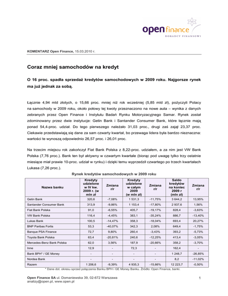 KOMENTARZ Open Finance, 15.03.2010 r. Coraz mniej samochodów na kredyt O 16 proc. spadła sprzedaż kredytów samochodowych w 2009 roku. Najgorsze rynek ma już jednak za sobą. Łącznie 4,94 mld złotych, o 15,66 proc. mniej niż rok wcześniej (5,85 mld zł), pożyczyli Polacy na samochody w 2009 roku, około połowy tej kwoty przeznaczono na nowe auta – wynika z danych zebranych przez Open Finance i Instytutu Badań Rynku Motoryzacyjnego Samar. Rynek został zdominowany przez dwie instytucje: Getin Bank i Santander Consumer Bank, które łącznie mają ponad 54,4-proc. udział. Do tego pierwszego należało 31,03 proc., drugi zaś zajął 23,37 proc. Ciekawie przedstawiają się dane za sam czwarty kwartał, bo przewaga lidera była bardzo nieznaczna: wartości te wynoszą odpowiednio 26,57 proc. i 26,01 proc. Na trzecim miejscu rok zakończył Fiat Bank Polska z 8,22-proc. udziałem, a za nim jest VW Bank Polska (7,76 proc.). Bank ten był aktywny w czwartym kwartale (biorąc pod uwagę tylko trzy ostatnie miesiące miał prawie 10-proc. udział w rynku) i dzięki temu wyprzedził czwartego po trzech kwartałach Lukasa (7,26 proc.). Rynek kredytów samochodowych w 2009 roku Kredyty udzielone w IV kw. 2009 r. (w mln zł Zmiana r/r Kredyty udzielone w całym 2009 (w mln zł) Zmiana r/r Saldo kredytów na koniec 2009 r (mln zł) Zmiana r/r Getin Bank 320,6 -7,08% 1 531,3 -11,75% 3 644,2 13,95% Santander Consumer Bank 313,9 -9,86% 1 153,4 -17,80% 2 937,6 1,56% Fiat Bank Polska 91,0 -6,55% 405,7 -19,17% 828,4 -3,63% VW Bank Polska Lukas Bank 116,4 -4,45% 383,1 -35,24% 886,7 -13,40% 100,5 -14,47% 358,3 -18,04% 693,4 20,27% BNP Paribas Fortis 53,3 -40,07% 342,3 2,08% 649,4 -1,75% Banque PSA Finance 72,7 9,80% 260,4 -3,43% 393,2 -5,73% Toyota Bank Polska 63,4 -20,81% 240,6 -12,25% 413,4 -3,05% Mercedes-Benz Bank Polska 62,0 3,56% 187,9 -20,66% 358,2 -3,70% Inne 12,9 - 72,3 - 162,4 - - - - - 1 248,7 -26,85% Nazwa banku Bank BPH* / GE Money Nordea Bank Razem - - - - 8,2 -11,02% 1 206,6 -9,39% 4 935,3 -15,66% 12 223,7 -0,50% * Dane dot. okresu sprzed połączenia Banku BPH i GE Money Banku. Źródło: Open Finance, banki. Open Finance SA ul. Domaniewska 39, 02-672 Warszawa [email protected], www.open.pl 1 Czwarty kwartał 2009 roku był – podobnie jak trzeci – gorszy od analogicznego okresu w roku 2008. Zdecydowana większość banków, które odpowiedziały na ankietę, zanotowała spadek sprzedaży w ujęciu kwartalnym. Uniknęły tego Mercedes-Benz Bank Polska (+3,56 proc.) i Banque PSA Finance (+9,80 proc.). Gdy zsumować cały 2009 rok okaże się, że jedynie BNP Paribas Fortis zanotował niewielki (2,08 proc.) wzrost, we wszystkich pozostałych bankach mieliśmy do czynienia ze zmianą negatywną. Cały rynek spadł rok do roku o 15,66 proc., a kryzys najbardziej dotknął VW Bank Polska (-35,24 proc.) i Mercedes-Benz Bank Polska (-20,66 proc.). Oprócz BNP Paribas Fortis dobrze z finansową zawieruchą poradził sobie Banque PSA Finance, w którym spadek wyniósł zaledwie 3,43 proc. W pozostałych instytucjach (w tym u dwójki liderów) spadki wyniosły 10-20 proc. Gorszy wynik VW Banku Polska nie mógł nie wpłynąć na pozycję tego banku w zestawieniu. Za 2008 rok bank ten miał ponad 10-proc. udział w rynku i był na nim trzecią siłą, teraz jest czwarty, a jego udział w rynku skurczył się o jedną czwartą. Getin zajmuje się głównie samochodami używanymi, w 2009 roku 84,25 proc. wartości sprzedanych przez niego kredytów dotyczyło aut „z drugiej ręki”. Na drugim biegunie jeśli chodzi o podział na finansowanie zakupów pojazdów nowych i używanych są VW Bank Polska (92,47 proc. nowych aut w 2009 roku), Mercedes-Benz Bank Polska (89,54 proc.) oraz Banque PSA Finance i Fiat Bank Polska (oba ponad 87 proc.), co zresztą nie powinno dziwić – to banki należące do koncernów samochodowych, ich głównym źródłem klientów jest współpraca z dilerami. Łącznie 53,17 proc. wartości udzielonych kredytów dotyczyła samochodów nowych, a 46,83 proc. – używanych. Niespodzianki nie ma w zestawieniu prezentującym średnią wartości kredytu. Skoro Mercedes produkuje drogie auta, to jego bank powinien udzielać największych kredytów i tak właśnie jest. Średnia kwota kredytu na nowe auto udzielony w 2009 roku w Mercedes-Benz Bank Polska to 92,5 tys. zł, dwa i pół razy więcej niż Banque PSA Finance (36,7 tys. zł). W przypadku samochodów używanych, najwyższe średnie kredyty także są w Mercedes-Benz Bank Polska (75,8 tys. zł), a najniższe w BNP Paribas Fortis (22,5 tys. zł). Open Finance SA ul. Domaniewska 39, 02-672 Warszawa [email protected], www.open.pl 2 Rynek kredytów samochodowych w 2009 roku – średnia wartość kredytu Nazwa banku Mercedes-Benz Bank Polska Średnia wartość (tys. zł) kredytu na nowy samochód w '09 92,520 Średnia wartość (tys. zł) kredytu na samochód używany w '09 75,803 Inne 58,592 35,052 Lukas Bank 50,995 36,197 Getin Bank 48,935 26,303 Santander Consumer Bank 48,338 36,455 Toyota Bank Polska 45,399 29,066 BNP Paribas Fortis 42,799 22,453 VW Bank Polska 42,761 34,634 Fiat Bank Polska 39,697 23,272 Banque PSA Finance 36,725 26,500 Źródło: Open Finance, banki. Podobnie jak w trzecim, tak i w czwartym kwartale, sprzedaż kredytów samochodowych w dużej mierze determinowało ogólne zaostrzenie polityki kredytowej przez banki. Dotyczyło ono także kredytów hipotecznych jak i konsumenckich. Powodem tego jest oczywiście sytuacja gospodarcza kraju – banki nadal obawiają się nagłego pogorszenia portfeli swoich kredytów i w kwestii pożyczania pieniędzy działają ostrożnie. Pod koniec 2009 roku trend ten zaczął się odwracać i w czwartym kwartale sprzedano więcej kredytów niż w trzecim (1,21 mld vs 1,14 mld złotych), ale wpływ na to mogła mieć sezonowość rynku (wyprzedaże zapasów). Marcin Krasoń, analityk Open Finance Open Finance SA ul. Domaniewska 39, 02-672 Warszawa [email p