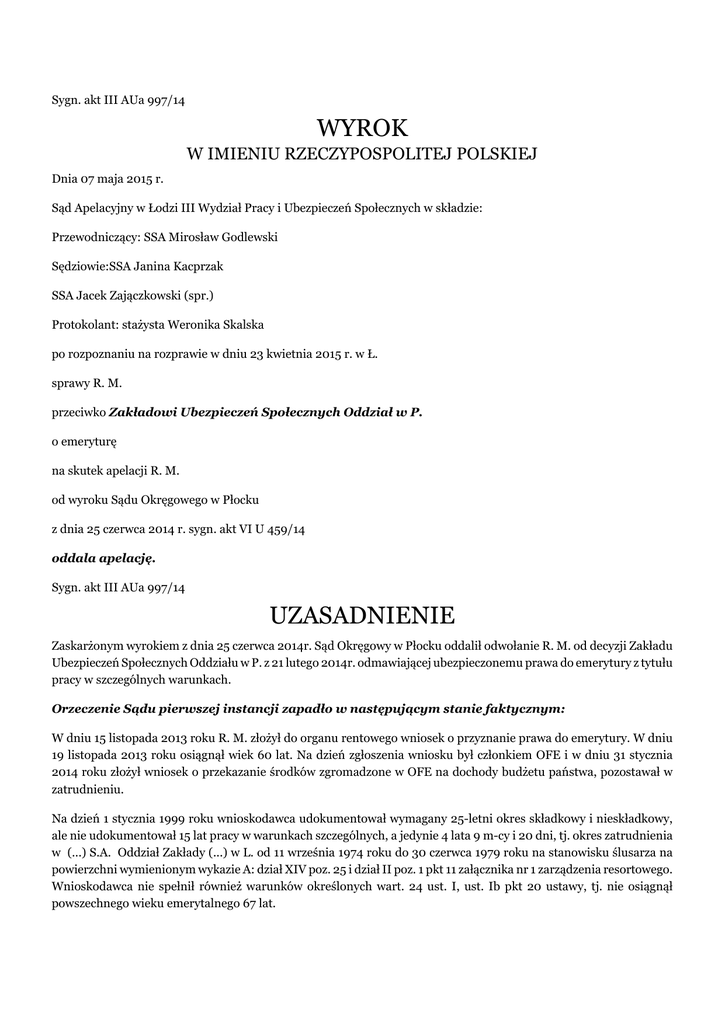 Sygn. akt III AUa 997/14 WYROK W IMIENIU RZECZYPOSPOLITEJ POLSKIEJ Dnia 07 maja 2015 r. Sąd Apelacyjny w Łodzi III Wydział Pracy i Ubezpieczeń Społecznych w składzie: Przewodniczący: SSA Mirosław Godlewski Sędziowie:SSA Janina Kacprzak SSA Jacek Zajączkowski (spr.) Protokolant: stażysta Weronika Skalska po rozpoznaniu na rozprawie w dniu 23 kwietnia 2015 r. w Ł. sprawy R. M. przeciwko Zakładowi Ubezpieczeń Społecznych Oddział w P. o emeryturę na skutek apelacji R. M. od wyroku Sądu Okręgowego w Płocku z dnia 25 czerwca 2014 r. sygn. akt VI U 459/14 oddala apelację. Sygn. akt III AUa 997/14 UZASADNIENIE Zaskarżonym wyrokiem z dnia 25 czerwca 2014r. Sąd Okręgowy w Płocku oddalił odwołanie R. M. od decyzji Zakładu Ubezpieczeń Społecznych Oddziału w P. z 21 lutego 2014r. odmawiającej ubezpieczonemu prawa do emerytury z tytułu pracy w szczególnych warunkach. Orzeczenie Sądu pierwszej instancji zapadło w następującym stanie faktycznym: W dniu 15 listopada 2013 roku R. M. złożył do organu rentowego wniosek o przyznanie prawa do emerytury. W dniu 19 listopada 2013 roku osiągnął wiek 60 lat. Na dzień zgłoszenia wniosku był członkiem OFE i w dniu 31 stycznia 2014 roku złożył wniosek o przekazanie środków zgromadzone w OFE na dochody budżetu państwa, pozostawał w zatrudnieniu. Na dzień 1 stycznia 1999 roku wnioskodawca udokumentował wymagany 25-letni okres składkowy i nieskładkowy, ale nie udokumentował 15 lat pracy w warunkach szczególnych, a jedynie 4 lata 9 m-cy i 20 dni, tj. okres zatrudnienia w (...) S.A. Oddział Zakłady (...) w L. od 11 września 1974 roku do 30 czerwca 1979 roku na stanowisku ślusarza na powierzchni wymienionym wykazie A: dział XIV poz. 25 i dział II poz. 1 pkt 11 załącznika nr 1 zarządzenia resortowego. Wnioskodawca nie spełnił również warunków określonych wart. 24 ust. I, ust. Ib pkt 20 ustawy, tj. nie osiągnął powszechnego wieku emerytalnego 67 lat. ZUS do stażu pracy w warunkach szczególnych okres nie zaliczył zatrudnienia: - w Przedsiębiorstwie (...) w P., gdzie wnioskodawca w okresie od 11 lipca 1979 roku do 31 grudnia 1991 roku wykonywał prace na stanowisku ślusarza; - w P. - (...) w W., gdzie w okresie od 1 stycznia l992 roku do 31 grudnia 1998 roku wykonywał prace na stanowisku ślusarza. Na potwierdzenie zatrudnienia w warunkach szczególnych w N. wnioskodawca złożył dokumentację z akt osobowych (angaże, umowy o pracę, zakres obowiązków brygadzisty ślusarzy remontowych, rozliczenie okresu pracy na budowie eksportowej od 23 września 1985 roku do 10 sierpnia 1987 roku, karty wynagrodzeń z lat 1971-91), z których wynika, że od 11 lipca 1979 roku wykonywał prace ślusarza, od 1 października 1988 roku prace montera instalacji klimat. techn. i urządzeń grzewczych, od 1 stycznia 1989 roku montera wysokokwalifikowanego, od 27 lutego 1989 roku montera specjalisty, od 16 czerwca 1989 roku montera wysokokwalifikowanego, a od 1 stycznia 1990 roku ślusarza specjalisty. Dokumenty te nie potwierdzają, aby odwołujący wykonywał prace ślusarza na wysokości. (...) S.A. Oddział Produkcji P. (...) (następca prawny (...) Spółka z o.o.) dnia 17 października 2013 roku wystawił wnioskodawcy świadectwo wykonywania prac w szczególnych warunkach, w którym poświadczono, że R. M. jest zatrudniony od 1 stycznia 1992 roku do chwili obecnej w (...) S.A. Oddział Produkcji P. (...) (następca prawny (...) Spółka z o.o.), stale i w pełnym wymiarze czasu pracy wykonuje prace: ślusarz w okresie: 1.01.1992 - 31.12.2009 wymienionym w wykazie A dziale V poz. 28 pkt 8 wykazu stanowiącego Załącznik nr 1 do Zarządzenia nr 7 Ministra Przemysłu Chemicznego i Lekkiego z dnia 7 lipca 1987 roku w sprawie prac wykonywanych w szczególnych warunkach lub w szczególnym charakterze w zakładach pracy resortu przemysłu chemicznego i lekkiego (Dziennik Urzędowy Ministra Przemysłu Chemicznego i Lekkiego Nr 4 z dnia 3 sierpnia 1987r.) wydanego na podstawie Rozporządzenia Rady Ministrów z dnia 7 lutego 1983 roku w sprawie wieku emerytalnego pracowników zatrudnionych w szczególnych warunkach lub w szczególnym charakterze. W związku ze złożonym wnioskiem o emeryturę organ rentowy zwrócił się do pracodawcy o wystawienie świadectwa pracy w warunkach szczególnych z podaniem charakteru oraz rodzaju pracy wykonywanych w warunkach szczególnych zgodnie z powołanym Zarządzeniem Ministra Przemysłu Chemicznego i Lekkiego z dnia 7 lipca 1987 roku, (w świadectwie wykonywania prac w szczególnych warunkach z dnia 17 października 2013roku nie podano rodzaju pracy określonego ściśle według wykazu, działu i pozycji rozporządzenia z dnia 7 lutego 1983 roku, a ponadto w powołanym zarządzeniu w Wykazie A dział V poz. 2B pkt 8 wykazane jest stanowisko ślusarz (wykonujący pracę na wysokości). W odpowiedzi (...) S.A. poinformował, że w aktach osobowych R. M. nie ma dokumentów potwierdzających pracę na wysokości. (...) S.A. w W., w świadectwie wykonywania prac w warunkach szczególnych z dnia 17 października 2013 roku nie określił jakiego rodzaju prace odwołujący wykonywał zgodnie z wykazem A rozporządzenia Rady Ministrów z 7 lutego 1983r. Zgodnie z powołanym wykazem A w/w zarządzenia resortowego pod poz. 2B „budowa oraz remont chłodni kominowych i kominów przemysłowych” pkt 8 działu V „w budownictwie” wymienione zostało stanowisko pracy „ślusarz wykonujący prace na wysokości”. W oparciu o przedłożone dokumenty organ rentowy zaskarżoną decyzją nie uznał, aby odwołujący stale i w pełnym wymiarze czasu prace przez cały ten okres zatrudnienia wykonywał prace w warunkach szczególnych określone w wykazie A dział V poz. 2 „budowa oraz remont chłodni kominowych i kominów przemysłowych” rozporządzenia Rady Ministrów z dnia 7 lutego 1983r. w sprawie wieku emerytalnego pracowników zatrudnionych w szczególnych warunkach lub w szczeg