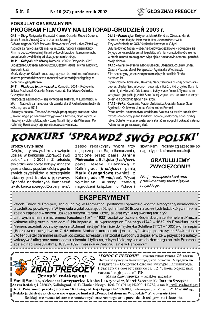 Str. 8 GŁOS ZNAD PREGOŁY Nr 10 (87) październik 2003 KONSULAT GENERALNY RP: PROGRAM FILMOWY NA LISTOPAD-GRUDZIEŃ 2003 r. 05.11 – Dług. Reżyseria: Krzysztof Krause. Obsada: Robert Gonera, Jacek Boruch, Andrzej Chyra, Joanna Szurmej. Główna nagroda XXIV festiwalu filmowego w Gdyni – dwa Złote Lwy, nagroda za najlepszą rolę męską, muzykę, nagroda dziennikarzy. Film na podstawie realnej historii o dwóch braciach-biznesmenach, próbujących uwolnić się od ciążącego na nich długu. 19.11 – Chłopaki nie płaczą. Komedia, 2002 r. Reżyseria: Olaf Lubaszenko. Obsada: Maciej Sztur, Cezary Pazura, Michał Miłowicz, Wojciech Klata. Młody skrzypek Kuba Brener, pragnący pomóc swojemu nieśmiałemu koledze poznać dziewczyny, nieoczekiwanie zostaje wciągnięty w porachunki gangsterskie. 26.11 – Pieniądze to nie wszystko. Komedia, 2001 r. Reżyseria: Juliusz Machulski. Obsada: Marek Kondrat, Stanisława Celińska, Cezary Kosiński. Nagroda za najśmieszniejszą komedię na festiwalu w Lubomierzu w 2001 r. Nagroda za najlepszą rolę żeńską dla S. Celińskiej na festiwalu w Szanghaju w 2001 r. U szczytu sukcesu Tomasz Adamczyk, prosperujący producent wina „Platon”, nagle postanawia zrezygnować z biznesu, czym wywołuje niepokój swoich najbliższych – żony Natalii i jej brata Wiesława. Po rodzinnej kłótni zaczynają się nieszczęścia winiarza... Drodzy Czytelnicy! Dziękujemy wszystkim za wzięcie udziału w konkursie „Sprawdź swój polski” z nr. 9-2003 r. Z radością stwierdziliśmy po raz kolejny, iż nasza gazeta cieszy popularnością w gronie swoich czytelników, a szczególnie lubiany jest konkurs językowy. Spośród nadesłanych tłumaczeń tekstu konkursowego „Eksperyment”, 03.12 – Prawo ojca. Reżyseria: Marek Kondrat. Obsada: Marek Kondrat, Nina Rogóż, Piotr Machalica, Szymon Bobrowiski. Trzy wyróżnienia na XXIV festiwalu filmowym w Gdyni. Były rajdowiec Michał – obecnie kierowca ciężarówki – dowiaduje się, że jego córka została brutalnie pobita. Wymiar sprawiedliwości nie jest w stanie ukarać przestępców, więc ojciec postanawia samemu pomścić swoje dziecko. 10.12 – Sara. Reżyseria: Maciej Ślesicki. Obsada: Bogusław Linda, Cezary Pazura, Marek Perepeczko, Agnieszka Włodarczyk. Film sensacyjny, jeden z najpopularniejszych polskich filmów ostatnich lat. Ojciec głównej bohaterki, 16-letniej Sary, zatrudnia dla niej ochroniarza Leona. Między Sarą a Leonem powstaje miłość, o której ojciec Sary nie może się dowiedzieć. Dla Leona to byłby wyrok śmierci. Tymczasem wrogowie ojca próbują zabić Sarę. W tej wojnie Leon zostaje ruchomym celem dla obu zmagających się stron. 17.12 – Fuks. Reżyseria: Maciej Dutkiewicz. Obsada: Maciej Sztur, Agnieszka Krukówna, Janusz Gajos, Adam Ferensi. Przed swoimi osiemnastymi urodzinami Alex ma na swoim koncie dwa rozbite samochody, jedną kradzież i bombę, podłożoną jednej grubej rybie. Bohater wreszcie postanawia stanąć na nogach i pokazać całemu światu na co go naprawdę stać. zespół redakcyjny wybrał trzy najlepsze prace. Są to tłumaczenia, zrobione przez panią Janinę Pietruszko z Bałtyjska (I miejsce), panią Teresę Griaznową z Kaliningradu (II miejsce) i panią Marię Szyngariową również z Kaliningradu (III miejsce). Wyżej wymienieni autorzy zostają nagrodzeni książkami o Polsce i słownikami. Prosimy zgłaszać się po nagrody pod adresem redakcji. GRATULUJEMY ZWYCIĘZCOM!!! Niżej - rozwiązanie konkursu – przetłumaczony tekst z języka rosyjskiego. EKSPERYMENT Włoch Enrico di Pompeo, znajdując się w Niemczech, postanowił sprawdzić wiedzę historyczną niemieckich urzędników pocztowych. W tym celu wysłał pocztą do różnych miast 30 listów na adres tych ludzi, których imiona zostały zapisane w historii ludzkości dużymi literami. Otóż, jakie są wyniki tej swoistej ankiety? List, wysłany na imię astronoma Kepplera (1571 – 1630), został zwrócony z Regensburga ze stemplem „Proszę wskazać ulicę oraz numer domu”. Na kopercie listu wysłanego do Goethego (1749 – 1832) do Frankfurtu nad Menem, urzędnik pocztowy napisał „Adresat nie żyje”. Na liście do Fryderyka Schillera (1759 – 1805) widniał napis „Pocztowemu urzędowi nr 7142 miasta Marbach adresat nie jest znany”. Urząd pocztowy nr 3340 miasta Wolfenbuettel daremnie usiłował „odszukać adresata”, i list został zwrócony z dopiskiem, że w przyszłości należy wskazywać ulicę oraz numer domu adresata. I tylko na jednym liście, wysłanym do Hamburga na imię Brahmsa, zostało napisane „Brahms, 1833 – 1897, mieszkał w Wiedniu, a nie w Hamburgu”. “ГОЛОС С ПРЕГОЛИ” – ежемесячная газета Общества Польской культуры Калининградской области. Учредитель и издатель – Общество Польской культуры Калининграда. Печатается в соответствии со ст. 12 “Закона о средствах массовой информации” РФ. Z e s p ół re da kcy jn y: Maria Ławrynowicz – redaktor naczelny Wasilij Wasiliew, Aleksandra Ł awrynowicz, Kleofas Ł awrynowicz, Marek Szczepaniak, Danuta Szczęsna Ad re s R e d ak c j i: 236039, Kaliningrad, ul. B.Chmielnickiego, 46/6. Tel.(0112)442000, 443787, e-mail: [email protected] Druk: Państwowe przedsiębiorstwo “Kaliningradzkaja tipografia” 236000, Kaliningrad, pr. Mira, 5. Nakład 500 egz. Redakcja dziękuje za okazywane wsparcie fundacji „Pomoc Polakom na Wschodzie”. Zamówienie 1208 Redakcja nie zwraca tekstów nie zamówionych oraz zastrzega sobie prawo do ich redagowania i skracania.