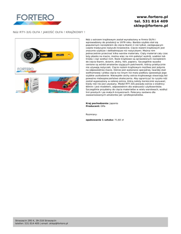 www.fortero.pl tel. 531 814 409 [email protected] Nóż RTY-3/G OLFA ! JAKOŚĆ OLFA ! KRĄŻKOWY ! Nóż z ostrzem krążkowym został wynaleziony w firmie OLFA i wprowadzony do produkcji w 1979 roku. Bardzo szybko stał się popularnym narzędziem do cięcia tkanin (i nie tylko), zastępującym często tradycyjne nożyczki krawieckie. Cięcie nożem krążkowym jest znacznie szybsze i dokładniejsze niż nożyczkami. Można nim jednocześnie przecinać kilka warstw materiału. Cięty materiał cały czas leży płasko na macie, można więc na nim położyć wykrój, szablon lub linijkę i ciąć wzdłuż nich. Noże krążkowe są sprawdzonym narzędziem do cięcia tkanin, dzianin, skóry, folii, papieru. Szczególnie wysoko cenione są wśród amatorów szyjących patchworki, którzy praktycznie nie używają nożyczek. Cięcie nożem krążkowym możliwe jest jedynie na odpowiedniej macie. Ostrze jest wykonane specjalnej, twardej stali wolframowej i próba cięcia na innym niż mata podłożu spowoduje jego szybkie uszkodzenie. Niezwykłe cechy ostrza krążkowego stwarzają też poważne niebezpieczeństwo skaleczenia. Aby ograniczyć to ryzyko nóż został wyposażony w osłonę ostrza, którą należy koniecznie wysuwać, kiedy nóż nie jest używany. Model RTY-3/G posiada ostrze o średnicy 60mm i jest modelem, odpowiednim dla większości użytkowników. Szczególnie przydatny do cięcia materiałów w wielu warstwach, wzdłuż linii prostych i po małych krzywiznach. Polecany zarówno dla zaawansowanych amatorów jak i profesjonalistów. Kraj pochodzenia: Japonia Producent: Olfa Rozmiary: opakowanie 1 sztuka: 71,82 zł Straszęcin 295 K, 39-218 Straszęcin telefon: 531 814 409 | email: [email protected]