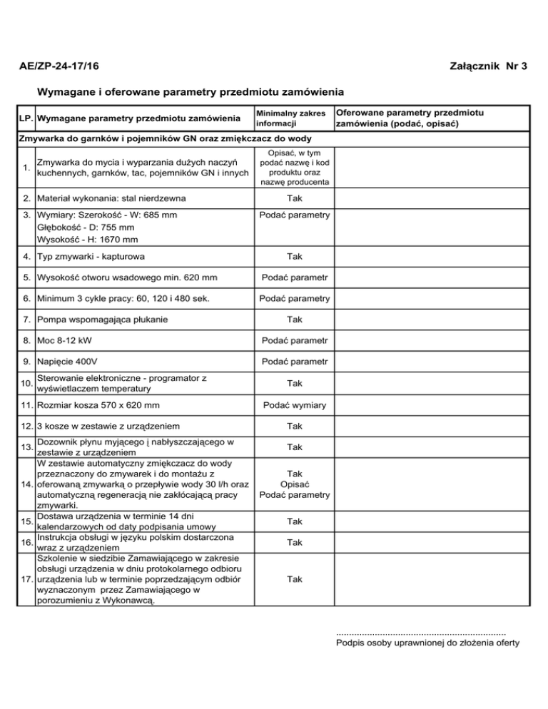 AE/ZP-24-17/16 Załącznik Nr 3 Wymagane i oferowane parametry przedmiotu zamówienia LP. Wymagane parametry przedmiotu zamówienia Minimalny zakres informacji Oferowane parametry przedmiotu zamówienia (podać, opisać) Zmywarka do garnków i pojemników GN oraz zmiękczacz do wody Zmywarka do mycia i wyparzania dużych naczyń 1. kuchennych, garnków, tac, pojemników GN i innych 2. Materiał wykonania: stal nierdzewna 3. Wymiary: Szerokość - W: 685 mm Głębokość - D: 755 mm Wysokość - H: 1670 mm 4. Typ zmywarki - kapturowa Opisać, w tym podać nazwę i kod produktu oraz nazwę producenta Tak Podać parametry Tak 5. Wysokość otworu wsadowego min. 620 mm Podać parametr 6. Minimum 3 cykle pracy: 60, 120 i 480 sek. Podać parametry 7. Pompa wspomagająca płukanie Tak 8. Moc 8-12 kW Podać parametr 9. Napięcie 400V Podać parametr 10. Sterowanie elektroniczne - programator z wyświetlaczem temperatury 11. Rozmiar kosza 570 x 620 mm 12. 3 kosze w zestawie z urządzeniem 13. 14. 15. 16. 17. Dozownik płynu myjącego į nabłyszczającego w zestawie z urządzeniem W zestawie automatyczny zmiękczacz do wody przeznaczony do zmywarek i do montażu z oferowaną zmywarką o przepływie wody 30 l/h oraz automatyczną regeneracją nie zakłócającą pracy zmywarki. Dostawa urządzenia w terminie 14 dni kalendarzowych od daty podpisania umowy Instrukcja obsługi w języku polskim dostarczona wraz z urządzeniem Szkolenie w siedzibie Zamawiającego w zakresie obsługi urządzenia w dniu protokolarnego odbioru urządzenia lub w terminie poprzedzającym odbiór wyznaczonym przez Zamawiającego w porozumieniu z Wykonawcą. Tak Podać wymiary Tak Tak Tak Opisać Podać parametry Tak Tak Tak .................................................................. Podpis osoby uprawnionej do złożenia oferty LP. Wymagane parametry przedmiotu zamówienia Do oferty należy dołączyć materiały informacyjne w języku polskim dotyczące parametrów oferowanego 18. przedmiotu zamówienia oraz jego zdjęcie (fotografię) W okresie gwarancji dowóz urządzenia do naprawy 19. lub przyjazd serwisanta do siedziby Zamawiającego na koszt Wykonawcy. Okres gwarancji min. 12 miesięcy od daty dostawy. 20. Czas skutecznej naprawy lub wymiany na wolny od wad - 14 dni od zgłoszenia. Minimalny zakres informacji Oferowane parametry przedmiotu zamówienia (podać, opisać) Tak Tak Tak Podać okres .................................................................. Podpis osoby uprawnionej do złożenia oferty