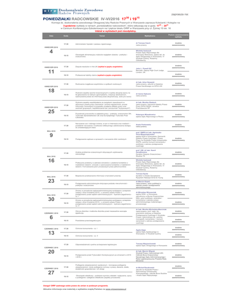 zaprasza na: PONIEDZIAŁKI RADCOWSKIE IV-VI/2016 17 30 i 19 15 Komisja ds. doskonalenia zawodowego Okręgowej Izby Radców Prawnych w Warszawie zaprasza Koleżanki i Kolegów na 3-godzinne wykłady w ramach „poniedziałków radcowskich”, które odbywają się w godz. 1730 - 2045 w Centrum Konferencyjno-Szkoleniowym na I piętrze lokalu OIRP w Warszawie przy ul. Żytniej 15 lok. 16 Udział w wykładach jest nieodpłatny. Data Godz. Temat Wykładowca Poziom zaawansowania wykładu 17.30 Administrator hipoteki i zastawu rejestrowego. dr Tomasz Czech radca prawny średnio zaawansowany 19.15 Obowiązek alimentacyjny rodziców względem dziecka - praktyka i orzecznictwo. Wioletta Iwańczuk Prezes Sądu Rejonowego dla Warszawy Mokotowa, sędzia del. do Sądu Okręgowego w Warszawie, VI Wydział Cywilny, Rodzinny Odwoławczy średnio zaawansowany 17.30 Dispute resolution in the UK (wykład w języku angielskim) KWIECIEŃ 2016 4 KWIECIEŃ 2016 John L. Powell QC Barrister, Deputy High Court Judge, London, UK 11 Professional liability claims (wykład w języku angielskim) 17.30 Rozliczenia majątkowe wspólników w spółkach osobowych dr hab. Artur Nowacki radca prawny, adiunkt w Katedrze Prawa Handlowego na WPiA UW średnio zaawansowany 19.15 Wybrane aspekty sporów korporacyjnych w spółce akcyjnej (spory na tle głosowania na walnym zgromadzeniu, instytucji absolutorium, wykonywania prawa do informacji przez akcjonariuszy, actio pro socio) dr Iwona Gębusia radca prawny średnio zaawansowany 17.30 Wybrane aspekty współdziałania ze związkami zawodowymi w zbiorowym prawie pracy (tworzenie i zmiana regulaminów, proces informacji i konsultacji w przypadku przejęcia zakładu pracy oraz zwolnień grupowych, współtworzenie tzw. porozumień "kryzysowych") dr hab. Monika Gładoch radca prawny, kierownik Katedry Prawa Pracy WPiA UKSW, doradca Pracodawców RP średnio zaawansowany 19.15 Prywatność pracownika w zakładzie pracy - praktyka, orzecznictwo SN, Trybunału Sprawiedliwości UE oraz Europejskiego Trybunału Praw Człowieka Katarzyna Mieszkowicz sędzia Sądu Rejonowego w Płocku średnio zaawansowany 17.30 Naruszenie czci i dobrego imienia, w tym w Internecie oraz mediach – przesłanki naruszenia i możliwości efektywnego zablokowania dostępu do zniesławiających treści Aneta Pankowska radca prawny średnio zaawansowany 19.15 Postępowanie sądowe w sprawach o naruszenie dóbr osobistych prof. SWPS dr hab. Agnieszka Góra-Błaszczykowska sędzia WSA w Warszawie, Kierownik Katedry Prawa Cywilnego i Prawa Pracy na Wydziale Prawa Uniwersytetu SWPS, autorka licznych komentarzy i publikacji z zakresu postępowania cywilnego średnio zaawansowany 17.30 Analiza problemów orzeczniczych dotyczących użytkowania wieczystego prof. UW, dr hab. Kamil Zaradkiewicz Dyrektor Zespołu Orzecznictwa i Studiów TK średnio zaawansowany 19.15 Praktyczne problemy w zakresie wniosków o ustalenie kontaktów z małoletnimi dziećmi, wniosek o wykonywanie kontaktów z małoletnimi dziećmi. Formułowanie pism procesowych przez pełnomocników Wioletta Iwańczuk Prezes Sądu Rejonowego dla Warszawy Mokotowa, sędzia del. do Sądu Okręgowego w Warszawie, VI Wydział Cywilny, Rodzinny Odwoławczy średnio zaawansowany 17.30 Bezpieczne przetwarzanie informacji w kancelarii prawnej Tomasz Dyrda Dyrektor w Dziale Zarządzania Ryzykiem Nadużyć Ernst & Young średnio zaawansowany 19.15 Postępowanie administracyjne dotyczące podziału nieruchomości praktyka i orzecznictwo dr Marcin Kopeć radca prawny, autor publikacji z zakresu prawa i postępowania administracyjnego średnio zaawansowany 17.30 Zmiany w procedurze sądowoadministracyjnej wynikające z przepisów ustawy z dnia 9 kwietnia 2015 r. o zmianie ustawy Prawo o postępowaniu przed sądami administracyjnymi - wybrane zagadnienia cz. I 19.15 Zmiany w procedurze sądowoadministracyjnej wynikające z przepisów ustawy z dnia 9 kwietnia 2015 r. o zmianie ustawy Prawo o postępowaniu przed sądami administracyjnymi - wybrane zagadnienia cz. II 17.30 Obrona dłużnika i małżonka dłużnika przed niezasadnie wszczęta egzekucją. 19.15 Powództwa przeciwegzekucyjne 17.30 Ochrona konsumenta - cz. I 19.15 Ochrona konsumenta - cz. II 17.30 Odpowiedzialność cywilna za bezprawie legislacyjne Tomasz Wojciechowski sędzia Sądu Okręgowego w Warszawie średnio zaawansowany 19.15 Postępowanie przed Trybunałem Konstytucyjnym po zmianach w 2015 i 2016 r. dr hab. Marcin Wiącek Wydział Prawa i Administracji UW; Członek Biura Orzecznictwa Naczelnego Sądu Administracyjnego i Rady Legislacyjnej przy Prezesie Rady Ministrów średnio zaawansowany 17.30 Podleganie ubezpieczeniom społecznym - koncepcja podlegania ubezpieczeniom, tytuły podlegania (umowy o pracę, zlecenie, dzieło, działalność gospodarcza) i ich zbiegi 19.15 Obowiązek składkowy - podstawa wymiaru składek i wyłączenia, spory o podleganie i zaległości składkowe (aspekty procesowe) 18 KWIECIEŃ 2016 25 MAJ 2016 9 MAJ 2016 16 23 MAJ 2016 30 CZERWIEC 2016 6 CZERWIEC 2016 13 średnio zaawansowany 19.15 KWIECIEŃ 2016 MAJ 2016 średnio zaawansowany dr Mirosław Wincenciak sędzia WSA w Warszawie, zatrudniony w Biurze Orzecznictwa NSA, autor publikacji, artykułów i komentarzy z zakresu prawa administracyjnego materialnego i procesowego dr hab. Monika Michalska-Marciniak radca prawny, prof. nadz. UŁ, pracownik naukowy w Katedrze Postępowania Cywilnego II Wydziału Prawa i Administracji UŁ; autorka monografii, komentarzy i licznych opracowań z zakresu postępowania cywilnego Agata Zając sędzia Sądu Apelacyjnego w Warszawie, VI Wydział Cywilny średnio zaawansowany średnio zaawansowany średnio zaawansowany średnio zaawansowany średnio zaawansowany średnio zaawansowany CZERWIEC 2016 20 CZERWIEC 2016 27 Uwaga! OIRP zastrzega sobie prawo do zmian w podanym programie. Aktualne informacje oraz materiały z wykładów znajdą Państwo na www.oirpwarszawa.pl dr Michał Raczkowski adi