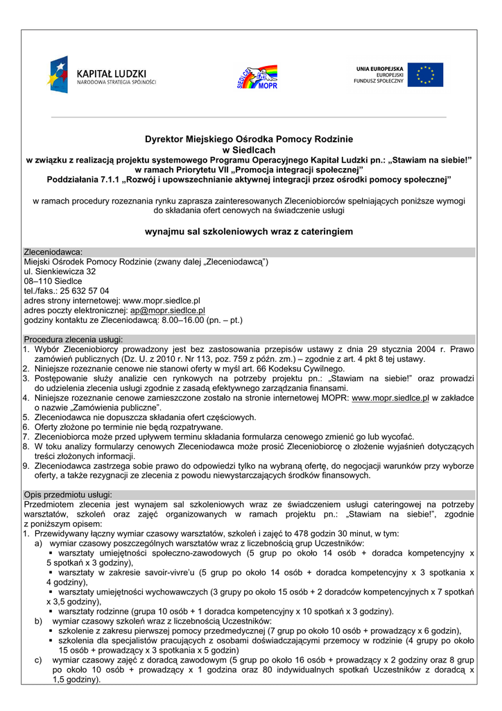 Dyrektor Miejskiego Ośrodka Pomocy Rodzinie w Siedlcach w związku z realizacją projektu systemowego Programu Operacyjnego Kapitał Ludzki pn.: „Stawiam na siebie!” w ramach Priorytetu VII „Promocja integracji społecznej” Poddziałania 7.1.1 „Rozwój i upowszechnianie aktywnej integracji przez ośrodki pomocy społecznej” w ramach procedury rozeznania rynku zaprasza zainteresowanych Zleceniobiorców spełniających poniższe wymogi do składania ofert cenowych na świadczenie usługi wynajmu sal szkoleniowych wraz z cateringiem Zleceniodawca: Miejski Ośrodek Pomocy Rodzinie (zwany dalej „Zleceniodawcą”) ul. Sienkiewicza 32 08–110 Siedlce tel./faks.: 25 632 57 04 adres strony internetowej: www.mopr.siedlce.pl adres poczty elektronicznej: [email protected] godziny kontaktu ze Zleceniodawcą: 8.00–16.00 (pn. – pt.) Procedura zlecenia usługi: 1. Wybór Zleceniobiorcy prowadzony jest bez zastosowania przepisów ustawy z dnia 29 stycznia 2004 r. Prawo zamówień publicznych (Dz. U. z 2010 r. Nr 113, poz. 759 z późn. zm.) – zgodnie z art. 4 pkt 8 tej ustawy. 2. Niniejsze rozeznanie cenowe nie stanowi oferty w myśl art. 66 Kodeksu Cywilnego. 3. Postępowanie służy analizie cen rynkowych na potrzeby projektu pn.: „Stawiam na siebie!” oraz prowadzi do udzielenia zlecenia usługi zgodnie z zasadą efektywnego zarządzania finansami. 4. Niniejsze rozeznanie cenowe zamieszczone zostało na stronie internetowej MOPR: www.mopr.siedlce.pl w zakładce o nazwie „Zamówienia publiczne”. 5. Zleceniodawca nie dopuszcza składania ofert częściowych. 6. Oferty złożone po terminie nie będą rozpatrywane. 7. Zleceniobiorca może przed upływem terminu składania formularza cenowego zmienić go lub wycofać. 8. W toku analizy formularzy cenowych Zleceniodawca może prosić Zleceniobiorcę o złożenie wyjaśnień dotyczących treści złożonych informacji. 9. Zleceniodawca zastrzega sobie prawo do odpowiedzi tylko na wybraną ofertę, do negocjacji warunków przy wyborze oferty, a także rezygnacji ze zlecenia z powodu niewystarczających środków finansowych. Opis przedmiotu usługi: Przedmiotem zlecenia jest wynajem sal szkoleniowych wraz ze świadczeniem usługi cateringowej na potrzeby warsztatów, szkoleń oraz zajęć organizowanych w ramach projektu pn.: „Stawiam na siebie!”, zgodnie z poniższym opisem: 1. Przewidywany łączny wymiar czasowy warsztatów, szkoleń i zajęć to 478 godzin 30 minut, w tym: a) wymiar czasowy poszczególnych warsztatów wraz z liczebnością grup Uczestników: warsztaty umiejętności społeczno-zawodowych (5 grup po około 14 osób + doradca kompetencyjny x 5 spotkań x 3 godziny), warsztaty w zakresie savoir-vivre’u (5 grup po około 14 osób + doradca kompetencyjny x 3 spotkania x 4 godziny), warsztaty umiejętności wychowawczych (3 grupy po około 15 osób + 2 doradców kompetencyjnych x 7 spotkań x 3,5 godziny), warsztaty rodzinne (grupa 10 osób + 1 doradca kompetencyjny x 10 spotkań x 3 godziny). b) wymiar czasowy szkoleń wraz z liczebnością Uczestników: szkolenie z zakresu pierwszej pomocy przedmedycznej (7 grup po około 10 osób + prowadzący x 6 godzin), szkolenia dla specjalistów pracujących z osobami doświadczającymi przemocy w rodzinie (4 grupy po około 15 osób + prowadzący x 3 spotkania x 5 godzin) c) wymiar czasowy zajęć z doradcą zawodowym (5 grup po około 16 osób + prowadzący x 2 godziny oraz 8 grup po około 10 osób + prowadzący x 1 godzina oraz 80 indywidualnych spotkań Uczestników z doradcą x 1,5 godziny). 2. Zlecenie obejmować będzie okres od II połowy sierpnia do maksymalnie połowy grudnia 2012 roku. 3. Harmonogramy poszczególnych zajęć zostaną określone przez Zleceniodawcę w porozumieniu ze Zleceniobiorcą niezwłocznie po ustaleniu terminów zajęć z osobami odpowiedzialnymi za ich prowadzenie (po wyłonieniu podmiotów prowadzących). 4. Usługa cateringowa obejmuje przygotowanie i obsługę serwisu kawowego podczas wszystkich spotkań każdej z grup w ramach warsztatów i szkoleń – łącznie przewidujemy maksymalnie 1225 jednostek cateringowych podczas przerw kawowych. 5. Usługa cateringowa w niniejszym zleceniu nie obejmuje zajęć z doradcą zawodowym, podczas których Zleceniodawca nie przewiduje przerw kawowych. 6. Liczba godzin najmu sali oraz liczba jednostek cateringowych może ulec zmianie. Warunku zlecenia usługi: 1. Budynek, w którym będą odbywać się warsztaty, szkolenia oraz inne zajęcia powinien być w pełni dostosowany do potrzeb osób niepełnosprawnych fizycznie i powinien być usytuowany w centrum Siedlec lub w innym miejscu o dogodnym dojeździe komunikacją miejską. 2. Zleceniodawca zastrzega sobie prawo przeprowadzenia wizytacji lokalu przed udzieleniem zlecenia. 3. Zleceniobiorca powinien posiadać ubezpieczenie od odpowiedzialności cywilnej za szkody powstałe na terenie obiektu, w którym będą odbywać się warsztaty, szkolenia oraz zajęcia. 4. Zleceniobiorca musi dysponować jednocześnie minimum dwoma odrębnymi salami szkoleniowymi do zajęć grupowych, salą do zajęć indywidualnych oraz osobnym pomieszczeniem na serwis kawowy. 5. Sale szkoleniowe do zajęć grupowych powinny spełniać następujące wymagania: sale powinny gwarantować optymalne warunki prowadzenia zajęć w grupach do 20 Uczestników, zgodnie z wymaganiami polskiego prawa, tj. spełniać odpowiednie warunki sanitarne, bezpieczeństwa i techniczne, powinny być też utrzymane w czystości, dla każdego Uczestnika powinno być przygotowane miejsce siedzące z blatem lub nadstawką do robienia notatek, miejsca siedzące powinny być ustawione teatralnie z możliwością swobodnego przesuwania w przypadku zainicjowania przez osobę prowadzącą pracy w grupach, czy w kręgu, w sali powinien znajdować się stół z miejscem siedzącym dla osoby prowadzącej, w salach powinno być zapewnione ogrzewanie w przypadku niskich temperatur zewnętrznych, tak 