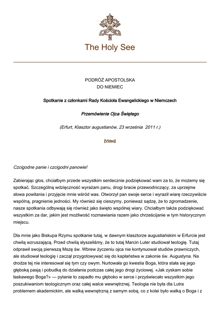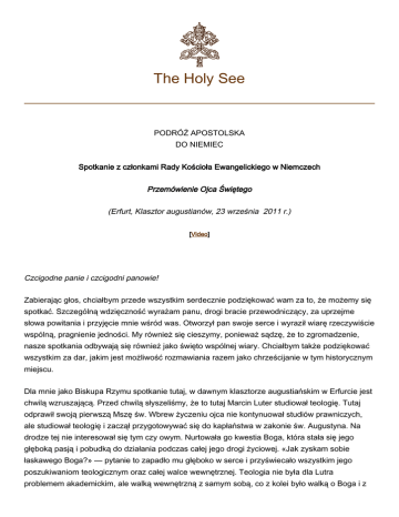 The Holy See PODRÓŻ APOSTOLSKA DO NIEMIEC Spotkanie z członkami Rady Kościoła Ewangelickiego w Niemczech Przemówienie Ojca Świętego (Erfurt, Klasztor augustianów, 23 września 2011 r.) [Video] Czcigodne panie i czcigodni panowie! Zabierając głos, chciałbym przede wszystkim serdecznie podziękować wam za to, że możemy się spotkać. Szczególną wdzięczność wyrażam panu, drogi bracie przewodniczący, za uprzejme słowa powitania i przyjęcie mnie wśród was. Otworzył pan swoje serce i wyraził wiarę rzeczywiście wspólną, pragnienie jedności. My również się cieszymy, ponieważ sądzę, że to zgromadzenie, nasze spotkania odbywają się również jako święto wspólnej wiary. Chciałbym także podziękować wszystkim za dar, jakim jest możliwość rozmawiania razem jako chrześcijanie w tym historycznym miejscu. Dla mnie jako Biskupa Rzymu spotkanie tutaj, w dawnym klasztorze augustiańskim w Erfurcie jest chwilą wzruszającą. Przed chwilą słyszeliśmy, że to tutaj Marcin Luter studiował teologię. Tutaj odprawił swoją pierwszą Mszę św. Wbrew życzeniu ojca nie kontynuował studiów prawniczych, ale studiował teologię i zaczął przygotowywać się do kapłaństwa w zakonie św. Augustyna. Na drodze tej nie interesował się tym czy owym. Nurtowała go kwestia Boga, która stała się jego głęboką pasją i pobudką do działania podczas całej jego drogi życiowej. «Jak zyskam sobie łaskawego Boga?» — pytanie to zapadło mu głęboko w serce i przyświecało wszystkim jego poszukiwaniom teologicznym oraz całej walce wewnętrznej. Teologia nie była dla Lutra problemem akademickim, ale walką wewnętrzną z samym sobą, co z kolei było walką o Boga i z 2 Bogiem. «Jak zyskam sobie łaskawego Boga?» Fakt, że to pytanie było siłą napędową całego jego życia, porusza mnie wciąż na nowo. Kogo to naprawdę dziś jeszcze obchodzi, nawet wśród chrześcijan? Jakie znaczenie ma kwestia Boga w naszym życiu i w naszym przepowiadaniu? Większość ludzi, także chrześcijan, sądzi, że Bóg w ostatecznym rozrachunku nie interesuje się naszymi grzechami i cnotami. Wie On oczywiście, że wszyscy jesteśmy tylko ciałem. Jeśli wierzy się jeszcze w inne życie i w sąd Boży, to prawie wszyscy zakładają w praktyce, że Bóg powinien być wspaniałomyślny i — ostatecznie — w swym miłosierdziu przymknie oko na nasze drobne błędy. Ta kwestia już nas nie nurtuje. Czy jednak te nasze błędy naprawdę są tak małe? Czyż świat nie ulega spustoszeniu z powodu zepsucia wielkich, ale także maluczkich, którzy myślą jedynie o własnej korzyści? Czyż nie jest może zniszczony z powodu władzy narkotyków, która żeruje, z jednej strony, na zachłanności życia i pieniądza, z drugiej zaś, na nieposkromionej żądzy użycia u osób, które im się oddają? Czyż nie jest zagrożony przez narastającą skłonność do przemocy, która nierzadko kryje się pod pozorami religijności? Czy głód i ubóstwo mogłyby aż tak spustoszyć całe części świata, gdyby żywsza była w nas miłość do Boga i wypływająca z niej także miłość do bliźniego, do stworzeń Bożych, jakimi są ludzie? Można by tak pytać dalej. Nie, zło nie jest błahostką. Nie mogłoby być tak potężne, gdybyśmy naprawdę stawiali Boga w centrum naszego życia. Pytanie: jakie jest stanowisko Boga wobec mnie i jak ja mam stawać przed Bogiem? — to palące pytanie Lutra na nowo i z pewnością w nowej postaci winno stać się również naszym pytaniem, nie akademickim, a konkretnym. Sądzę, że jest to pierwsze wezwanie, jakie powinniśmy usłyszeć, spotykając się z Marcinem Lutrem. Inną ważną rzeczą jest też, że Bóg, jedyny Bóg, Stwórca nieba i ziemi, nie jest zwykłą hipotezą filozoficzną na temat pochodzenia wszechświata. Ten Bóg ma oblicze i mówił do nas. Stał się jednym z nas w człowieku Jezusie Chrystusie — prawdziwym Bogu i zarazem prawdziwym człowieku. Myśl Lutra, cała jego duchowość była całkowicie chrystocentryczna. Kwestia: «To, co posuwa naprzód Chrystusa i Jego sprawę», była dla Lutra decydującym kryterium hermeneutycznym w odczytywaniu Pisma Świętego. Zakłada to jednak, że Chrystus stanowi centrum naszej duchowości i że miłość do Niego, życie razem z Nim nadaje kierunek naszemu życiu. Teraz prawdopodobnie można by powiedzieć: dobrze, ale co to ma wspólnego z naszą sytuacją ekumeniczną? Czy wszystko to nie jest próbą obejścia, za pomocą mnóstwa słów, pilnych spraw, w odniesieniu do których oczekujemy na praktyczne postępy i konkretne rezultaty? Odpowiadam na to, że ekumenizm najbardziej potrzebuje tego przede wszystkim, abyśmy pod presją sekularyzacji nie zagubili niemal przez nieuwagę wielkich rzeczy, które nas łączą, które sprawiają, że jesteśmy chrześcijanami, i które pozostały naszym darem i zadaniem. Było błędem okresu konfesjonalizacji, że patrzyliśmy głównie tylko na to, co nas dzieli, a nie udało nam się uchwycić w sposób egzystencjalny tego, co jest dla nas wspólne w wielkich wskazaniach Pisma Świętego i w wyznaniach wiary starożytnego chrześcijaństwa. Dla mnie wielkim postępem ekumenicznym 3 ostatnich dziesięcioleci jest to, że staliśmy się świadomi tego wspólnego podłoża i, razem modląc się i śpiewając, razem przedstawiając światu etos chrześcijański, wspólnie dając świadectwo o Bogu Jezusa Chrystusa na tym świecie, uznajemy je za nasz wspólny niezniszczalny fundament. Niebezpieczeństwo utracenia tego nie jest niestety nierealne. Chciałbym tu wskazać pokrótce na dwie rzeczy. W ostatnim czasie geografia chrześcijaństwa uległa głębokim zmianom i nadal się zmienia. Nowa forma chrześcijaństwa, która szerzy się z ogromnym dynamizmem misyjnym, niekiedy budzącym niepokój co do sposobów, wprawia historyczne Kościoły chrześcijańskie w zakłopotanie. Jest to chrześcijaństwo mało instytucjon