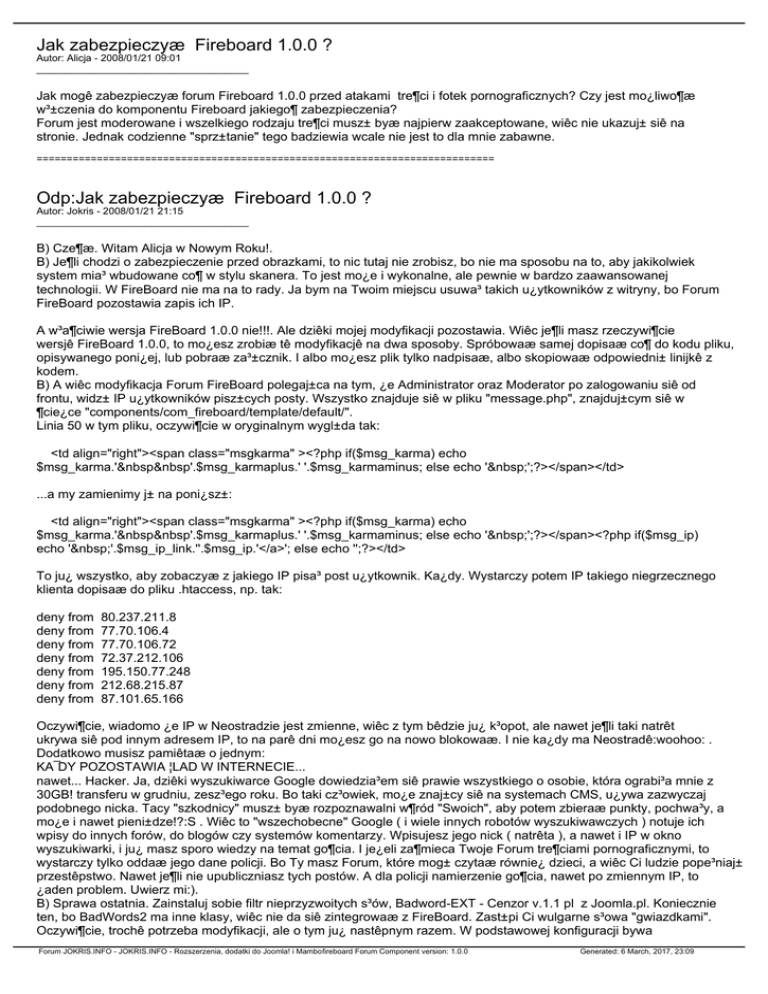 Jak zabezpieczyæ Fireboard 1.0.0 ? Autor: Alicja - 2008/01/21 09:01 _____________________________________ Jak mogê zabezpieczyæ forum Fireboard 1.0.0 przed atakami tre¶ci i fotek pornograficznych? Czy jest mo¿liwo¶æ w³±czenia do komponentu Fireboard jakiego¶ zabezpieczenia? Forum jest moderowane i wszelkiego rodzaju tre¶ci musz± byæ najpierw zaakceptowane, wiêc nie ukazuj± siê na stronie. Jednak codzienne "sprz±tanie" tego badziewia wcale nie jest to dla mnie zabawne. ============================================================================ Odp:Jak zabezpieczyæ Fireboard 1.0.0 ? Autor: Jokris - 2008/01/21 21:15 _____________________________________ B) Cze¶æ. Witam Alicja w Nowym Roku!. B) Je¶li chodzi o zabezpieczenie przed obrazkami, to nic tutaj nie zrobisz, bo nie ma sposobu na to, aby jakikolwiek system mia³ wbudowane co¶ w stylu skanera. To jest mo¿e i wykonalne, ale pewnie w bardzo zaawansowanej technologii. W FireBoard nie ma na to rady. Ja bym na Twoim miejscu usuwa³ takich u¿ytkowników z witryny, bo Forum FireBoard pozostawia zapis ich IP. A w³a¶ciwie wersja FireBoard 1.0.0 nie!!!. Ale dziêki mojej modyfikacji pozostawia. Wiêc je¶li masz rzeczywi¶cie wersjê FireBoard 1.0.0, to mo¿esz zrobiæ tê modyfikacjê na dwa sposoby. Spróbowaæ samej dopisaæ co¶ do kodu pliku, opisywanego poni¿ej, lub pobraæ za³±cznik. I albo mo¿esz plik tylko nadpisaæ, albo skopiowaæ odpowiedni± linijkê z kodem. B) A wiêc modyfikacja Forum FireBoard polegaj±ca na tym, ¿e Administrator oraz Moderator po zalogowaniu siê od frontu, widz± IP u¿ytkowników pisz±cych posty. Wszystko znajduje siê w pliku "message.php", znajduj±cym siê w ¶cie¿ce "components/com_fireboard/template/default/". Linia 50 w tym pliku, oczywi¶cie w oryginalnym wygl±da tak: <td align="right"><span class="msgkarma" ><?php if($msg_karma) echo $msg_karma.'  '.$msg_karmaplus.' '.$msg_karmaminus; else echo ' ';?></span></td> ...a my zamienimy j± na poni¿sz±: <td align="right"><span class="msgkarma" ><?php if($msg_karma) echo $msg_karma.'  '.$msg_karmaplus.' '.$msg_karmaminus; else echo ' ';?></span><?php if($msg_ip) echo ' '.$msg_ip_link.''.$msg_ip.'</a>'; else echo '';?></td> To ju¿ wszystko, aby zobaczyæ z jakiego IP pisa³ post u¿ytkownik. Ka¿dy. Wystarczy potem IP takiego niegrzecznego klienta dopisaæ do pliku .htaccess, np. tak: deny from deny from deny from deny from deny from deny from deny from 80.237.211.8 77.70.106.4 77.70.106.72 72.37.212.106 195.150.77.248 212.68.215.87 87.101.65.166 Oczywi¶cie, wiadomo ¿e IP w Neostradzie jest zmienne, wiêc z tym bêdzie ju¿ k³opot, ale nawet je¶li taki natrêt ukrywa siê pod innym adresem IP, to na parê dni mo¿esz go na nowo blokowaæ. I nie ka¿dy ma Neostradê:woohoo: . Dodatkowo musisz pamiêtaæ o jednym: KA¯DY POZOSTAWIA ¦LAD W INTERNECIE... nawet... Hacker. Ja, dziêki wyszukiwarce Google dowiedzia³em siê prawie wszystkiego o osobie, która ograbi³a mnie z 30GB! transferu w grudniu, zesz³ego roku. Bo taki cz³owiek, mo¿e znaj±cy siê na systemach CMS, u¿ywa zazwyczaj podobnego nicka. Tacy "szkodnicy" musz± byæ rozpoznawalni w¶ród "Swoich", aby potem zbieraæ punkty, pochwa³y, a mo¿e i nawet pieni±dze!?:S . Wiêc to "wszechobecne" Google ( i wiele innych robotów wyszukiwawczych ) notuje ich wpisy do innych forów, do blogów czy systemów komentarzy. Wpisujesz jego nick ( natrêta ), a nawet i IP w okno wyszukiwarki, i ju¿ masz sporo wiedzy na temat go¶cia. I je¿eli za¶mieca Twoje Forum tre¶ciami pornograficznymi, to wystarczy tylko oddaæ jego dane policji. Bo Ty masz Forum, które mog± czytaæ równie¿ dzieci, a wiêc Ci ludzie pope³niaj± przestêpstwo. Nawet je¶li nie upubliczniasz tych postów. A dla policji namierzenie go¶cia, nawet po zmiennym IP, to ¿aden problem. Uwierz mi:). B) Sprawa ostatnia. Zainstaluj sobie filtr nieprzyzwoitych s³ów, Badword-EXT - Cenzor v.1.1 pl z Joomla.pl. Koniecznie ten, bo BadWords2 ma inne klasy, wiêc nie da siê zintegrowaæ z FireBoard. Zast±pi Ci wulgarne s³owa "gwiazdkami". Oczywi¶cie, trochê potrzeba modyfikacji, ale o tym ju¿ nastêpnym razem. W podstawowej konfiguracji bywa Forum JOKRIS.INFO - JOKRIS.INFO - Rozszerzenia, dodatki do Joomla! i Mambofireboard Forum Component version: 1.0.0 Generated: 6 March, 2017, 23:09 wystarczaj±cy. B) To chyba tyle. Pozdrawiam. Jokris. http://www.jokris.info/components/com_fireboard/uploaded/files/message_php.zip ============================================================================ Odp:Jak zabezpieczyæ Fireboard 1.0.0 ? Autor: Alicja - 2008/01/23 21:29 _____________________________________ Wszystko dzia³a:) . £atwiej to zawsze znale¼æ IP bezpo¶rednio z frontu, ani¿eli pchaæ siê do tabel PHP Admina:P Szukanie w internecie go¶cia o nazwie Niccaforuzlmb nie sprawia k³opotu, tyle, ze to chyba jaki¶ robocik:unsure: , czy co¶ w tym rodzaju. Pozdrawiam ============================================================================ Forum JOKRIS.INFO - JOKRIS.INFO - Rozszerzenia, dodatki do Joomla! i Mambofireboard Forum Component version: 1.0.0 Generated: 6 March, 2017, 23:09