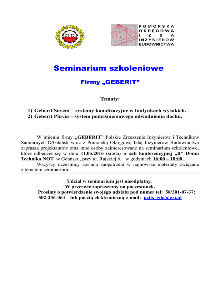 Seminarium szkoleniowe Firmy „GEBERIT” Tematy: 1) Geberit Sovent – systemy kanalizacyjne w budynkach wysokich. 2) Geberit Pluvia – system podciśnieniowego odwodnienia dachu. W imieniu firmy „GEBERIT” Polskie Zrzeszenie Inżynierów i Techników Sanitarnych O/Gdańsk wraz z Pomorską Okręgową Izbą Inżynierów Budownictwa zaprasza projektantów oraz inne osoby zainteresowane na seminarium szkoleniowe, które odbędzie się w dniu 11.05.2016 (środa) w sali konferencyjnej „B” Domu Technika NOT w Gdańsku, przy ul. Rajskiej 6, w godzinach 16:00 – 18:00. Wszyscy uczestnicy zostaną zaopatrzeni w najnowsze materiały związane z tematem seminarium. Udział w seminarium jest nieodpłatny. W przerwie zapraszamy na poczęstunek. Prosimy o potwierdzenie swojego udziału pod numer tel: 58/301-07-37; 502-236-064 lub pocztą elektroniczną e-mail: [email protected]