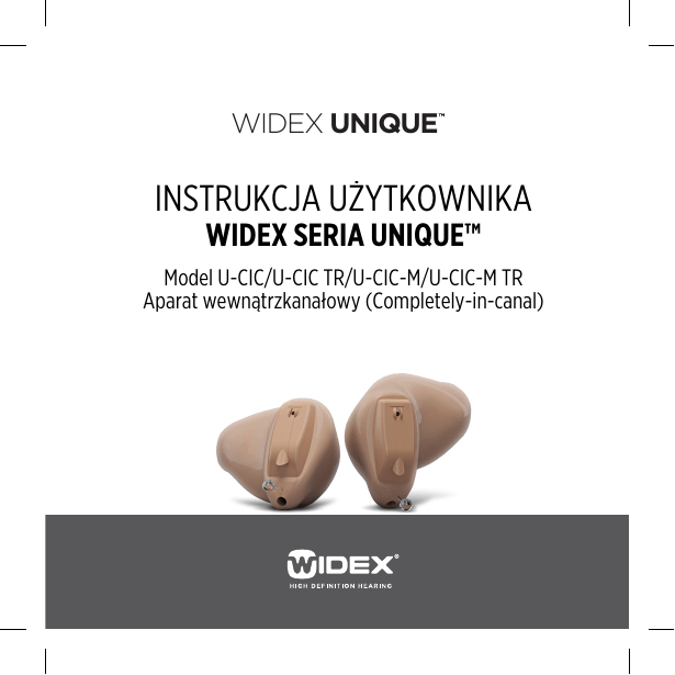 WIDEX UNIQUE INSTRUKCJA UŻYTKOWNIKA WIDEX SERIA UNIQUE™ Model U-CIC/U-CIC TR/U-CIC-M/U-CIC-M TR Aparat wewnątrzkanałowy (Completely-in-canal) APARAT SŁUCHOWY WIDEX® (Wypełnia specjalista serwisowy aparatów słuchowych) Przewód Krótki wentylacyjny: Pełna długość Brak CIC CIC-M Seria aparatu słuchowego: 2 PROGRAM Uniwersalny Rozszerzenie słyszalności Cisza Rozszerzenie słyszalności Transport Rozszerzenie słyszalności Miejski Rozszerzenie słyszalności Przyjęcie Rozszerzenie słyszalności Muzyka Rozszerzenie słyszalności PROGRAMY SPECJALNE Zen Rozszerzenie słyszalności Telefon Rozszerzenie słyszalności Zen+ Rozszerzenie słyszalności 3 UWAGA Model CIC-M nie jest bezprzewodowym aparatem słuchowym, co oznacza, że te aparaty słuchowe nie mogą się komunikować ze sobą ani z innymi urządzeniami. Z tego względu nie ma możliwości regulacji głośności i pozostaje jeden program słuchania. 4 SPIS TREŚCI APARAT SŁUCHOWY WIDEX.................................................................. 7 Dziękujemy za wybór aparatu firmy Widex.................................................7 Ważne Informacje dotyczące bezpieczeństwa............................................9 APARAT SŁUCHOWY.............................................................................14 Wskazania do stosowania.............................................................................14 Przeznaczenie................................................................................................. 15 Bateria..............................................................................................................15 Sygnały dźwiękowe....................................................................................... 21 Jak odróżnić aparat słuchowy do prawego i lewego ucha...................... 23 Włączanie i wyłączanie aparatu słuchowego............................................24 Umieszczanie aparatu w uchu i wyjmowanie aparatu z ucha................. 26 Regulacja głośności....................................................................................... 32 Programy........................................................................................................ 35 CZYSZCZENIE....................................................................................... 39 Narzędzia........................................................................................................39 Czyszczenie aparatu słuchowego............................................................... 40 5 Osłona przeciwwoskowinowa.....................................................................46 AKCESORIA.......................................................................................... 52 ROZWIĄZYWANIE PROBLEMÓW......................................................... 54 INFORMACJE PRAWNE........................................................................ 64 Dyrektywy WE...............................................................................................64 Przepisy FCC, IC ............................................................................................ 66 SYMBOLE..............................................................................................72 6 APARAT SŁUCHOWY WIDEX Dziękujemy za wybór aparatu firmy Widex Gratulujemy zakupu nowego aparatu słuchowego. Aparatu słuchowego należy używać regularnie, nawet jeśli przyzwyczajenie się do niego zajmie trochę czasu. Użytkownicy, którzy nie używają regularnie aparatu słuchowego, nie uzyskują pełnych korzyści związanych z jego stosowaniem. UWAGA Aparat słuchowy i akcesoria mogą różnić się wyglądem od pokazanych w niniejszej instrukcji. Producent zastrzega sobie prawo wprowadzania dalszych zmian, jeśli okażą się one konieczne. 7 Aparat słuchowy pod lupą 1. 2. 3. 4. 5. Otwór mikrofonu Pokrywa pojemnika na baterię (funkcja On/Off) Zaczep ułatwiający otwieranie Wylot dźwiękowodu Osłona przeciwwoskowinowa firmy Widex 8 6. Żyłka ułatwiająca wyjmowanie aparatu z kanału słuchowego 7. Przewód wentylacyjny (krótki) 8. Przewód wentylacyjny (długi) Ważne Informacje dotyczące bezpieczeństwa Przed użyciem aparatu słuchowego przeczytaj uważnie tę instrukcję. 9 Aparaty słuchowe i ich baterie mogą stwarzać zagrożenie w przypadku połknięcia lub nieprawidłowej eksploatacji. Połknięcie lub nieprawidłowe użytkowanie może spowodować poważne obrażenia ciała, a nawet śmierć. W przypadku połknięcia natychmiast skontaktuj się z lekarzem. Wyjmuj aparat z ucha, jeśli go nie używasz. Pomoże to przewietrzyć zewnętrzny przewód słuchowy i zapobiec infekcjom. Jeśli podejrzewasz u siebie infekcję ucha, natychmiast skontaktuj się ze swoim lekarzem lub specjalistą leczenia chorób słuchu. Zdejmuj aparat słuchowy przed wejściem pod prysznic, pływaniem lub suszeniem włosów suszarką. Nie noś aparatu słuchowego podczas nakładania perfum, kosmetyków w aerozolu, żeli, balsamów lub kremów. 10 Nie susz aparatu słuchowego w kuchence mikrofalowej, ponieważ spowoduje to jego zniszczenie. Nie używaj aparatów słuchowych innych osób i nie pożyczaj ich aparatów, ponieważ może to doprowadzić do uszkodzenia słuchu. Nie używaj aparatu słuchowego w miejscach potencjalnego występowania gazów wybuchowych, np. w kopalniach itp. Chroń aparaty słuchowe, ich części, akcesoria oraz baterie przed dziećmi. Nigdy nie należy samodzielnie otwierać lub naprawiać aparatu słuchowego. Jeśli aparat słuchowy wymaga naprawy, należy się skontaktować ze specjalistą leczenia chorób słuchu. 11 Aparat słuchowy korzysta z technologii łączności radiowej. Zawsze zwracaj uwagę na otoczenie, w którym go używasz. Jeśli obowiązują tam jakiekolwiek ograniczenia, musisz podjąć działania umożliwiające ich przestrzeganie. Nie narażaj aparatu słuchowego na działanie wysokiej temperatury lub nadmiernej wilgotności. 