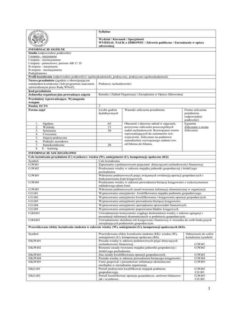 Syllabus Wydział / Kierunek / Specjalność WYDZIAŁ NAUK o ZDROWIU / Zdrowie publiczne / Zarzadzanie w opiece zdrowotnej INFORMACJE OGÓLNE Studia (odpowiednie podkreślić) I stopnia - stacjonarne I stopnia - niestacjonarne I stopnia - pomostowe: poziom AB/ C/ D II stopnia - stacjonarne II stopnia - niestacjonarne Podyplomowe Profil kształcenia (odpowiednie podkreślić): ogólnoakademicki, praktyczny, praktyczno-ogólnoakademicki Nazwa przedmiotu (zgodnie z obowiązującym standardem kształcenia i/lub programem nauczania Podstawy rachunkowości zatwierdzonym przez Radę WNoZ). Kod przedmiotu Katedra i Zakład Organizacji i Zarządzania w Opiece Zdrowotnej Jednostka organizacyjna prowadząca zajęcia Przedmioty wprowadzające. Wymagania wstępne Punkty ECTS Forma zajęć 1. 2. 3. 4. 5. 6. 7. 8. Ogółem Wykłady Seminaria Ćwiczenia Zajęcia praktyczne Praktyki zawodowe Samokształcenie E – learning 2 Liczba godzin dydaktycznych 65 15 30 20 Warunki zaliczenia przedmiotu Obecność i aktywny udział w zajęciach, pozytywne zaliczenie poszczególnych zadań rachunkowych. Rozwiązanie testów wprowadzających do seminariów tzw. wejściówki. Zaliczenie na podstawie samodzielnie rozwiązanego zadania tzw. od bilansu do bilansu. Forma zaliczenia przedmiotu (odpowiednie podkreślić) Egzamin Zaliczenie z oceną Zaliczenie INFORMACJE SZCZEGÓŁOWE Cele kształcenia przedmiotu (C) wynikowe: wiedza (W), umiejętności (U), kompetencje społeczne (KS) Symbol Cele kształcenia C(W)01 Zapoznanie z podstawowymi pojęciami dotyczącymi rachunkowości finansowej. C(W)02 Przekazanie wiedzy w zakresie majątku jednostki gospodarczej i źródeł jego pochodzenia. C(W)03 Wdrożenie podstawowych pojęć związanych ewidencją operacji gospodarczych i funkcjonowania kont księgowych. C(W)04 Przekazanie wiedzy w zakresie prowadzenia bieżącej księgowości z wykorzystaniem zakładowego planu kont. C(W)05 Wdrożenie podstawowych zasad tworzenia informacji ekonomicznej w organizacji. C(U)01 Wypracowanie umiejętności kwalifikowania majątku podmiotu gospodarczego. C(U)02 Wypracowanie umiejętności kwalifikowania i księgowania operacji gospodarczych. C(U)03 Wypracowania umiejętności prowadzenia bieżącej księgowości. C(U)04 Wypracowania umiejętności sporządzania sprawozdań finansowych. C(U)05 Wypracowania umiejętności poprawiania błędów księgowych. C(KS)01 Uświadomienie konieczności ciągłego doskonalenia wiedzy z zakresu agregacji i prezentacji informacji ekonomicznych w podmiocie gospodarczym. C(KS)02 Uświadomienie służebnej roli księgowości finansowej w stosunku do osób funkcyjnych zarządzających podmiotem gospodarczym. Przewidywane efekty kształcenia studenta w zakresie wiedzy (W), umiejętności (U), kompetencji społecznych (KS). Symbol EK(W)01 EK(W)02 EK(W)03 EK(W)04 EK(W)05 EK(U)01 EK(U)02 Przewidywane efekty kształcenia studenta (EK): wiedza (W), umiejętności (U), kompetencje społeczne (KS). Posiada wiedzę w zakresie podstawowych pojęć dotyczących rachunkowości finansowej. Rozumie zasady tworzenia majątku jednostki gospodarczej i źródeł jego pochodzenia. Zna zasady kwalifikowania operacji gospodarczych. Posiada wiedzę w zakresie prowadzenia bieżącego księgowości. Umie grupować i prezentować informacje ekonomiczne niezbędne w zarzadzaniu organizacją Potrafi praktycznie kwalifikować majątek podmiotu gospodarczego. Potrafi kwalifikować operacje gospodarcze, zarówno bilansowe jak i wynikowe. Odniesienie do celów kształcenia (symbol) C(W)01 C(W)02 C(W)03 C(W)04 C(W)05 C(W)02 C(U)01 C(W)03 C(U)02 1 Potrafi prowadzić bieżącą księgowość. C(U)03 Potrafi sporządzać i interpretować sprawozdania finansowe. C(U)04 Potrafi poprawiać błędy księgowe. C(U)05 Rozumie potrzebę ciągłego zgłębiania wiedzy w zakresie C(KS)01 tworzenia informacji ekonomicznej w podmiocie gospodarczym. EK(KS)02 Potrafi efektywnie współpracować w zespole zadaniowym w C(KS)02 zakresie przygotowywania informacji ekonomicznej. Treści programowe (TP): opis przedmiotu wynikający z obowiązującego standardu kształcenia i/lub programu nauczania zatwierdzonego przez Radę WNoZ Symbol Forma realizacji treści kształcenia: np. wykład, seminaria, Odniesienie do ćwiczenia, zajęcia praktyczne, praktyki zawodowe, efektów kształcenia samokształcenie, E- learning (symbol) TP1- Istota i zakres rachunkowości Wykład EK(W)01 TP2 – Zasady prowadzenia rachunkowości Wykład EK(W)01 EK(U)03 TP3 – Majątek jednostki gospodarczej i źródła Wykład EK(W)02 jego pochodzenia EK(U)01 TP4 – Operacje gospodarcze i ich wpływ na bilans Wykład EK(W)03, EK(W)04 jednostki gospodarczej EK(U)02 TP5 – Funkcjonowanie kont księgowych Wykład EK(W)04 EK(U)03 TP6 – Kwalifikacja majątku podmiotu Seminarium EK(W)02 gospodarczego EK(U)01 TP7 – Bilans i jego składniki Seminarium EK(W)02 EK(U)01 TP8 – Rachunek zysków i strat Seminarium EK(W)02 EK(U)02 TP9 – Kwalifikowanie zdarzeń i operacji Seminarium EK(W)03 gospodarczych EK(U)02 TP10 – Ewidencjonowanie operacji Seminarium EK(W)03 gospodarczych EK(U)02 TP11 – Kwalifikowanie operacji do księgowania Seminarium EK(U)02 TP12 – Korespondencja kont Seminarium EK(W)04 EK(U)03 TP13 – Otwieranie, księgowanie i zamykanie kont Seminarium EK(W)04 EK(U)03 TP14 – Sporządzanie zestawienia obrotów i sald Seminarium EK(W)05 EK(U)04 TP15 – Poprawianie błędów księgowych Seminarium EK(U)05 Metody dydaktyczne (sposób pracy nauczyciela, Zarówno wykłady jak i seminaria należy prowadzić z zastosowaniem technik umożliwiający osiągnięcie celów kształcenia) konwersatoryjnych. Praca indywidualna i w małych zespołach. Rzutnik multimedialny lub rzutnik folii. Środki dydaktyczne wykorzystywane w procesie kształcenia Wykaz piśmiennictwa dla studenta T. Kiziukiewicz – Rachunkowość – zasady prowadzenia według znowelizowanej ustawy Piśmiennictwo podstawowe do 4 pozycji o rachunkowości, Wydawnictwo Ekspert,