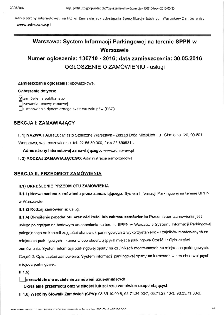 usluga polegajEca na testowym uruchomieniu na terenie SPPN w Warszawie Systemu lnformacji Parkingowej