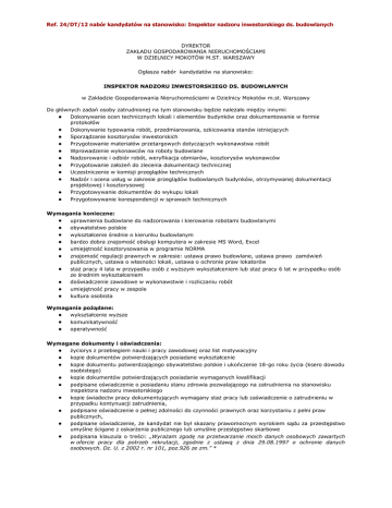 Ref. 24/DT/12 nabór kandydatów na stanowisko: Inspektor nadzoru inwestorskiego ds. budowlanych DYREKTOR ZAKŁADU GOSPODAROWANIA NIERUCHOMOŚCIAMI W DZIELNICY MOKOTÓW M.ST. WARSZAWY Ogłasza nabór kandydatów na stanowisko: INSPEKTOR NADZORU INWESTORSKIEGO DS. BUDOWLANYCH w Zakładzie Gospodarowania Nieruchomościami w Dzielnicy Mokotów m.st. Warszawy Do głównych zadań osoby zatrudnionej na tym stanowisku będzie należało między innymi: Dokonywanie ocen technicznych lokali i elementów budynków oraz dokumentowanie w formie protokołów Dokonywanie typowania robót, przedmiarowania, szkicowania stanów istniejących Sporządzanie kosztorysów inwestorskich Przygotowanie materiałów przetargowych dotyczących wykonawstwa robót Wprowadzenie wykonawców na roboty budowlane Nadzorowanie i odbiór robót, weryfikacja obmiarów, kosztorysów wykonawców Przygotowanie założeń do zlecenia dokumentacji technicznej Uczestniczenie w komisji przeglądów technicznych Nadzór i ocena usług w zakresie przeglądów budowlanych budynków, otrzymywanej dokumentacji projektowej i kosztorysowej Przygotowywanie dokumentów do wykupu lokali Przygotowywanie korespondencji w sprawach technicznych Wymagania konieczne: uprawnienia budowlane do nadzorowania i kierowania robotami budowlanymi obywatelstwo polskie wykształcenie średnie o kierunku budowlanym bardzo dobra znajomość obsługi komputera w zakresie MS Word, Excel umiejętność kosztorysowania w programie NORMA znajomość regulacji prawnych w zakresie: ustawa prawo budowlane, ustawa prawo zamówień publicznych, ustawa o własności lokali, ustawa o ochronie praw lokatorów staż pracy 4 lata w przypadku osób z wyższym wykształceniem lub staż pracy 6 lat w przypadku osób ze średnim wykształceniem doświadczenie zawodowe w wykonawstwie i rozliczaniu robót umiejętność pracy w zespole kultura osobista Wymagania pożądane: wykształcenie wyższe komunikatywność operatywność Wymagane dokumenty i oświadczenia: życiorys z przebiegiem nauki i pracy zawodowej oraz list motywacyjny kopie dokumentów potwierdzających posiadane wykształcenie kopie dokumentu potwierdzającego obywatelstwo polskie i ukończenie 18-go roku życia (ksero dowodu osobistego) kopie dokumentów potwierdzających posiadanie wymaganych kwalifikacji podpisane oświadczenie o posiadaniu stanu zdrowia pozwalającego na zatrudnienia na stanowisku inspektora nadzoru inwestorskiego kopie świadectw pracy dokumentujących wymagany staż pracy lub zaświadczenie o zatrudnieniu w przypadku kontynuacji zatrudnienia, podpisane oświadczenie o pełnej zdolności do czynności prawnych oraz korzystaniu z pełni praw publicznych, podpisane oświadczenie, że kandydat nie był skazany prawomocnym wyrokiem sądu za przestępstwo umyślne ścigane z oskarżenia publicznego lub umyślne przestępstwo skarbowe podpisana klauzula o treści: „Wyrażam zgodę na przetwarzanie moich danych osobowych zawartych w ofercie pracy dla potrzeb rekrutacji, zgodnie z ustawą z dnia 29.08.1997 o ochronie danych osobowych. Dz. U. z 2002 r. nr 101, poz.926 ze zm.” * Ref. 24/DT/12 nabór kandydatów na stanowisko: Inspektor nadzoru inwestorskiego ds. budowlanych Osoby zainteresowane prosimy o złożenie kompletu dokumentów, w terminie 14 dni od daty ukazania się ogłoszenia (od dnia 20.06.2012 r.), w zamkniętej kopercie w Sekretariacie pod adresem: Zakład Gospodarowania Nieruchomościami w Dzielnicy Mokotów m.st. Warszawy 02-660 Warszawa ul. Irysowa 19 z dopiskiem: Dział Spraw Pracowniczych – Inspektor nadzoru inwestorskiego ds. budowlanych nr ref. 24/DT/12 Nadesłanych ofert nie zwracamy. Oferty odrzucone zostaną komisyjnie zniszczone. Dokumenty uważa się za dostarczone w terminie, jeżeli wpłynęły na w/w adres w terminie do dnia 04.07.2012r.