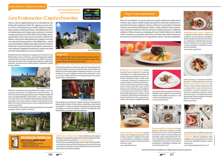Jeden Dzień ze „Śląskimi Smakami” www.jura.slaskie.travel www.slaskiesmaki.pl Tego musisz spróbować! Jura Krakowsko-Częstochowska Wiosna i lato to najpiękniejsza pora na odwiedzienie Jury Krakowsko-Częstochowskiej. Ten ciągnący się przez około 130 km od Częstochowy po Kraków obszar, to miejsce pełne atrakcji, unikalnego klimatu, niezwykłej fauny i flory, z charakterystycznymi wapiennymi ostańcami, na którym rozciąga się historyczny Szlak Orlich Gniazd. Mając do dyspozycji dzień wolny, warto zajrzeć do zamku w Bobolicach, jednej z nielicznych odbudowanych jurajskich warowni, we wnętrzach którego spotkać można Białą Damę – ducha ukochanej Boboli, zabitej przez jego brata Mira. Wyżyna Krakowsko-Częstochowska kusi pamiątkami prehistorycznych wydarzeń, sięgających pradawnych czasów jury, przez rycerskie średniowiecze, po czasy nam bliższe. Nieopodal zamku w Bobolicach znajdują się romantyczne ruiny bliźniaczego zamku w Mirowie, nota bene będącego niegdyś wspólną własnością braci bliźniaków Mira i Boboli. Łącząca je trasa spacerowa pozwala na podziwianie pięknych wapiennych ostańców, porozrzucanych wokół zamków i unikalnych na skalę Europy widoków. Aby móc powiedzieć, że się poznało Jurę, trzeba spróbować tradycyjnych smaków tego miejsca. Dzięki swojej różnorodności etnicznej i kulturowej regionalna kuchnia jest wyjątkowo ciekawa i kolorowa. To prawdziwa mieszanka smaków dawnej Galicji, Wielkopolski, Śląska, a także wpływów kultury żydowskiej. Zadowoleni będą tak miłośnicy dziczyzny i drobiu, jak jarosze i wielbiciele słodkości. Wybrane potrawy znajdujących się na Szlaku Kulinarnym „Śląskie Smaki” restauracji, są specjalnie oznaczone w kartach menu. Warto spróbować tych potraw, bo gwarantuje to ich oryginalność i jakość. Oto kilka przykładów. Zamek w Bobolicach Legenda: Bracia bliźniacy Mir i Bobol wybudowali pomiędzy zamkami w Mirowie i Bobolicach tajemne przejście, gdzie ukryli skarby, których do dziś nikt nie znalazł... Chcąc poznać region nie można nie zajrzeć do Kryształowej Huty, czyli Huty Szkła w Zawierciu, która jest także częścią Szlaku Zabytków Techniki Województwa Śląskiego. Można tu „na żywo” przekonać się, jak wygląda tworzenie kryształowych cacek, a w muzeum cofnąć się do historii kryształowego kunsztu, podziwiając wzory z minionych lat. Zamek ogrodzieniecki Położony nieopodal zamek ogrodzieniecki znajduje się na najwyższym wzniesieniu Jury Krakowsko-Częstochowskiej – na Górze Zamkowej. Ruiny gotyckiego zamku należały niegdyś do rodu rycerskiego Włodków Sulimczyków. Jak w każdym zamku, tak i tutaj straszy duch kasztelana krakowskiego Stanisława Warszyckiego, a po zmroku można tu spotkać Czarnego Psa z Ogrodzieńca. W ruinach zamku kręcono sceny ze słynnych filmów „Janosik” oraz „Zemsta”. Dla miłośników historii dobrą propozycją spędzenia czasu będzie podążanie śladami Żydów w Żarkach. Kirkut w Żarkach Huta Szkła w Zawierciu tak, aby jej skórka pozostała chrupiąca. Delikatne purée koperkowe przełamuje słodko-kwaśne jabłko serwowane w sosie na bazie warzonego tu piwa. www.czenstochovia.pl Królik duszony w śmietanie z białymi kluskami i modrą kapustą serwowany w Hotel Villa Verde w Zawierciu. Delikatne mięso królika podawane jest w znakomitym sosie śmietanowym powstałym w wyniku duszenia w warzywach z dodatkiem śmietany. Całość serwowana jest z charakterystycznymi dla Górnego Śląska dodatkami: kluskami śląskimi i modrą kapustą. www.villaverde.pl Zajazd Hetman w Kroczycach poleca żurek z Jury. Przygotowywany jest na naturalnym zakwasie z kiełbasą i ziemniakami. Przyrządzany z dodatkiem maślanki, dzięki czemu zyskuje charakterystyczny kremowy smak. www.zajazdhetman.pl Restauracja EM w Koziegłowach przypomina o dawnych, trudnych czasach, kiedy kuchnia, choć smaczna, była biedna. Daniem, które te czasy przybliża, jest zalewajka. Typowa dla północnych terenów województwa śląskiego zalewajka to rodzaj delikatnego żurku z ziemniakami, tu podawana z dodatkiem białego sera. www.restauracja-em.pl Złoty Potok Coś dla łasuchów słodkości polecamy w Restauracji pod Ratuszem w Częstochowie. Mleczko migdałowe, lekki, wyjątkowy deser przygotowany na bazie ucieranych migdałów podany z sosem owocowym. www.restauracjapodratuszem.eu Artykuł powstał we współpracy ze Śląską Organizacją Turystyczną 67 ARTYKUŁ SPONSOROWANY W Browarze Czestochovia należy zamówić kawior żydowski. To potrawa wywodząca się z tradycji żydowskiej. Ma postać pasty przyrządzonej z gęsich wątróbek z dodatkiem jajka, masła, cebuli i szczypiorku. Podawana z wypiekanym na miejscu chlebem smakuje wyśmienicie. Z kuchni żydowskiej wychodzi się także danie: marynowany filet z gęsi z purée koperkowym, flambirowanym jabłkiem w aromatycznym sosie piwnym. Gęsina była bardzo popularnym mięsem wśród mniejszości żydowskiej zamieszkujących kiedyś Częstochowę. Pierś z gęsi jest specjalnie marynowana, a następnie pieczona Dla szukających wytchnienia i relaksu świetnym rozwiązaniem będzie wizyta w Złotym Potoku, jednej z najbardziej malowniczych wsi polskich. Tu można zaczerpnąć świeżego powietrza spacerując lub jeżdżąc na rowerze po jednej z wielu tras otaczających pałac Raczyńskich, staw Irydion i kościół parafialny. Szlak Kulinarny „Śląskie Smaki” tworzy 29 restauracji serwujących dania kuchni regionalnej przygotowane według tradycyjnych receptur. Więcej informacji na stronie www.slaskiesmaki.pl. Pobierz darmową aplikację Śląskie Smaki, dzięki której bez problemu trafisz do restauracji Szlaku Kulinarnego, otrzymasz informacje o promocjach i skorzystasz z ponad 500 przepisów na dania kuchni regionalnej województwa śląskiego. 66 Smażalnia Pod Lasem w Sygontce k. Złotego Potoku oprócz urokliwych widoków, serwuje piero