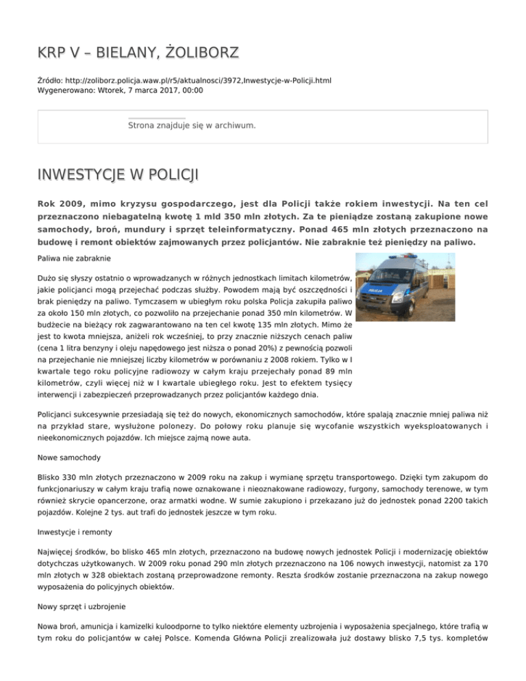 KRP V – BIELANY, ŻOLIBORZ Źródło: http://zoliborz.policja.waw.pl/r5/aktualnosci/3972,Inwestycje-w-Policji.html Wygenerowano: Wtorek, 7 marca 2017, 00:00 Strona znajduje się w archiwum. INWESTYCJE W POLICJI Rok 2009, mimo kryzysu gospodarczego, jest dla Policji także rokiem inwestycji. Na ten cel przeznaczono niebagatelną kwotę 1 mld 350 mln złotych. Za te pieniądze zostaną zakupione nowe samochody, broń, mundury i sprzęt teleinformatyczny. Ponad 465 mln złotych przeznaczono na budowę i remont obiektów zajmowanych przez policjantów. Nie zabraknie też pieniędzy na paliwo. Paliwa nie zabraknie Dużo się słyszy ostatnio o wprowadzanych w różnych jednostkach limitach kilometrów, jakie policjanci mogą przejechać podczas służby. Powodem mają być oszczędności i brak pieniędzy na paliwo. Tymczasem w ubiegłym roku polska Policja zakupiła paliwo za około 150 mln złotych, co pozwoliło na przejechanie ponad 350 mln kilometrów. W budżecie na bieżący rok zagwarantowano na ten cel kwotę 135 mln złotych. Mimo że jest to kwota mniejsza, aniżeli rok wcześniej, to przy znacznie niższych cenach paliw (cena 1 litra benzyny i oleju napędowego jest niższa o ponad 20%) z pewnością pozwoli na przejechanie nie mniejszej liczby kilometrów w porównaniu z 2008 rokiem. Tylko w I kwartale tego roku policyjne radiowozy w całym kraju przejechały ponad 89 mln kilometrów, czyli więcej niż w I kwartale ubiegłego roku. Jest to efektem tysięcy interwencji i zabezpieczeń przeprowadzanych przez policjantów każdego dnia. Policjanci sukcesywnie przesiadają się też do nowych, ekonomicznych samochodów, które spalają znacznie mniej paliwa niż na przykład stare, wysłużone polonezy. Do połowy roku planuje się wycofanie wszystkich wyeksploatowanych i nieekonomicznych pojazdów. Ich miejsce zajmą nowe auta. Nowe samochody Blisko 330 mln złotych przeznaczono w 2009 roku na zakup i wymianę sprzętu transportowego. Dzięki tym zakupom do funkcjonariuszy w całym kraju trafią nowe oznakowane i nieoznakowane radiowozy, furgony, samochody terenowe, w tym również skrycie opancerzone, oraz armatki wodne. W sumie zakupiono i przekazano już do jednostek ponad 2200 takich pojazdów. Kolejne 2 tys. aut trafi do jednostek jeszcze w tym roku. Inwestycje i remonty Najwięcej środków, bo blisko 465 mln złotych, przeznaczono na budowę nowych jednostek Policji i modernizację obiektów dotychczas użytkowanych. W 2009 roku ponad 290 mln złotych przeznaczono na 106 nowych inwestycji, natomist za 170 mln złotych w 328 obiektach zostaną przeprowadzone remonty. Reszta środków zostanie przeznaczona na zakup nowego wyposażenia do policyjnych obiektów. Nowy sprzęt i uzbrojenie Nowa broń, amunicja i kamizelki kuloodporne to tylko niektóre elementy uzbrojenia i wyposażenia specjalnego, które trafią w tym roku do policjantów w całej Polsce. Komenda Główna Policji zrealizowała już dostawy blisko 7,5 tys. kompletów pistoletów P-99, prawie 1,5 tys. kamizelek kuloodpornych na mundur i 1,4 tys. kamizelek kuloodpornych kamuflowanych. Ogółem prawie 70% policjantów ma nowoczesną broń ( Glock i Walther P-99). Podwyżki W 2009 roku Policja otrzymała 438 573 tys. zł na wzrost uposażeń funkcjonariuszy, co pozwoliło na podwyżki w wysokości około 282 zł (brutto) w przeliczeniu na każdego policjanta, z wyrównaniem od 1 stycznia 2009 r. Kwota podwyżki dla konkretnego funkcjonariusza zależała m.in. od stażu służby, grupy zaszeregowania, a także od opinii przełożonego, na podstawie której podejmowane były decyzje o przyznaniu uznaniowego dodatku służbowego. Nowe mundury Rok 2009 jest rokiem rozpoczęcia przemundurowania funkcjonariuszy polskiej Policji. wykorzystano materiały KGP Ocena: 0/5 (0) Tweetnij