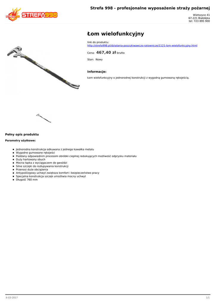 Strefa 998 - profesjonalne wyposażenie straży pożarnej Wietszyce 41 67-221 Białołęka tel: 723 895 900 Łom wielofunkcyjny link do produktu: http://strefa998.pl/dzialania-poszukiwawczo-ratownicze/1121-lom-wielofunkcyjny.html Cena: 467,40 zł brutto Stan: Nowy Informacje: Łom wielofunkcyjny o jednorodnej konstrukcji z wygodną gumowaną rękojeścią. Pełny opis produktu Parametry użytkowe: Jednorodna konstrukcja odkuwana z jednego kawałka metalu Wygodne gumowane rękojeści Poddany odpowiednim procesom obróbki cieplnej redukujących możliwość odprysku materiału Duży hartowany obuch Mocna łapka z wyciągaczem do gwoździ Silne szczęki do rozłupywania konstrukcji Przenosi duże obciążenia Antypoślizgowy uchwyt zwiększa komfort i bezpieczeństwo pracy Specjalna konstrukcja szczęk umożliwia mocny uchwyt Długość 760 mm 6-03-2017 1/1