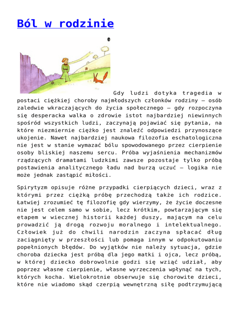 Ból w rodzinie Gdy ludzi dotyka tragedia w postaci ciężkiej choroby najmłodszych członków rodziny – osób zaledwie wkraczających do życia społecznego – gdy rozpoczyna się desperacka walka o zdrowie istot najbardziej niewinnych spośród wszystkich ludzi, zaczynają pojawiać się pytania, na które niezmiernie ciężko jest znaleźć odpowiedzi przynoszące ukojenie. Nawet najbardziej naukowa filozofia eschatologiczna nie jest w stanie wymazać bólu spowodowanego przez cierpienie osoby bliskiej naszemu sercu. Próba wyjaśnienia mechanizmów rządzących dramatami ludzkimi zawsze pozostaje tylko próbą postawienia analitycznego ładu nad burzą uczuć – logika nie może jednak zastąpić miłości. Spirytyzm opisuje różne przypadki cierpiących dzieci, wraz z którymi przez ciężką próbę przechodzą także ich rodzice. Łatwiej zrozumieć tę filozofię gdy wierzymy, że życie doczesne nie jest celem samo w sobie, lecz krótkim, powtarzającym się etapem w wiecznej historii każdej duszy, mającym na celu prowadzić ją drogą rozwoju moralnego i intelektualnego. Człowiek już do chwili narodzin zaczyna spłacać dług zaciągnięty w przeszłości lub pomaga innym w odpokutowaniu popełnionych błędów. Do wyjątków nie należy sytuacja, gdzie choroba dziecka jest próbą dla jego matki i ojca, lecz próbą, w której dziecko dobrowolnie godzi się wziąć udział, aby poprzez własne cierpienie, własne wyrzeczenia wpłynąć na tych, których kocha. Wielokrotnie obserwuje się chorowite dzieci, które nie wiadomo skąd czerpią wewnętrzną siłę podtrzymującą na duchu ich rodziców mimo bólu obecnego w codziennym życiu. Takie małe, drobne istotki nie rzadko znoszą własne cierpienie w sposób bardziej dojrzały, niż nie jeden dorosły, dobrze zbudowany człowiek. Tego rodzaju zachowanie nie można tłumaczyć tylko nieświadomością sytuacji, ponieważ dzieci nie są pozbawione rozumu i szybko orientują się, gdy rodzina ma jakieś zmartwienie. Ci mali ludzie często posiadają duchową siłę, której nie powstydziliby się nawet najbardziej znani światu religijni męczennicy; często ich duchowość stoi na znacznie wyższym poziomie, niż duchowość rodziców; często życie doczesne cierpiących najmłodszych ma na celu poświęcenie się swoim rodzicom tak, jak rodzice im się poświęcają. Wszystko to nie zmienia faktu, że choroba i cierpienie drugiego człowieka, bez znaczenia, czy dziecka, czy dorosłego, zawsze jest wielką próbą dla wszystkich ludzi świadomych zaistniałej sytuacji, lecz tylko ukierunkują swoją wolną wolę. od nich zależy jak Polskie Towarzystwo Studiów Spirytystycznych przyłączyło się do akcji, którą aktualnie żyją mieszkańcy Oświęcimia: www.igorbartosz.blogspot.com