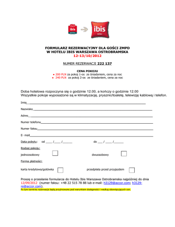 FORMULARZ REZERWACYJNY DLA GOŚCI ZMPD W HOTELU IBIS WARSZAWA OSTROBRAMSKA 12-13/10/2012 NUMER REZERWACJI 222 137 CENA POKOJU ● 200 PLN za pokoj 1-os ze śniadaniem, cena za noc ● 240 PLN za pokoj 2-os ze śniadaniem, cena za noc Doba hotelowa rozpoczyna się o godzinie 12.00, a kończy o godzinie 12.00 Wszystkie pokoje wyposażone są w klimatyzację, prysznic/toaletę, telewizję kablową i telefon. Imię________________________________________________________________ Nazwisko________________________________________________________________ Adres___________________________________________________________________ Numer telefonu____________________________________________________________ Numer faksu______________________________________________________________ E- mail__________________________________________________________________ Data pobytu: od ____ /____ /______ do ___ / ____ /______ Rodzaj pokoju: jednoosobowy dwuosobowy Forma płatności: karta kredytowa/gotówka przedpłata przed przyjazdem Proszę o przesłanie formularza do Hotelu Ibis Warszawa Ostrobramska najpóźniej do dnia 12/09/2012 (numer faksu: +48 22 515 78 88 lub e-mail: [email protected]; [email protected]). Po tym terminie rezerwacje będą przyjmowane pod warunkiem dostępności i według obowiązujących cen.