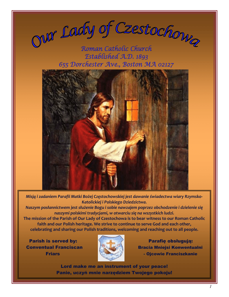 Misją i zadaniem Parafii Matki Bożej Częstochowskiej jest dawanie świadectwa wiary RzymskoKatolickiej i Polskiego Dziedzictwa. Naszym posłannictwem jest służenie Bogu i sobie nawzajem poprzez obchodzenie i dzielenie się naszymi polskimi tradycjami, w otwarciu się na wszystkich ludzi. The mission of the Parish of Our Lady of Czestochowa is to bear witness to our Roman Catholic faith and our Polish heritage. We strive to continue to serve God and each other, celebrating and sharing our Polish traditions, welcoming and reaching out to all people. Parish is served by: Conventual Franciscan Friars Parafię obsługują: Bracia Mniejsi Konwentualni - Ojcowie Franciszkanie Lord make me an instrument of your peace! Panie, uczyń mnie narzędziem Twojego pokoju! 1 Established A.D. 1893 655 Dorchester Ave., Boston, MA 02127 www.ourladyofczestochowa.com E-Mail: [email protected] Tel: 617-268-4355; Fax: 617-268-4599 MASS SCHEDULE / PORZĄDEK MSZY ŚWIĘTYCH Mon. - Thurs. 7:00 AM (English) 8:00 AM (Polish) Friday 6:00 PM - 7:00 PM - Adoration - Koronka - Divine Mercy Chaplet / Confession 7.00 PM - (Polish) (First Friday - Mass for Homeland) Saturday 8:00 AM (Polish) 4:00 PM (English) 7:00 PM (Polish) Sunday 8:00 AM (Polish) 9:30 AM (English) 11:00 AM (Polish) Holydays as announced CONFESSIONS / SPOWIEDŹ Every day 30 min. before Masses. BAPTISM / CHRZEST By arrangement with the priest. Instruction for parents and godparents is required. MARRIAGE / SAKRAMENT MAŁŻEŃSTWA Please, make arrangement with the Rectory at least six months in advance. Instruction is required. SACRAMENT OF THE SICK / SAKRAMENT CHORYCH Parishioners who are seriously ill should call the Rectory to arrange for a priest to visit and administer the Sacraments. PARISH OFFICE / BIURO PARAFIALNE Tel: 617-268-4355; Fax: 617-268-4599 Monday - Thursday Saturday 10.00 AM - 4:00 PM 10:00 AM - 12:00 PM Friday: 8:00 AM - 1:00 PM Evenings and weekends - by appointment only. PASTORAL STAFF - FRANCISCAN FRIARS OJCOWIE FRANCISZKANIE (OFM CONV.) Fr. Wiesław Ciemięga OFM Conv. - Administrator Fr. Janusz Chmielecki OFM Conv. - In Residence OFFICE STAFF / PRACOWNICY PARAFII Secretary & Religious Coordinator - Mrs. Iwona Gajczak Bookkeeper & Office Assistant - Ms. Connie Bielawski PARISH COUNCIL / RADA PARAFIALNA Mr. Richard Rolak Mrs. Lucy Willis Mr. Andrzej Prończuk Ms. Maryann Sadowski Ms. Celina Warot FINANCE COUNCIL / RADA FINANSOWA Ms. Connie Bielawski Mr. Andrew Lau Mr. Leon Bester Mr. Mariusz Wierzbicki MUSIC MINISTRY / SŁUŻBA MUZYCZNA Organist & Psalmist: Mrs. Marta Saletnik SACRISTAN / ZAKRYSTIANKA Sr. Donata Farbaniec, OLM ACTIVITIES & ORGANIZATIONS 2 John Paul II Hall — Sala bł. Jana Pawła II Kontakt do spraw wynajmu sali: Tel: 617-268-4355 Contact for renting the hall: Tel: 617-268-4355 Ministranci / Altar Servers ~ Eugeniusz Bramowski Spotkania w niedziele, sala J.P II,10.00 AM. (781-871-2991) Polish Cultural Foundation, Inc. ~ Mr. Andrzej Pronczuk Tel. 617-859-9910 Polish Saturday School ~ Mr. Jan Kozak - Tel. 617-464-2485 Parish Choir & Children’s Choir ~ Mrs. Marta Saletnik Tel. 617-265-8132 Stowarzyszenie Weteranów Armii Polskiej - SWAP Mr. Wincenty Wiktorowski ~ Tel. 617-288-1649 Grupa AA ~ Sala pod kościołem. Spotkania odbywają się w każdy czwartek o godz. 7:00 PM Krakowiak - Wednesdays at 7:30 PM - John Paul II hall www.krakowiak.org,: Eric Pierce: Tel. 508-320-2344 Rosary Society ~ Mrs. Genowefa Lisek: Tel. 617-436-5779 Sisters of Our Lady of Mercy: Tel. 617-288-1202 Polish Theater ~ Mrs. Małgorzata Tutko: Tel. 617-325-2208 Polish Scouts - The meetings will be conducted in Polish for young boys and girls. Contact information: Mateusz Wozny, Tel. 347-749-5867, email: [email protected] Polish American Citizen Club - Mr. Zdzisław Marecki Club: 617-436-2786; Cell: 781-267-0912 MASS INTENTIONS - INTENCJE MSZALNE 19th Sunday of Ordinary Time Scout troop camped often and the leaders would put our young skills to the test. They would create situations that required us to act—someone was injured, we were lost or we had to find things that were edible in the woods. It helped us develop our abilities to deal with a crisis and, in theory and in practice, made the motto of the Scouts real: “Be prepared”! Jesus does not want his followers to live in fear, but rather to live in vigilance and preparation. At any moment, faith can be challenged and temptation can be found. Persecution would be commonplace and many will struggle to preach the Gospel. The only preparation is the practice of prayer and of virtue, keeping our spiritual skills sharp and ourselves open to the grace of God. But we need not fear. It is not something we do alone. We do it as His Body, His Church. The Lord is always with us. Every day presents opportunities to practice faith, to give witness to our beliefs by our words and deeds. Our daily conversations, our kindness to others, the good example we set and our willingness to be mindful of God, help sharpen our spiritual skills and support others who struggle with temptation. Opportunities for grace outnumber opportunities for sin. We just have to be prepared! Scripture for the week of August 11, 2013 11 SUN 12 13 14 15 Mon Tue Wed Thu 16 Fri 17 Sat 18 SUN Wis 18:6-9/ Heb 11:1-2, 8-19 or 11:1-2, 8-12/ Lk 12:32-48 or 12:35-40 Dt 10:12-22/ Mt 17:22-27 Dt 31:1-8/Mt 18:1-5, 10, 12-14 Dt 34:1-12/ Mt 18:15-20 Rv 11:19a; 12:1-6a, 10ab/1 Cor 15:20-27/ Lk 1:39-56 31 Jos 24:1-13/ Mt 19:3-12 Jos 24:14-29/ Mt 19:13-15 Jer 38:4-6, 8-10/ Heb 12:1-4/ Lk 12:49-53 Saturday, August 10, 2013 8:00 AM + Marek Chojnowski, int. Mama i siostra z rodziną 4:00 PM + Leokadia Daniszewska (anniv.), int. Daughter 7:00 PM + Andrzej Stręciwilk, int. Sławomir Maziarz z żoną Sunday, August 11, 2013 8:00 AM + Zbigniew Dłużniewski, int. Znajomy 9:30 AM + Irena Daśko, int. Nowicki & Lizotte Families 11:00 AM - Święto Żołnierza Polskiego, int. Weterani Pl.#37 - Za Parafian-In the intention of Parishioners Monday, Au
