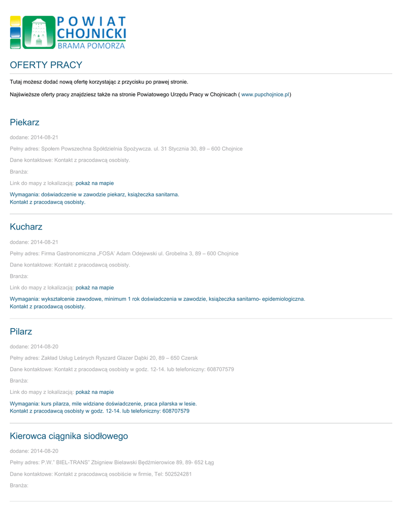 OFERTY PRACY Tutaj możesz dodać nową ofertę korzystając z przycisku po prawej stronie. Najświeższe oferty pracy znajdziesz także na stronie Powiatowego Urzędu Pracy w Chojnicach ( www.pupchojnice.pl) Piekarz dodane: 2014-08-21 Pełny adres: Społem Powszechna Spółdzielnia Spożywcza. ul. 31 Stycznia 30, 89 – 600 Chojnice Dane kontaktowe: Kontakt z pracodawcą osobisty. Branża: Link do mapy z lokalizacją: pokaż na mapie Wymagania: doświadczenie w zawodzie piekarz, książeczka sanitarna. Kontakt z pracodawcą osobisty. Kucharz dodane: 2014-08-21 Pełny adres: Firma Gastronomiczna „FOSA’ Adam Odejewski ul. Grobelna 3, 89 – 600 Chojnice Dane kontaktowe: Kontakt z pracodawcą osobisty. Branża: Link do mapy z lokalizacją: pokaż na mapie Wymagania: wykształcenie zawodowe, minimum 1 rok doświadczenia w zawodzie, książeczka sanitarno- epidemiologiczna. Kontakt z pracodawcą osobisty. Pilarz dodane: 2014-08-20 Pełny adres: Zakład Usług Leśnych Ryszard Glazer Dąbki 20, 89 – 650 Czersk Dane kontaktowe: Kontakt z pracodawcą osobisty w godz. 12-14. lub telefoniczny: 608707579 Branża: Link do mapy z lokalizacją: pokaż na mapie Wymagania: kurs pilarza, mile widziane doświadczenie, praca pilarska w lesie. Kontakt z pracodawcą osobisty w godz. 12-14. lub telefoniczny: 608707579 Kierowca ciągnika siodłowego dodane: 2014-08-20 Pełny adres: P.W.” BIEL-TRANS” Zbigniew Bielawski Będźmierowice 89, 89- 652 Łąg Dane kontaktowe: Kontakt z pracodawcą osobiście w firmie, Tel: 502524281 Branża: Link do mapy z lokalizacją: pokaż na mapie Wymagania: mile widziana praktyka zawodowa, prawo jazdy kat. C+E, kwalifikacje na przewóz rzeczy, uprawnienia ADR. Kontakt z pracodawcą osobiście w firmie, Tel: 502524281 Sprzedawca dodane: 2014-08-20 Pełny adres: Powiatowy Urząd Pracy w Chojnicach ul. Lichnowska 5 Dane kontaktowe: Robert Milkowski 52 3950 704 [email protected] Branża: Link do mapy z lokalizacją: pokaż na mapie Wymagania: wykształcenie średnie, mile widziane doświadczenie. Robert Milkowski 52 3950 704 [email protected] Pracownik Ochrony dodane: 2014-08-20 Pełny adres: GARDA SP. Z O.O. ul. Plac Kaszubski 15/3, 81-350 Gdynia Dane kontaktowe: Kontakt z pracodawca telefoniczny; Tel: 601150611 lub e- mail: [email protected] Branża: Link do mapy z lokalizacją: pokaż na mapie Wymagania: wykształcenie średnie, mile widziane doświadczenie w ochronie obiektów handlowych, zaświadczenie o niekaralności. Kontakt z pracodawca telefoniczny; Tel: 601150611 lub e- mail: [email protected] Sprzedawca dodane: 2014-08-20 Pełny adres: Centrum Motoryzacyjne „MOTO ZYCH” Stanisław Zych ul. Al. Brzozowa 40A, 89-600 Chojnice Dane kontaktowe: Kontakt z pracodawca telefoniczny; Tel: 504598103 lub e- mail: [email protected] Branża: Link do mapy z lokalizacją: pokaż na mapie Wymagania: wykształcenie średnie, mile widziane doświadczenie zawodowe w jakiejkolwiek branży motoryzacyjnej, prawo jazdy kat. B Kontakt z pracodawca telefoniczny; Tel: 504598103 lub e- mail: [email protected] Doradca Klienta dodane: 2014-08-20 Pełny adres: EVEREST FINANSE Sp. z o.o. Sp. K. ul. Stary Rynek 88, 61 – 772 Poznañ Dane kontaktowe: Kontakt z pracodawcą e- mail: [email protected] (CV i List Motywacyjny). Branża: Link do mapy z lokalizacją: pokaż na mapie Wymagania: wykształcenie niepełne wyższe, komunikatywność, zdolność nawiązywania kontaktów, zaangażowanie, mile widziane doświadczenie zawodowe. Kontakt z pracodawcą e- mail: [email protected] (CV i List Motywacyjny). Doradca Klienta dodane: 2014-08-19 Pełny adres: EVEREST FINANSE Sp. z o.o. Sp. K. ul. Stary Rynek 88, 61 – 772 Poznañ Dane kontaktowe: Kontakt z pracodawcą e- mail: [email protected] (CV i List Motywacyjny). Branża: Link do mapy z lokalizacją: pokaż na mapie Wymagania: wykształcenie niepełne wyższe, komunikatywność, zdolność nawiązywania kontaktów, zaangażowanie, mile widziane doświadczenie zawodowe. Kontakt z pracodawcą e- mail: [email protected] (CV i List Motywacyjny). Zaopatrzeniowiec dodane: 2014-08-19 Pełny adres: CMT Chojnice Sp. z o.o. ul. Zakładowa 6, 89-600 Chojnice Dane kontaktowe: Kontakt z pracodawca osobisty . Branża: Link do mapy z lokalizacją: pokaż na mapie Wymagania: wykształcenie średnie, prawo jazdy kat. B, znajomość obsługi komputera. Kontakt z pracodawca osobisty . Kucharz dodane: 2014-08-18 Pełny adres: DAG- BUD Jerzy Kisiel ul. Niemcewicza 22, 76 – 270 Ustka Dane kontaktowe: Kontakt z pracodawcą telefoniczny: Tel. 601951538 Branża: Link do mapy z lokalizacją: pokaż na mapie Wymagania: praktyka w zawodzie, wykształcenie brak lub niepełne podstawowe. Kontakt z pracodawcą telefoniczny: Tel. 601951538 Stolarz dodane: 2014-08-18 Pełny adres: USŁUGI ARTYSTYCZNE W DREWNIE- RENOWACJE Pestka Leszek, Józef Złotowo, ul. Złotowska 2B 89-650 Czersk Dane kontaktowe: kontakt telefonicznie lub osobiście tel. 608 427 510 Branża: Link do mapy z lokalizacją: pokaż na mapie Wymagania: wykształcenie zawodowe, obsługa maszyn stolarskich, , mile widziana znajomość języków obcych. Ogólny zakres obowiązow: Praca na maszynach i prace ręczne, obsługa maszyn stolarskich. kontakt telefonicznie lub osobiście tel. 608 427 510 Kierowca dodane: 2014-08-18 Pełny adres: Usługi Transportowe Bogusław Tusk ul. Przemysłowa 27, 83- 400 Kościerzyna Dane kontaktowe: Tel. 603133830 Branża: Link do mapy z lokalizacją: pokaż na mapie Wymagania: prawo jazdy kat. C+E Tel. 603133830 Referent ds. księgowych dodane: 2014-08-18 Pełny adres: ZPMB inż. Kazimierz Ginter ul. Kolejowa 4, 89-600 Chojnice Dane kontaktowe: Kontakt z pracodawca e- mail; [email protected] (CV+zdjęcie) Branża: Referent ds. księgowych Link do mapy z lokalizacją: pokaż na mapie Wymagania: wykształcenie średnie lub wyższe, minimum 2 lata doświadczenia zawodowego Kontakt z pracodawca e- mail; [email protected] (CV+zdjęcie) Doradca Klienta dodane: 2014-08-14 Pełny adres: