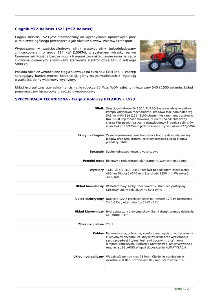 Ciągnik MTZ Belarus 1523 [MTZ Belarus] Ciągnik Belarus 1523 jest przeznaczony do wykonywania uprawowych prac w rolnictwie ogólnego przeznacznia jak również siewów, zbiorów i transportu. Wyposażony w sześciocylindrowy silnik wysokoprężny turbodoładowany z intercoolerem o mocy 114 kW (155KM), z systemem wtrysku paliwa Common rail. Posiada bardzo mocny trzypunktowy układ zawieszenia narzędzi z dwoma pionowymi siłownikami sterowany elektronicznie EHR o udźwigu 5800 kg. Posiada również wzmocnione cięgła siłownika na euro haki CBM kat. III, zaczep sprzęgający bardzo mocnej konstrukcji, górny na prowadnicach z regulacją wysokości, dolny widełkowy wychykny. Układ hydrauliczny trzy sekcyjny, ciśnienie robocze 20 Mpa. WOM zależny i niezależny 540 i 1000 obr/min. Układ pneumatyczny hamulcowy przyczep dwuobwodowy. SPECYFIKACJA TECHNICZNA - Ciągnik Rolniczy BELARUS – 1523 Silnik Sześciocylindrowy D- 260.1 TURBO Systemu wtrysku paliwa: Pompa wtryskowa mechaniczna, rzędowa Moc nominalna wg SAE kw (KM) 114 (155) 2100 obr/min Max moment obrotowy: Nm 596,8 Pojemność skokowa 7120cm3 Silnik chłodzony cieczą Filtr powietrza suchy dwuwkładowy Średnica cylindrów /skok tłoka 110/125mm Jednostkowe zużycie paliwa 227g/kWh Skrzynia biegów Zsynchronizowana, mechaniczna z boczną dźwignią zmiany biegów oraz reduktorem, czterozakresowa.Liczba biegów przód/ tył 16/8 Sprzęgło Suche jednostopniowe, dwutarczowe Przedni most Belkowy z reduktorami planetarnymi, wzmocnienie ramy. Wymiary 1610- 2150/ 1600-2440 Prześwit pod układem zawieszenia 465mm Długość 4640 mm Szerokość 2350 mm Wysokość 3060 mm Układ hamulcowy Wielotarczowy suchy, mechaniczny. Hamulec postojowy, tarczowy suchy działający na koła tylne Układ elektryczny Napięcie 12V z przełącznikiem na rozruch 12/24V Rozrusznik 24V- 6 Kw , Alternator 1,40 kW – 14V Układ kierowniczy Hydrostatyczny z dwoma siłownikami dwustronnego działania na „ORBITROL” Zbiorniki paliwa 250 l Kabina Panoramiczna, ochronna, komfortowa, wyciszona, ogrzewana z uchylnymi szybami, ze spryskiwaczem oraz wycieraczką szyby przedniej i tylnej, lustrami bocznymi, z ośmioma lampami roboczymi. Siedzenie Komfortowe, amortyzowane z regulacją , BELARUS.W opcji doposażenia KLIMATYZACJA. Układ hydrauliczny Wydajność pompy mas 78 l/min Ciśnienie nominalne w układzie 200 Bar, Rozdzielacz 80l/ min, sterowanie EHR strona 1 / 2 Ogumienie Przód: 420/70R24 Tył: 520/70R38 Obciążniki przód 450 kg. Tylny podnośnik TUZ Trzy punktowy układ zawieszenia narzędzi z dwoma siłownikami C-90 sterowanie podnośnikiem EHR Maksymalny udźwig podnośnika w osi cięgieł 5800kg Zaczepy Zaczep przedni widełkowy. Górny zaczep transportowy widełkowy z możliwością regulacji wysokości. Zaczep dolny widełkowy z możliwością regulacji wysokości Masa 5900 kg, bez obciążników i paliwa. Kolor CZERWONY GRAND-AGRO Sp. z o.o. ul. Ogrodowa 4 16-020 Czarna Białostocka Magazyn Części Zamiennych i Skład Maszyn: ul. Fabryczna 7 16-020 Czarna Białostocka Godziny pracy : Poniedziałek - Piątek : od 8:00 do 16:00 Sobota - Niedziela : ZAMKNIĘTE Części Zamienne: tel. +48 85 733 67 71 tel. +48 85 733 67 72 mob. +48 511 408 862 e-mail: [email protected] e-mail: [email protected] Ciągniki i Maszyny: tel. +48 85 733 67 74 mob. +48 518 315 555 mob. +48 511 408 404 e-mail: [email protected] Księgowość: tel. +48 85 733 67 73 fax. +48 85 733 67 75 e-mail: [email protected] NIP: 9662088642, REGON: 200787519 KRS: 0000464552 w Sądzie Rejonowym w Białymstoku XII Wydział Gospodarczy więcej informacji: http://www.grand-agro.com.pl/ciagnik-mtz-belarus-1523.html strona 2 / 2 Powered by TCPDF (www.tcpdf.org)