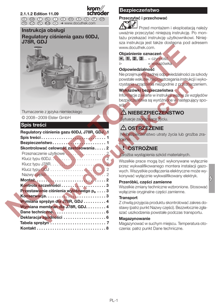 Bezpieczeństwo 2.1.1.2 Edition 11.09 NL I PL RUS H E DK S N P Przeczytać i przechować GR ➔ www.docuthek.com Przed montażem i eksploatacją należy uważnie przeczytać niniejszą instrukcję. Po montażu przekazać instrukcję użytkownikowi. Niniejsza instrukcja jest także dostępna pod adresem www.docuthek.com. Objaśnienie oznaczeń • , , , ...= czynność ▷ = wskazówka Odpowiedzialność Nie przejmujemy żadnej odpowiedzialności za szkody powstałe wskutek nieprzestrzegania instrukcji i wykorzystania urządzenia niezgodnie z przeznaczeniem. Wskazówki bezpieczeństwa Informacje zawarte w instrukcji ważne ze względów bezpieczeństwa są wyróżnione w następujący sposób: Instrukcja obsługi Regulatory ciśnienia gazu 60DJ, J78R, GDJ Tłumaczenie z języka niemieckiego © 2008 – 2009 Elster GmbH NIEBEZPIECZEŃSTWO Sytuacje zagrażające życiu. Spis treści OSTRZEŻENIE Regulatory ciśnienia gazu 60DJ, J78R, GDJ . 1 Spis treści . . . . . . . . . . . . . . . . . . . . . . . . . . . . . 1 Bezpieczeństwo . . . . . . . . . . . . . . . . . . . . . . . . 1 Skontrolować celowość zastosowania . . . . 2 Przeznaczenie użytkowe . . . . . . . . . . . . . . . . . . . 2 Klucz typu 60DJ . . . . . . . . . . . . . . . . . . . . . . . . . 2 Klucz typu J78R . . . . . . . . . . . . . . . . . . . . . . . . . 2 Klucz typu GDJ . . . . . . . . . . . . . . . . . . . . . . . . . . 2 Nazwy części . . . . . . . . . . . . . . . . . . . . . . . . . . . 2 Montaż . . . . . . . . . . . . . . . . . . . . . . . . . . . . . . . 2 Kontrola szczelności . . . . . . . . . . . . . . . . . . . 3 Przestawienie ciśnienia wylotowego pa . . . 3 Konserwacja . . . . . . . . . . . . . . . . . . . . . . . . . . 3 Wymiana sprężyn dla J78R, GDJ . . . . . . . . . . . 4 Wymiana membran dla J78R, GDJ . . . . . . . . . 4 Dane techniczne . . . . . . . . . . . . . . . . . . . . . . . 6 Deklaracja zgodności . . . . . . . . . . . . . . . . . . 6 Tabela sprężyn . . . . . . . . . . . . . . . . . . . . . . . . . . 7 Kontakt . . . . . . . . . . . . . . . . . . . . . . . . . . . . . . . 8 Niebezpieczeństwo utraty życia lub groźba zranienia. OSTROŻNIE Groźba wystąpienia szkód materialnych. D Wszelkie prace mogą być wykonywane wyłącznie przez wykwalifikowanego montera instalacji gazowych. Wszystkie podłączenia elektryczne może wykonywać wyłącznie wykwalifikowany elektryk. Przeróbki, części zamienne Wszelkie zmiany techniczne wzbronione. Stosować wyłącznie oryginalne części zamienne. Transport Z chwilą przyjęcia produktu skontrolować zakres dostawy (patrz punkt Nazwy części). Bezzwłocznie zgłaszać uszkodzenia powstałe podczas transportu. Magazynowanie Magazynować w suchym miejscu. Temperatura otoczenia: patrz punkt Dane techniczne. PL-1 PL F CZ CZ GB TR D TR Skontrolować celowość zastosowania Przeznaczenie użytkowe Regulatory ciśnienia gazu 60DJ, J78R i GDJ służą do utrzymywania stałego ciśnienia wylotowego gazu pa przy zmiennym natężeniu przepływu gazu i ciśnieniu wlotowym gazu pe w gazociągach. Działanie jest zagwarantowane wyłącznie w obrębie wskazanych granic – patrz [Dane techniczne – p. 6]. Wszelkie wykorzystanie w innych celach jest traktowane jako wykorzystanie niezgodne z przeznaczeniem. Klucz typu 60DJ Oznaczenie Opis 60DJ Regulator ciśnienia gazu L Tylko do powietrza (bez dopuszczenia) Z Nastawiony na 80 mbar Klucz typu J78R Oznaczenie Opis J78R Regulator ciśnienia gazu 0 Bez przyłącza pomiarowego 1 Korek gwintowany na wlocie -L Tylko do powietrza (bez dopuszczenia) 1 Pokrywka i wkręt regulacyjny 2 Tabliczka znamionowa 3 Otwór wentylacyjny 4 Wlot 5 Wylot 6 Strzałka kierunku przepływu 7Przyłącze pomiarowe dla ciśnienia wlotowego pe Ciśnienie wlotowe pe, ciśnienie wylotowe pa i zakres regulacji: patrz tabliczka znamionowa. www.kromschroeder.com D-49018 Osnabrück, Germany GDJ Montaż OSTROŻNIE Aby wykluczyć uszkodzenie regulatora ciśnienia gazu podczas montażu należy przestrzegać poniższych wskazówek: Urządzenie zamontować w sposób wykluczający powstanie naprężeń. Zadbać, aby materiał uszczelniający, opiłki lub inne zanieczyszczenia nie przedostały się do korpusu regulatora. Miejsce montażu musi być suche. Urządzenia nie montować na wolnym powietrzu. Montaż w ustawieniu pionowym lub poziomym, nigdy górą skierowaną w dół. Klucz typu GDJ Oznaczenie Opis GDJ Regulator ciśnienia gazu 15 – 50 Średnica nominalna R Gwint wewnętrzny Rp 04 pe maks. 400 mbar -0 Bez przyłącza pomiarowego -4 Króciec pomiarowy na wlocie L Tylko do powietrza (bez dopuszczenia) H RUS PL Nazwy części 60DJ 1 2 J78R, GDJ 15 1 2 3 3 5 4 ▷▷ Ciśnienie wylotowe pa jest nastawione fabrycznie przy kopułce osłaniającej sprężynę w położeniu pionowym. Jeśli regulator ciśnienia gazu zostanie zabudowany w położeniu, w którym kopułka osłaniająca sprężynę jest ustawiona poziomo, należy skontrolować ciśnienie wylotowe pa i wyregulować je ponownie, patrz [Przestawienie ciśnienia wylotowego pa – p. 3]. 1 Przed urządzeniem należy zainstalować filtr zabezpieczający przed wnikaniem zabrudzeń z przewodu rurowego. ▷▷ Korpus nie może stykać się z murem – minimalna odległość wynosi 20 mm. 2 Usunąć pokrywkę gwintowaną. 5 6 4 6 GDJ 20–50 1 2 6 7 3 5 4 6 7 6 PL-2 ▷▷ Przestrzegać kierunku przepływu: strzałka na spodzie korpusu. 3 Zabudować stosując dopuszczony materiał uszczelniający. ▷▷ Wykorzystać dopasowany klucz – kopułki osłaniającej sprężynę nie używać w funkcji dźwigni. 4 5 Kontrola szczelności 6 7 Także po czynnościach konserwacji. 1 Zamknąć przepływ na wlocie i wylocie przewodu rurowego. 60DJ 2 Powoli doprowadzić ciśnienie wlotowe pe – maks. 100 mbar. ▷▷ Do doprowadzenia ciśnienia wykorzystać pompkę ręczną podłączoną do przyłącza pomiarowego na sąsiednim urządzeniu. ▷▷ Ponieważ 60DJ nie zawiera żadnego zamknięcia zerowego, nie jest wymag