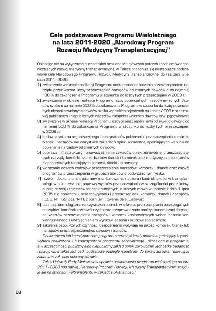 Cele podstawowe Programu Wieloletniego na lata 2011-2020 Narodowy Program Rozwoju Medycyny Transplantacyjnej Opieraj¹c siê na wytycznych europejskich oraz analizie g³ównych potrzeb i problemów ograniczaj¹cych rozwój medycyny transplantacyjnej w Polsce proponuje siê nastêpuj¹ce podstawowe cele Narodowego Programu Rozwoju Medycyny Transplantacyjnej do realizacji w latach 20112020: 1) zwiêkszenie w okresie realizacji Programu dostêpnoci do leczenia przeszczepieniem narz¹du przez wzrost liczby przeszczepieñ narz¹dów od zmar³ych dawców o co najmniej 100 % do zakoñczenia Programu w stosunku do liczby tych przeszczepieñ w 2009 r.; 2) zwiêkszenie w okresie realizacji Programu liczby potencjalnych niespokrewnionych dawców szpiku o co najmniej 300 % do zakoñczenia Programu w stosunku do liczby potencjalnych niespokrewnionych dawców szpiku w polskich rejestrach na koniec 2009 r. oraz rozwój publicznych i niepublicznych rejestrów niespokrewnionych dawców krwi pêpowinowej; 3) zwiêkszenie w okresie realizacji Programu liczby przeszczepieñ nerki od ¿ywego dawcy o co najmniej 500 % do zakoñczenia Programu w stosunku do liczby tych przeszczepieñ w 2009 r.; 4) budowa systemu organizacyjnego koordynatorów pobierania i przeszczepiania komórek, tkanek i narz¹dów we wszystkich zak³adach opieki zdrowotnej spe³niaj¹cych warunki do pobierania narz¹dów od zmar³ych dawców; 5) poprawa infrastruktury i unowoczenienie zak³adów opieki zdrowotnej przeszczepiaj¹cych narz¹dy, komórki i tkanki, banków tkanek i komórek oraz medycznych laboratoriów diagnostycznych testuj¹cych komórki, tkanki lub narz¹dy; 6) wdra¿anie nowych rodzajów przeszczepiania narz¹dów, komórek i tkanek oraz rozwój programów przeszczepiania w grupach biorców o podwy¿szonym ryzyku; 7) rozwój i doskonalenie systemów monitorowania, nadzoru i kontroli jakoci w transplantologii w celu uzyskania poprawy wyników przeszczepiania w szczególnoci przez kontynuacjê rozwoju rejestrów transplantacyjnych, o których mowa w ustawie z dnia 1 lipca 2005 r. o pobieraniu, przechowywaniu i przeszczepianiu komórek, tkanek i narz¹dów (Dz. U. Nr 169, poz. 1411, z pón. zm.), zwanej dalej ustaw¹; 8) ocena epidemiologiczna rzeczywistych potrzeb w zakresie przeszczepiania poszczególnych narz¹dów i komórek krwiotwórczych oraz przeprowadzenie analizy ekonomicznej dotycz¹cej kosztów przeszczepiania narz¹dów i komórek krwiotwórczych wobec leczenia konwencjonalnego z uwzglêdnieniem wyników leczenia i skutków spo³ecznych; 9) szkolenia osób, których czynnoci bezporednio wp³ywaj¹ na jakoæ komórek, tkanek lub narz¹dów oraz bezpieczeñstwo dawców i biorców. Realizatorem lub koordynatorem programu mo¿e byæ ka¿dy podmiot spe³niaj¹cy kryteria wyboru realizatora lub koordynatora programu zdrowotnego , okrelone w programie, a w szczególnoci publiczny albo niepubliczny zak³ad opieki zdrowotnej, jednostka badawczo rozwojowa, a tak¿e jednostki bud¿etowe podleg³e ministrowi do spraw zdrowia, realizuj¹ce zadania w zakresie ochrony zdrowia . Tekst Uchwa³y Rady Ministrów w sprawie ustanowienia programu wieloletniego na lata 20112020 pod nazw¹ Narodowy Program Rozwoju Medycyny Transplantacyjnej znajduje siê na stronach Poltransplantu w zak³adce Aktualnoci 68