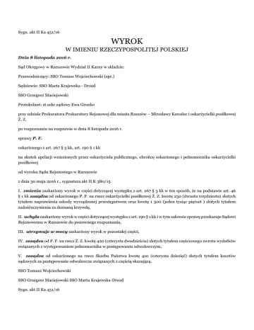 Sygn. akt II Ka 451/16 WYROK W IMIENIU RZECZYPOSPOLITEJ POLSKIEJ Dnia 8 listopada 2016 r. Sąd Okręgowy w Rzeszowie Wydział II Karny w składzie: Przewodniczący: SSO Tomasz Wojciechowski (spr.) Sędziowie: SSO Marta Krajewska - Drozd SSO Grzegorz Maciejowski Protokolant: st.sekr.sądowy Ewa Gronko przy udziale Prokuratora Prokuratury Rejonowej dla miasta Rzeszów – Mirosławy Kawalec i oskarżycielki posiłkowej Ż. Z. po rozpoznaniu na rozprawie w dniu 8 listopada 2016 r. sprawy P. F. oskarżonego z art. 267 § 3 kk, art. 190 § 1 kk na skutek apelacji wniesionych przez oskarżyciela publicznego, obrońcę oskarżonego i pełnomocnika oskarżycielki posiłkowej od wyroku Sądu Rejonowego w Rzeszowie z dnia 30 maja 2016 r., sygnatura akt II K 380/15 I. zmienia zaskarżony wyrok w części dotyczącej występku z art. 267 § 3 kk w ten sposób, że na podstawie art. 46 § 1 kk zasądza od oskarżonego P. F. na rzecz oskarżycielki posiłkowej Ż. Z. kwotę 230 (dwustu trzydziestu) złotych tytułem naprawienia szkody wyrządzonej przestępstwem oraz kwotę 1 500 (jeden tysiąc pięćset ) złotych tytułem zadośćuczynienia za doznaną krzywdę, II. uchyla zaskarżony wyrok w części dotyczącej występku z art. 190 § 1 kk i w tym zakresie sprawę przekazuje Sądowi Rejonowemu w Rzeszowie do ponownego rozpoznania, III. utrzymuje w mocy zaskarżony wyrok w pozostałej części, IV. zasądza od P. F. na rzecz Ż. Z. kwotę 420 (czterysta dwadzieścia) złotych tytułem częściowego zwrotu wydatków związanych z występowaniem pełnomocnika w postępowaniu odwoławczym, V. zasądza od oskarżonego na rzecz Skarbu Państwa kwotę 410 (czterysta dziesięć) złotych tytułem kosztów sądowych za postępowanie odwoławcze związanych z częścią skazującą. SSO Tomasz Wojciechowski SSO Grzegorz Maciejowski SSO Marta Krajewska-Drozd Sygn. akt II Ka 451/16 UZASADNIENIE Sąd Rejonowy w Rzeszowie wyrokiem z dnia 30 maja 2016r., sygn. akt II K 380/15 uznał oskarżonego P. F. za winnego występku z art. 267 § 3 kk polegającego na tym, że w bliżej nieokreślonym dniu miesiąca września 2014r. w B., woj. (...), założył w celu uzyskania nieuprawnionej informacji przedmiot o nazwie GPS T. poprzez przymocowanie go do samochodu marki A. (...) nr rej. (...) użytkowanego przez Ż. Z. i za czyn ten na podstawie art. 267 § 3 kk skazał go na karę 80 stawek dziennych grzywny, ustalając wysokość jednej stawki dziennej grzywny w kwocie 50 zł, a ponadto na podstawie art. 44 § 2 kk orzekł przepadek dowodów rzeczowych opisanych w wykazie dowodów rzeczowych nr 434/14. Tym samym wyrokiem uniewinniono oskarżonego P. F. od zarzuconego mu czynu z art. 190 § 1 kk polegającego na tym, że w bliżej nieokreślonym czasie pomiędzy 1.10.2014 roku a 15.10.2014 roku w R. przy ulicy (...) pod adresem Ż. Z. wypowiadał groźby karalne spowodowania obrażeń ciała, które to groźby wzbudziły u pokrzywdzonej realną obawę, że zostaną spełnione. Dopełnienie wyroku stanowi rozstrzygnięcie w przedmiocie kosztów procesu. Wyrok ten zaskarżyli prokurator w części dotyczącej występku z art. 190 § 1 kk co do winy, obrońca oskarżonego w części dotyczącej występku z art. 267 § 3 kk co do winy oraz pełnomocnik oskarżycielki posiłkowej w zakresie dotyczącym tego samego czynu co do braku rozstrzygnięcia o środku kompensacyjnym. Prokurator zarzucając błąd w ustaleniach faktycznych przyjętych za podstawę wydania wyroku i mający wpływ na jego treść, a wyrażający się w dokonaniu przez sąd błędnej oceny zebranego materiału dowodowego, a zwłaszcza zeznań Ż. Z. oraz jej matki M. Z., a w konsekwencji uznaniu, że oskarżonemu nie można przypisać zrealizowania znamion występku określonego w art. 190 § 1 kk, czego skutkiem jest jego uniewinnienie od popełnienia czynu określonego w art. 190 § 1 kk, podczas gdy dogłębna analiza materiału dowodowego prowadzi do wniosku, że pokrzywdzona Ż. Z. w okresie wskazanym w zarzucie aktu oskarżenia obawiała się gróźb karalnych wypowiadanych pod jej adresem przez P. F., w szczególności biorąc pod uwagę charakter i rodzaj wypowiadanych słów, a także okoliczności w jakich dochodziło do tych wydarzeń, a więc analiza ta winna prowadzić do wniosków odmiennych, mając zwłaszcza na uwadze, że pokrzywdzona Ż. Z. rozstała się z oskarżonym, który z takim stanem faktycznym nie mógł lub nie chciał się pogodzić, wniósł o uchylenie zaskarżonego wyroku i przekazanie sprawy do ponownego rozpoznania Sądowi Rejonowemu. Z kolei, obrońca oskarżonego zarzucił: I. Obrazę przepisów postępowania, mającą wpływ na treść orzeczenia, tj.: 1) naruszenie art. 5 kpk, poprzez pominięcie zasady domniemania niewinności i zasady in dubio pro reo w sytuacji, gdy wiele dowodów i okoliczności poddaje w wątpliwość winę oskarżonego, 2) naruszenie art. 7 kpk, tj. przekroczenie zasady swobodnej oceny dowodów oraz nieuwzględnienie zasad prawidłowego rozumowania i doświadczenia życiowego przy ocenie dowodów, poprzez m. in.: a) odmowę wiarygodności wyjaśnień oskarżonego w tej części, iż: - wraz z pokrzywdzoną udał się we wrześniu 2014r. do W. W. (1) celem zamontowania urządzenia GPS do samochodu pokrzywdzonej, - pokrzywdzona wiedziała o zamontowaniu ww. urządzenia w jej samochodzie, - zamontowanie urządzenia GPS w samochodzie pokrzywdzonej miało na celu jedynie zabezpieczenie go przed kradzieżą i zmniejszenie składek ubezpieczeniowych AC, a nie naruszenie czyjejkolwiek prywatności, śledzenia czy podsłuchiwania, b) przyjęcie wiarygodności części zeznań pokrzywdzonej w zakresie, w jakim twierdziła, że nie wiedziała o zamontowaniu w samochodzie urządzenia GPOS, a we wrześniu 2014r. do W. W. pojechała z oskarżonym, po rozstaniu się z nim, celem wymiany opon na zimowe i przegląd samochodu, c) pominięcie części zeznań świadka W. W. (1) i niewyciągnięcie z nich wniosków