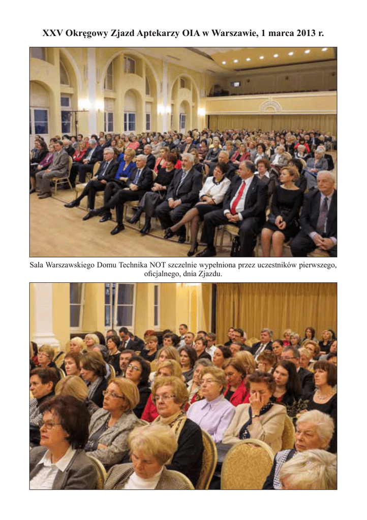XXV Okręgowy Zjazd Aptekarzy OIA w Warszawie, 1 marca 2013 r. Sala Warszawskiego Domu Technika NOT szczelnie wypełniona przez uczestników pierwszego, oficjalnego, dnia Zjazdu. Na zdjęciu, od lewej: Krzysztof Makuch – z-ca prezesa ORL w Warszawie, Waldemar Firek – dyr. biura OIA, dyr. Klaudia Wnuk, reprezentująca firmę, KRKA Polska wyróżnioną, tytułem Mecenasa Samorządu Aptekarskiego, dr Włodzimierz Hudemowicz także wyróżniony tym tytułem oraz mgr farm.Barbara Kołakowska odznaczona Medalem im. prof. B. Koskowskiego. W głębi, od lewej: płk mgr farm. Mirosław Czech - Naczelny Inspektor Farmaceutyczny WP, mgr farm. Ewa Dobrosielska – przew. Delegatury Płockiej OIA, prof. Jerzy Woy-Wojciechowski. prezes NRA – dr Grzegorz Kucharewicz wręcza Medal im. prof. B. Koskowskiego mgr farm. Jackowi Lipce – przewodniczącemu Okręgowej Komisji Rewizyjnej OIA. Wspólne zdjęcie wszystkich wyróżnionych. Od lewej mgr, mgr farm.: Jakub Dorociak – czł. Prezydium ORA oraz wyróżnieni Medalem im. prof. B. Koskowskiego: Ryszard Seidel, córka odbierająca medal w imieniu odznaczonej Marii T. Marczak, Jacek Lipka, Elżbieta Lazurek, Dariusz Kozar, Barbara Kołakowska, Klaudia Wnuk i dr Włodzimierz Hudemowicz odbierający tytuły Mecenasa Samorządu Aptekarskiego, dr Grzegorz Kucharewicz – prezes NRA. Wystąpienie prezesa NRA – dr Grzegorza Kucharewicza. zakończeniem, pierwszego, oficjalnego dnia Zjazdu był znakomity spektakl Andrzejów: Poniedzielskiego i Pawlukiewicza – Chyba już można… XXV Okręgowy Zjazd Aptekarzy OIA w Warszawie, 2 marca 2013 r. 2 marca 2013 r. godz. 10.00. W całkowicie „odmienionej” Sali WDT NOT rozpoczynają się obrady drugiego dnia Okręgowego Zjazdu Aptekarzy OIA w Warszawie. Prezydium Zjazdu. Od lewej: prof. Bożenna Gutkowska – prezes Oddz. Warsz. PTF, dr n. farm. Włodzimierz Hudemowicz – z-ca prezesa ORA, prof. Helena Makulska-Nowak – czł. ORA, mgr, mgr farm.: Alina Fornal – prezes ORA, Dorota Smółkowska – przew. Zjazdu, z-ca prezesa ORA, Sylwester Majewski – radca prawny OIA, Jolanta Krawczyk – przew. Delegatury OIA w Radomiu – z-ca przew. Zjazdu. Po raz pierwszy w historii Zjazdów w obradach uczestniczyła duża grupa przedstawicieli Komisji Seniorów naszej Izby, z przewodniczącą Komisji mgr farm. Seweryną Nowakowską na czele (na I planie, w środku). Na mównicy przedstawicielki aptek szpitalnych. Powyżej mgr farm. Jolanta Klimowicz, poniżej mgr farm. Ewa Steckiewicz-Bartnicka – przew. Komisji Aptek Szpitalnych. Bardzo zapracowany sekretarz Zjazdu mgr farm. Małgorzata Chmielak – przew. Delegatury OIA w Siedlcach. Uczestnicy i goście uroczystości wręczenia w dniu 12 kwietnia 2013 r. w Sali W a Praw Wykonywania Zawodu Farmaceuty, Warszawskiego Domu Technika NOT. Wręczenia Praw Wykonywania Zawodu Farmaceuty Grupa uczestników uroczystości w dniu 12 kwietnia 2013 r., tuż po wręczeniu Praw Wykonywania Zawodu Farmaceuty, Uroczyste wręczenie Praw Wykonywania Zawodu Farmaceuty w Wojskowym Ośrodku Farmacji i Techniki Medycznej w Celestynowie, w dniu 11 czerwca 2013 r. Z rąk prezesa ORA - mgr farm. Aliny Fornal, w obecności komendanta Ośrodka – płk dr n. med. Radosława Ziemby oraz mgr Waldemara Firka – dyr. Biura OIA i płk mgr farm. Krzysztofa Kondrackiego – skarbnika ORA, dokument ten otrzymuje ppor. mgr farm. Janusz Borys, obok ppr. mgr farm. Krzysztof Szachta. Uczestnicy uroczystości wręczenia Praw Wykonywania Zawodu Farmaceuty w dniu 12 kwietnia 2013 r. I oficjalni goście tej uroczystości. O lewej: dr Wiesław Kalicki – Inspektor w WIIF, dr hab. n. farm. Agnieszka Pietrosiuk – Prodziekan WF WUM, mgr farm. Małgorzata Szelachowska- Mazowiecki Wojewódzki Inspektor Farm., mgr farm. Alina Fornal – prezes ORA, dr Grzegorz Kucharewicz – prezes NRA, mgr farm. Dorota Smółkowska – z-ca prezesa ORA. Wystąpienie Prorektora WUM – prof. dr hab. Marka Kulusa, obok prof. dr hab. n. farm. Piotr Wroczyński – Dziekan Wydziału Farmaceutycznego WUM. Uroczyste wręczenie Praw Wykonywania Zawodu Farmaceuty 1 marca 2013 r., w I dniu XXV OZA OIA przez prezesa NRA – dr Grzegorza Kucharewicza, któremu towarzyszą dr, dr n .farm.: Włodzimierz Hudemowicz – z-ca prezesa ORA i Jerzy Żabiński – przew. Komisji ds. Zawodowych i Młodych Farmaceutów. Zdjęcie całej dwunastki młodych adeptów farmacji po uroczystości w dniu 1 marca 2013 r. Spotkanie Integracyjne Młodych Farmaceutów – Wieczór Hiszpański, Radom, 20 kwietnia 2013 r. Inicjatorki i realizatorki Spotkania: Jolanta Krawczyk – przewodnicząca Delegatury OIA w Radomiu i Elżbieta Nowakowska (z telefonem) – biuro Delegatury oraz ich Goście w oczekiwaniu na rozpoczęcie imprezy. Goście przy stole, a obok jadło i napitki hiszpańskie. Mistrzowski pokaz tańców hiszpańskich i próba wspólnego ich wykonania, ponoć udana.