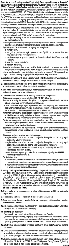 Rada Nadzorcza Przedsiębiorstwa Eksploatacji Rurociągów Naftowych „Przyjaźń” Spółka Akcyjna z siedzibą w Płocku przy ulicy Wyszogrodzkiej 133, 09-410 Płock 12 (PERN „Przyjaźń” SA lub Spółka), wpis do rejestru przedsiębiorców w sądzie Rejonowym dla m.st. Warszawy w Warszawie, XIV Wydział Gospodarczy Krajowego Rejestru Sądowego pod numerem 0000069559, NIP: 774-00-03-097, kapitał zakładowy wpłacony w całości w wysokości 1.235.977.500,00 zł, w związku z podjęciem w dniu 16.09.2014 roku Uchwały Nr 143/VI/2014 w sprawie przeprowadzenia audytu polegającego na szczegółowej analizie kosztów działalności operacyjnej Spółki oraz pozostałych kosztów funkcjonowania Spółki obejmującej okres od dnia 01.01.2011 roku do dnia 30.06.2014 roku, zaprasza zainteresowane podmioty (Oferentów) do składania pisemnych ofert na przeprowadzenie ww. analizy. 1. Przedmiotem audytu, z zastrzeżeniem pkt 2 i pkt 3 poniżej, będzie szczegółowa analiza kosztów działalności operacyjnej Spółki oraz pozostałych kosztów funkcjonowania Spółki obejmującej okres od dnia 01.01.2011 roku do dnia 30.06.2014 roku (przy założeniu konieczności analizy ok. 2.700 umów), w szczególności obejmująca: 1) analizę struktury i dynamiki kosztów oraz ustalenie odchyleń kosztów w stosunku do założeń planowych, 2) analizę kosztów zaewidencjonowanych na miejsca powstawania kosztów z uwzględnieniem kosztów bezpośrednio ewidencjonowanych na ośrodkach odpowiedzialności, 3) analizę kosztów działalności operacyjnej, w szczególności: a) wynagrodzeń, b) usług obcych, w tym m.in. wykonywania na rzecz Spółki przez jej pracowników prac na podstawie umów cywilnoprawnych, c) kosztów zarządu, w tym m.in.: podróży służbowych, szkoleń, kosztów reprezentacji i reklamy, d) kosztów zużycia materiałów, e) kosztów transportu, 4) analizę kosztów zatrudniania pracowników Spółki na więcej niż na jednym stanowisku pracy w spółkach Grupy Kapitałowej PERN „Przyjaźń” (niezależnie od formy zatrudnienia), a także przedstawienie działań skutkujących optymalizacją kosztów Spółki w perspektywie długo i krótkoterminowej, mającej charakter jednorazowej rekomendacji. 2. W trakcie prowadzonych przez przedstawicieli Rady Nadzorczej ustnych negocjacji z oferentami nastąpi doprecyzowanie przedmiotu zakresu audytu. 3. Rada Nadzorcza zastrzega sobie prawo do modyfikacji przedmiotowego zakresu audytu w trakcie prowadzonych z oferentem ustnych negocjacji. 4. Jako termin finalny sporządzenia audytu Rada Nadzorcza wskazuje trzy miesiące od dnia podpisania umowy z wybranym Oferentem. 5. Oferty składane przez Oferentów powinny zawierać w szczególności: 1) dokładne oznaczenie nazwy, siedziby, NIP, REGON Oferenta, 2) oznaczenie osoby do kontaktu z Radą Nadzorczą poprzez podanie imienia i nazwiska, adresu e-mail oraz numeru telefonu komórkowego, 3) oznaczenie właściwego rejestru (ewidencji), do których wpisany jest Oferent wraz z dokumentem potwierdzającym wpis do właściwego rejestru (ewidencji) wystawionym nie wcześniej, niż 6 miesięcy przed terminem składania ofert, 4) harmonogram audytu, skład zespołu przeprowadzającego audyt, w tym zapewnienie w składzie zespołu osoby posiadającej doświadczenie w przeprowadzaniu audytów w branży paliwowej, potwierdzone stosownym oświadczeniem, 5) oferowaną cenę netto i brutto za przeprowadzenie audytu; oferowana cena powinna zawierać wszystkie ponoszone przez Oferenta koszty, w szczególności koszty zakwaterowania, wyżywienia i dojazdów, 6) aktualne (wystawione nie wcześniej niż 3 miesiące przed terminem składania ofert) zaświadczenie z Urzędu Skarbowego i z ZUS o niezaleganiu w opłacaniu podatków i składek, 7) posiadane pisemne referencje potwierdzające: a) wykonanie w latach 2012 – 2014 co najmniej 5 audytów na rzecz krajowych podmiotów w branży paliwowej, b) wykonanie w latach 2012 – 2014 co najmniej 5 audytów na rzecz krajowych podmiotów, które spełniają jeden z niżej wymienionych warunków: - przychody wynoszące w każdym roku obrotowym co najmniej 100 000 000 (słownie: sto milionów) zł netto, - suma bilansowa wynosząca za każdy rok obrotowy co najmniej 500 000 000 (słownie: pięćset milionów) zł. 8) oświadczenia o: a) uczestnictwie przedstawicieli Oferenta w posiedzeniach Rad Nadzorczych Spółki celem zaprezentowania i omówienia przeprowadzonego audytu, jego wyników oraz rekomendacji, b) przekazaniu do wiadomości Rady Nadzorczej wyników audytu wraz z rekomendacjami w wersji papierowej oraz elektronicznej. 6. Oferty powinny być składane w zamkniętych kopertach z adnotacją na kopercie: „Oferta na przeprowadzenie audytu - Szczegółowa analiza kosztów działalności operacyjnej PERN „Przyjaźń” SA oraz pozostałych kosztów funkcjonowania PERN „Przyjaźń” SA obejmującej okres od dnia 01.01.2011 roku do dnia 30.06.2014” na adres: Przedsiębiorstwo Eksploatacji Rurociągów Naftowych „Przyjaźń” SA z siedzibą w Płocku 09 - 410, ul. Wyszogrodzka 133, przy czym za datę złożenia oferty uważa się jej dostarczenie pod wyżej wymieniony adres do Kancelarii Ogólnej do godziny 15.00 do dnia 19 grudnia 2014 roku. 7. Oferty złożone z przekroczeniem terminu, o którym mowa w pkt 6 nie podlegają rozpatrzeniu. 8. Rozpatrzeniu nie będą podlegać oferty częściowe lub warunkowe. 9. Rada Nadzorcza dokona otwarcia ofert w wybranym przez siebie miejscu i terminie bez obecności Oferentów. 10. Po otwarciu oraz wstępnej kwalifikacji Ofert, Rada Nadzorcza powiadomi Oferentów o miejscu oraz terminie ustnych negocjacji. 11. Zastrzega się możliwość: 1) rezygnacji z wybranych usług objętych niniejszym zamówieniem, 2) swobodnego wyboru oferty, negocjacji z wybranymi Oferentami, przedłużenia terminu składania ofert oraz ukończenia postępowania na każdym etapie postępowania bez podania przyczyny i bez ponoszenia jakich