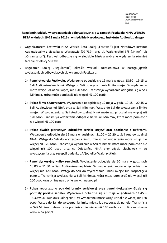 Regulamin udziału w wydarzeniach odbywających się w ramach Festiwalu NINA WERSJA BETA w dniach 19-23 maja 2016 r. w siedzibie Narodowego Instytutu Audiowizualnego 1. Organizatorem Festiwalu NInA Wersja Beta (dalej „Festiwal”) jest Narodowy Instytut Audiowizualny z siedzibą w Warszawie (02-739), przy ul. Wałbrzyskiej 3/5 („NInA” lub „Organizator”). Festiwal odbędzie się w siedzibie NInA a wybrane wydarzenia również terenie dzielnicy Służew. 2. Regulamin (dalej „Regulamin”) określa warunki uczestnictwa w następujących wydarzeniach odbywających się w ramach Festiwalu: 1) Panel otwarcia Festiwalu. Wydarzenie odbędzie się 19 maja w godz. 18:30 - 19.15 w Sali Audiowizualnej NInA. Wstęp do Sali do wyczerpania limitu miejsc. W wydarzeniu może wziąć udział nie więcej niż 120 osób. Transmisja wydarzenia odbędzie się w Sali Minimax, która może pomieścić nie więcej niż 100 osób. 2) Pokaz filmu Showrunners. Wydarzenie odbędzie się 19 maja w godz. 19.15 – 20.45 w Sali Audiowizualnej NInA oraz w Sali Minimax. Wstęp do Sal do wyczerpania limitu miejsc. W wydarzeniu w Sali Audiowizualnej NInA może wziąć udział nie więcej niż 120 osób. Transmisja wydarzenia odbędzie się w Sali Minimax, która może pomieścić nie więcej niż 100 osób. 3) Pokaz dwóch pierwszych odcinków serialu Artyści oraz spotkanie z twórcami. Wydarzenie odbędzie się 19 maja w godzinach 21.00 – 22.20 w Sali Audiowizualnej NInA. Wstęp do Sali do wyczerpania limitu miejsc. W wydarzeniu może wziąć nie więcej niż 120 osób. Transmisja wydarzenia w Sali Minimax, która może pomieścić nie więcej niż 100 osób oraz na Dziedzińcu NInA przy użyciu słuchawek – do wypożyczenia przy recepcji budynku „A”(od ulicy Wałbrzyskiej). 4) Panel dyskusyjny Kulisy rewolucji. Wydarzenie odbędzie się 20 maja w godzinach 10.00 – 11.30 w Sali Audiowizualnej NInA. W wydarzeniu może wziąć udział nie więcej niż 120 osób. Wstęp do Sali do wyczerpania limitu miejsc lub rozpoczęcia panelu. Transmisja wydarzenia w Sali Minimax, która może pomieścić nie więcej niż 100 osób oraz online na stronie www.nina.gov.pl. 5) Pokaz reportażu o polskiej branży serialowej oraz panel dyskusyjny Gdzie się podziały polskie seriale? Wydarzenie odbędzie się 20 maja w godzinach 11.45 – 13.30 w Sali Audiowizualnej NInA. W wydarzeniu może wziąć udział nie więcej niż 120 osób. Wstęp do Sali do wyczerpania limitu miejsc lub rozpoczęcia panelu. Transmisja w Sali Minimax, która może pomieścić nie więcej niż 100 osób oraz online na stronie www.nina.gov.pl. 6) Jak to się robi? Pokaz Extras i Episodes. Wydarzenie odbędzie się 20 maja w godzinach 13.45 – 14.45 w Sali Audiowizualnej NInA. Wstęp do Sali do wyczerpania limitu miejsc. W wydarzeniu może wziąć udział nie więcej niż 120 osób. 7) Spotkanie poświęcone polskiej publiczności nowoserialowej. Co widzi ekran? Wydarzenie odbędzie się 20 maja w godzinach 14.45 – 15.15 w Sali Audiowizualnej NInA. W wydarzeniu może wziąć udział nie więcej niż 120 osób. Wstęp do Sali do wyczerpania limitu miejsc lub rozpoczęcia panelu. Transmisja w Sali Minimax, która może pomieścić nie więcej niż 100 osób oraz online na stronie www.nina.gov.pl. 8) Panel dyskusyjny: studium przypadku: Nordic Noir. Wydarzenie odbędzie się 20 maja w godzinach 16.45 – 17.30 w Sali Audiowizualnej NInA. Wstęp do Sali do wyczerpania limitu miejsc lub rozpoczęcia panelu. W wydarzeniu może wziąć udział nie więcej niż 120 osób. Transmisja w Sali Minimax, która może pomieścić nie więcej niż 100 osób oraz online na stronie www.nina.gov.pl 9) Pokaz dokumentu o Nordic Noir. Wydarzenie odbędzie się 20 maja w godz. 17.30 – 18.30 w Sali Audiowizualnej NInA oraz w Sali Minimax. Wstęp do Sal do wyczerpania limitu miejsc (120 dla Sali Audiowizualnej oraz 100 dla Sali Minimax). 10) Pokaz serialu Pakt. Wydarzenie odbędzie się 20 maja w godzinach 18.30 – 19.30 w Sali Audiowizualnej NInA. Wstęp do Sali do wyczerpania limitu miejsc. W wydarzeniu może wziąć udział nie więcej niż 120 osób. 11) Pokaz dwóch odcinków serialu Most nad Sundem. Wydarzenie odbędzie się 20 maja w godzinach 19.30 – 21.30 w Sali Audiowizualnej NInA. Wstęp do Sali do wyczerpania limitu miejsc. W wydarzeniu może wziąć udział nie więcej niż 120 osób. Transmisja w Sali Minimax, która może pomieścić nie więcej niż 100 osób. 12) Odkrycia serialowe. Wydarzenie odbędzie się 20 maja w godzinach 21.30 – 22.30 w Sali Audiowizualnej NInA. Wstęp do Sali do wyczerpania limitu miejsc. W wydarzeniu może wziąć udział nie więcej niż 120 osób. Transmisja w Sali Minimax, która może pomieścić nie więcej niż 100 osób oraz online na stronie www.nina.gov.pl. 13) Silent disco. Wydarzenie odbędzie się 20 maja w godz. 22.30-2.00 w Sali Minimax oraz przestrzeniach kawiarni Gorączka i dziedzińca siedziby NInA. W wydarzeniu może wziąć udział nie więcej niż 167 osób. 14) Spotkania po latach. Wydarzenie odbędzie się 21 maja w godzinach 10.00 – 14.14 w Sali Audiowizualnej NInA. Wstęp do Sali do limitu wyczerpania miejsc. W wydarzeniu może wziąć udział nie więcej niż 120 osób. 15) Writers’ Room. Wydarzenie odbędzie się 21 maja w godzinach 10.00 – 22.00 w salach edukacyjnych NInA. Obowiązuje rekrutacja przez stronę NInA. 16) Storycode. Wydarzenie odbędzie się 21 maja w godzinach 15:30 – 16.50 w Sali Audiowizualnej NInA. Obowiązuje rejestracja realizowana przez współorganizatora wydarzenia. 17) Pokazy seriali: Trepalium, Togetherness, Looking, Girls, Honourable Woman oraz Vinyl. Wydarzenia odbędą się 21 maja w godzinach 14.30 – 01.20 w Sali Audiowizualnej NInA. Wstęp do Sali do wyczerpania limitu miejsc. W wydarzeniu może wziąć udział nie więcej niż 120 osób. 18) Pokaz Top of the lake. Wydarzenie odbędzie się w dniu 21 maja w godz. 21.35 – 22.30 w Sali Minimax oraz na 