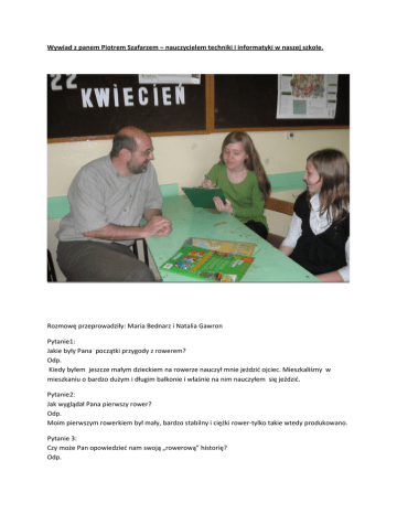 Wywiad z panem Piotrem Szafarzem – nauczycielem techniki i informatyki w naszej szkole. Rozmowę przeprowadziły: Maria Bednarz i Natalia Gawron Pytanie1: Jakie były Pana początki przygody z rowerem? Odp. Kiedy byłem jeszcze małym dzieckiem na rowerze nauczył mnie jeździć ojciec. Mieszkaliśmy w mieszkaniu o bardzo dużym i długim balkonie i właśnie na nim nauczyłem się jeździć. Pytanie2: Jak wyglądał Pana pierwszy rower? Odp. Moim pierwszym rowerkiem był mały, bardzo stabilny i ciężki rower-tylko takie wtedy produkowano. Pytanie 3: Czy może Pan opowiedzieć nam swoją „rowerową” historię? Odp. Jazda na rowerze od zawsze jest moim hobby. Jest to po prostu bardzo dobrze spędzony czas ,na czymś, za czym ogromnie przepadam. Brałem udział w wielu wypadach rowerowych. W latach , kiedy byłem jeszcze młody, rower to była rozrywka. Miałem nawet taki plan ,aby pojechać na rowerze dookoła Polski ,ale jakoś się to przekładało ,a potem już nie było czasu. Gdy byłem nastolatkiem bardzo dużym ,,szpanem,, był rower składak . Wtedy każdy chciał taki mieć. Chciałem też kupić sobie taki rower ,więc uzbierałem pieniądze , trochę dołożyli mi rodzice i w roku 1971 wreszcie kupiłem rower swoich (wtedy) marzeń-składak. Jak pamiętam- zawsze chciałem jeździć na rowerze zimą ,ale rodzice uważali (panował wtedy taki stereotyp) ,że zimą się nie jeździ . Wiele czasu w swoim życiu poświęcałem i poświęcam na jazdę na rowerze , kiedyś nawet próbowałem jeździć na jednym kole. Teraz jeżdżę rowerem ,ale nie codziennie, tylko jak jest ładna pogoda to co weekend. Najczęściej wybieram się do lasu, ze względu na stan zdrowia. Pytanie 4: Czy polecałby Pan ten sport innym? Odp. Oczywiście! Sport ten poleciłbym wszystkim , jednak najbardziej młodym ludziom - "zamiast komputera". Jednak przestrzegam - żeby jeździć na rowerze trzeba mieć wyobraźnię tzn. trzeba pamiętać co wolno nam robić podczas przejażdżki rowerem ,a czego nie i umieć sobie wyobrazić co złego mogłoby się stać, jakbyśmy postąpili tak , a nie inaczej. Pytanie 5: Jak należy ubierać się, szykując do rowerowej wycieczki? Odp. Strój na zwykłą jazdę rowerem nie powinien obcierać, nie odparzać, być wygodny oraz przewiewny , a strój na wszelkiego typu wyścigi powinien być już specjalnie do tego uszyty, stworzony-zakupiony w sklepie sportowym. Pytanie 6: Jak ocenia Pan możliwości poruszania się rowerem po naszym mieście? Odp. Niestety nie ma w Zabrzu wielu tras rowerowych. Jednak jeśli ktoś chce jeździć ,to zawsze znajdzie do tego miejsce i czas. Dziękujemy serdecznie, że zechciał Pan z nami porozmawiać i zapraszamy na naszą wycieczkę rowerową.