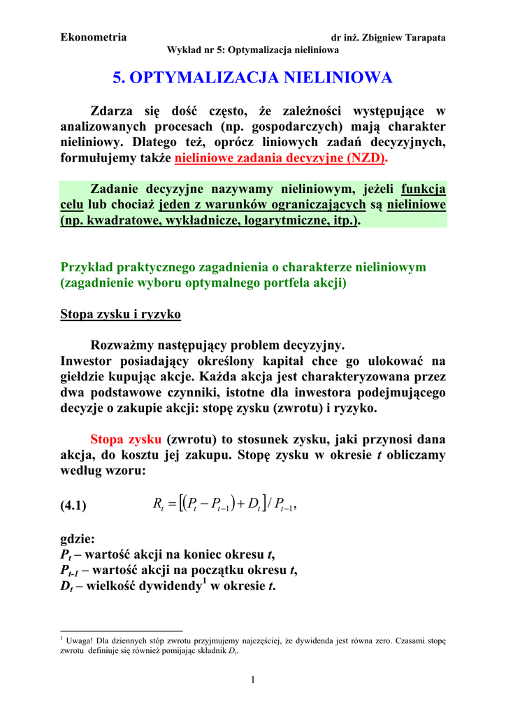 Ekonometria dr inż. Zbigniew Tarapata Wykład nr 5: Optymalizacja nieliniowa 5. OPTYMALIZACJA NIELINIOWA Zdarza się dość często, że zależności występujące w analizowanych procesach (np. gospodarczych) mają charakter nieliniowy. Dlatego też, oprócz liniowych zadań decyzyjnych, formułujemy także nieliniowe zadania decyzyjne (NZD). Zadanie decyzyjne nazywamy nieliniowym, jeżeli funkcja celu lub chociaż jeden z warunków ograniczających są nieliniowe (np. kwadratowe, wykładnicze, logarytmiczne, itp.). Przykład praktycznego zagadnienia o charakterze nieliniowym (zagadnienie wyboru optymalnego portfela akcji) Stopa zysku i ryzyko Rozważmy następujący problem decyzyjny. Inwestor posiadający określony kapitał chce go ulokować na giełdzie kupując akcje. Każda akcja jest charakteryzowana przez dwa podstawowe czynniki, istotne dla inwestora podejmującego decyzje o zakupie akcji: stopę zysku (zwrotu) i ryzyko. Stopa zysku (zwrotu) to stosunek zysku, jaki przynosi dana akcja, do kosztu jej zakupu. Stopę zysku w okresie t obliczamy według wzoru: (4.1) Rt = [(Pt − Pt −1 ) + Dt ] / Pt −1 , gdzie: Pt – wartość akcji na koniec okresu t, Pt-1 – wartość akcji na początku okresu t, Dt – wielkość dywidendy1 w okresie t. 1 Uwaga! Dla dziennych stóp zwrotu przyjmujemy najczęściej, że dywidenda jest równa zero. Czasami stopę zwrotu definiuje się również pomijając składnik Dt. 1 Ekonometria dr inż. Zbigniew Tarapata Wykład nr 5: Optymalizacja nieliniowa Wszystkie decyzje związane z inwestowaniem w akcje są decyzjami dotyczącymi przyszłości, podejmowanymi w warunkach niepewności. Tak więc, stopa zysku jest w istocie przyszłą, oczekiwana stopą zysku, jaka zostanie osiągnięta w pewnym okresie. Stąd uzyskanie ustalonej wartości stopy zysku wiąże się z ryzykiem. Stopa zysku jest zmienną losową, która może przyjmować różne wartości z określonymi prawdopodobieństwami. Prawdopodobieństwa te zależą od sytuacji na giełdzie, a te z kolei od różnych czynników, np. od stanu gospodarki czy sytuacji politycznej. Przykład 4.1 Rozważmy akcje dwóch spółek A i B. W Tabeli 4.1 przedstawiono rozkłady stóp zwrotu tych akcji. Tabela 4.1 Możliwy stan gospodarki i 1 2 3 4 5 Prawdopodobieństwo Stopa zwrotu pi 0.1 0.2 0.4 0.2 0.1 R iA (w %) R iB (w %) 60 20 30 14 10 10 -10 6 -40 0 Powstaje pytanie: jak na podstawie tych przewidywanych stóp zysku oszacować jeden wskaźnik, który mógłby umożliwić podjęcie decyzji o zakupie akcji? Do tego celu służy oczekiwana stopa zysku (zwrotu). Określa się ją według wzoru: m (4.2) R = ∑ pi ⋅ Ri i =1 gdzie: R – oczekiwana stopa zwrotu; Ri – i-ta możliwa wartość stopy zwrotu; 2 Ekonometria dr inż. Zbigniew Tarapata Wykład nr 5: Optymalizacja nieliniowa pi – prawdopodobieństwo osiągnięcia przez stopę zwrotu i-tej wartości; m – liczba możliwych do osiągnięcia wartości stopy zwrotu. Po podstawieniu do wzoru (4.2) wartości z Tabeli 4.1 otrzymamy: ♦ dla spółki A: R A = 0.1 ⋅ 60% + 0.2 ⋅ 30% + 0.4 ⋅10% + 0.2 ⋅ ( −10%) + 0.1 ⋅ ( −40%) = 10% ♦ dla spółki B: RB = 0.1 ⋅ 20% + 0.2 ⋅ 14% + 0.4 ⋅ 10% + 0.2 ⋅ 6% + 0.1 ⋅ 0% = 10% Rozkład prawdopodobieństwa stóp zwrotu akcji spółki B Rozkład prawdopodobieństwa stóp zwrotu akcji spółki A 0,4 0,4 0,2 0,2 0,0 0,0 -50 -40 -30 -20 -10 0 10 20 30 40 50 60 -50 70 -40 -30 -20 -10 0 10 20 30 40 50 60 70 Wartości możliwych stóp zwrotu Wartości możliwych stóp zwrotu a) b) Wykres 4.1 Rozkłady prawdopodobieństwa stóp zwrotu akcji spółki A a) oraz B b) Z obliczonych wartości oczekiwanych stóp zwrotu wynika, że inwestowanie w obie spółki jest tak samo atrakcyjne (ten sam oczekiwany „zysk”). Analiza wykresów 4.1a) i 4.1b) pozwala jednakże stwierdzić, że w przypadku akcji spółki A możemy równie dobrze dużo zyskać (60% z prawdopodobieństwem 0.1) jak i dużo stracić (-40% z prawdopodobieństwem 0.1). Dzieje się tak dlatego, że rozrzut możliwych wartości stopy zwrotu wokół oczekiwanej stopy zwrotu (RA=10%) jest duży. Takiej złej cechy nie posiada rozkład stopy zwrotu spółki B. Widać z wykresu 4.1b, że w najgorszym przypadku możemy ani nie stracić, ani nie zyskać (dla R5B=0%) natomiast w najlepszym przypadku wprawdzie zyskujemy „tylko” 20% (czyli mniej niż dla najlepszego przypadku dla spółki A, tzn. dla R1A=60%), ale mamy mniejszy rozrzut możliwych wartości stopy zwrotu wokół wartości oczekiwanej (tzn. wokół RB=10%). Dlaczego? Ponieważ z akcją B wiąże się znacznie mniejsze ryzyko, niż z akcją A. 3 Ekonometria dr inż. Zbigniew Tarapata Wykład nr 5: Optymalizacja nieliniowa Im większe zróżnicowanie możliwych stóp zysku, tym większe ryzyko związane z daną akcją. Powstaje zasadniczy problem: Jak zmierzyć ryzyko, jak wyrazić je syntetycznie za pomocą jednej liczby? Ryzyko związane z daną akcją można zmierzyć za pomocą wariancji stopy zysku określonej wzorem: m (4.3) V = ∑ p i ⋅( Ri − R) 2 i =1 gdzie: V – wariancja stopy zwrotu; R – oczekiwana stopa zwrotu. Częściej stosuje się inną miarę ryzyka, mianowicie odchylenie standardowe s stopy zwrotu (standard deviation of returns): (4.4) s= V = m ∑ p ⋅ ( R − R) i =1 i 2 i gdzie: s – odchylenie standardowe stopy zwrotu. Odchylenie standardowe wskazuje przeciętne odchylenie możliwych stóp zwrotu od oczekiwanej stopy zwrotu, przy czym im większe jest odchylenie standardowe, tym większe ryzyko. Ze wzoru (4.3) oraz Tabeli 4.1 mamy: - dla akcji spółki A V A = 0.1 ⋅ (0.6 − 0.1) 2 + 0.2 ⋅ (0.3 − 0.1) 2 + 0.4 ⋅ (0.1 − 0.1) 2 + 0.2 ⋅ (−0.1 − 0.1) 2 + 0.1 ⋅ (−0.4 − 0.1) 2 = 0.066 4 Ekonometria dr inż. Zbigniew Tarapata Wykład nr 5: Optymalizacja nieliniowa - dla akcji spółki B VB = 0.1 ⋅ (0.2 − 0.1) 2 + 0.2 ⋅ (0.14 − 0.1) 2 + 0.4 ⋅ (0.1 − 0.1) 2 + 0.2 ⋅ (0.06 − 0.1) 2 + 0.1 ⋅ (0 − 0.1) 2 = 0.00264 oraz ze wzo
