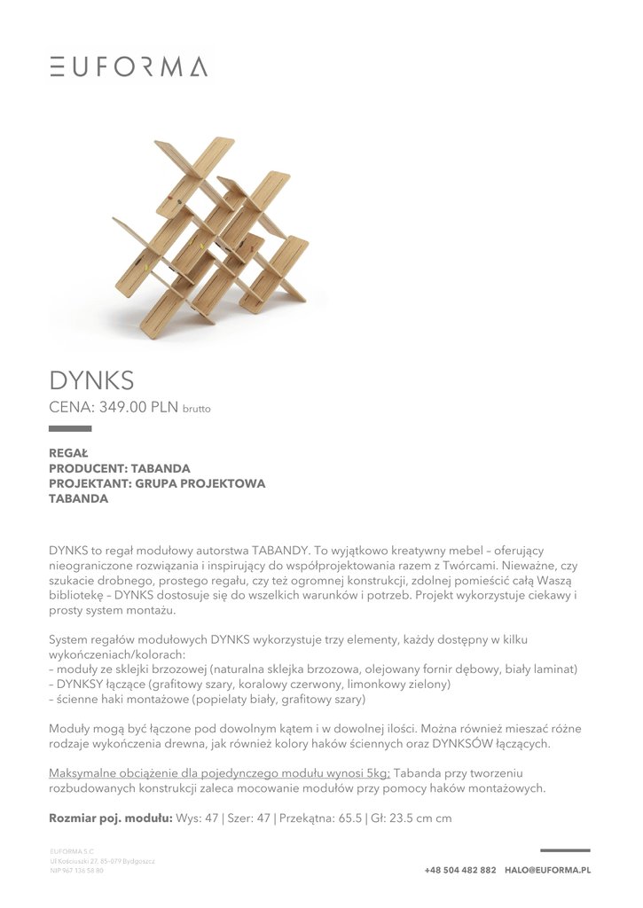 DYNKS CENA: 349.00 PLN brutto REGAŁ PRODUCENT: TABANDA PROJEKTANT: GRUPA PROJEKTOWA TABANDA DYNKS to regał modułowy autorstwa TABANDY. To wyjątkowo kreatywny mebel – oferujący nieograniczone rozwiązania i inspirujący do współprojektowania razem z Twórcami. Nieważne, czy szukacie drobnego, prostego regału, czy też ogromnej konstrukcji, zdolnej pomieścić całą Waszą bibliotekę – DYNKS dostosuje się do wszelkich warunków i potrzeb. Projekt wykorzystuje ciekawy i prosty system montażu. System regałów modułowych DYNKS wykorzystuje trzy elementy, każdy dostępny w kilku wykończeniach/kolorach: – moduły ze sklejki brzozowej (naturalna sklejka brzozowa, olejowany fornir dębowy, biały laminat) – DYNKSY łączące (grafitowy szary, koralowy czerwony, limonkowy zielony) – ścienne haki montażowe (popielaty biały, grafitowy szary) Moduły mogą być łączone pod dowolnym kątem i w dowolnej ilości. Można również mieszać różne rodzaje wykończenia drewna, jak również kolory haków ściennych oraz DYNKSÓW łączących. Maksymalne obciążenie dla pojedynczego modułu wynosi 5kg; Tabanda przy tworzeniu rozbudowanych konstrukcji zaleca mocowanie modułów przy pomocy haków montażowych. Rozmiar poj. modułu: Wys: 47 | Szer: 47 | Przekątna: 65.5 | Gł: 23.5 cm cm Moduł: sklejka brzozowa gr. 12mm, pokryta białym laminatem (NCS S1002-G50Y); cięta numerycznie; wykańczana ręcznie. Maksymalne obciążenie dla pojedynczego modułu wynosi 5kg. Czas oczekiwania: 4-5 tygodni Powered by TCPDF (www.tcpdf.org)