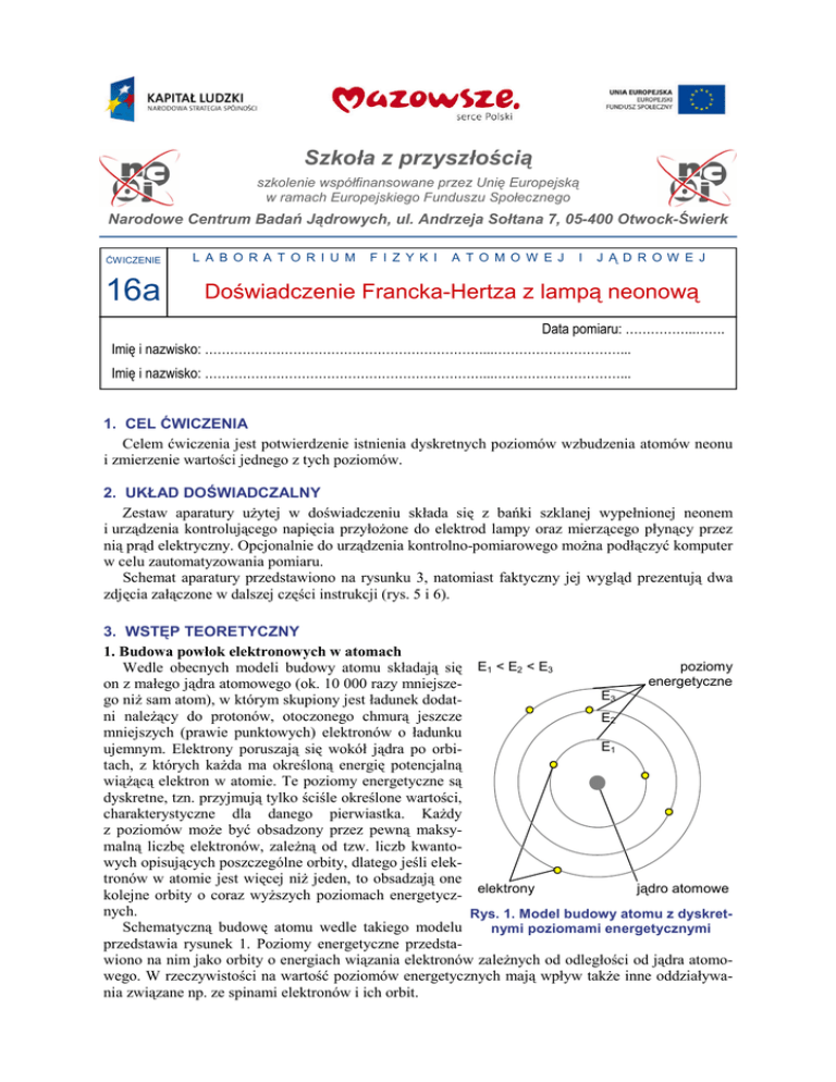 Szkoła z przyszłością szkolenie współfinansowane przez Unię Europejską w ramach Europejskiego Funduszu Społecznego Narodowe Centrum Badań Jądrowych, ul. Andrzeja Sołtana 7, 05-400 Otwock-Świerk ĆWICZENIE 16a L A B O R A T O R I U M F I Z Y K I A T O M O W E J I J Ą D R O W E J Doświadczenie Francka-Hertza z lampą neonową Data pomiaru: ……………..……. Imię i nazwisko: …………………………………………………………...…………………………... Imię i nazwisko: …………………………………………………………...…………………………... 1. CEL ĆWICZENIA Celem ćwiczenia jest potwierdzenie istnienia dyskretnych poziomów wzbudzenia atomów neonu i zmierzenie wartości jednego z tych poziomów. 2. UKŁAD DOŚWIADCZALNY Zestaw aparatury użytej w doświadczeniu składa się z bańki szklanej wypełnionej neonem i urządzenia kontrolującego napięcia przyłożone do elektrod lampy oraz mierzącego płynący przez nią prąd elektryczny. Opcjonalnie do urządzenia kontrolno-pomiarowego można podłączyć komputer w celu zautomatyzowania pomiaru. Schemat aparatury przedstawiono na rysunku 3, natomiast faktyczny jej wygląd prezentują dwa zdjęcia załączone w dalszej części instrukcji (rys. 5 i 6). 3. WSTĘP TEORETYCZNY 1. Budowa powłok elektronowych w atomach poziomy Wedle obecnych modeli budowy atomu składają się E1 < E2 < E3 energetyczne on z małego jądra atomowego (ok. 10 000 razy mniejszeE3 go niż sam atom), w którym skupiony jest ładunek dodatni należący do protonów, otoczonego chmurą jeszcze E2 mniejszych (prawie punktowych) elektronów o ładunku E1 ujemnym. Elektrony poruszają się wokół jądra po orbitach, z których każda ma określoną energię potencjalną wiążącą elektron w atomie. Te poziomy energetyczne są dyskretne, tzn. przyjmują tylko ściśle określone wartości, charakterystyczne dla danego pierwiastka. Każdy z poziomów może być obsadzony przez pewną maksymalną liczbę elektronów, zależną od tzw. liczb kwantowych opisujących poszczególne orbity, dlatego jeśli elektronów w atomie jest więcej niż jeden, to obsadzają one jądro atomowe kolejne orbity o coraz wyższych poziomach energetycz- elektrony nych. Rys. 1. Model budowy atomu z dyskretSchematyczną budowę atomu wedle takiego modelu nymi poziomami energetycznymi przedstawia rysunek 1. Poziomy energetyczne przedstawiono na nim jako orbity o energiach wiązania elektronów zależnych od odległości od jądra atomowego. W rzeczywistości na wartość poziomów energetycznych mają wpływ także inne oddziaływania związane np. ze spinami elektronów i ich orbit. „Szkoła z przyszłością” - szkolenie współfinansowane ze środków Europejskiego Funduszu Społecznego pochłonięcie padającego fotonu emisja fotonu kosztem energii elektronu zderzenie z elektronem związanym w atomie, na przykład w rozgrzanym gazie o odpowiednio dużej energii kinetycznej atomów zderzenie z elektronem swobodnym Rys. 2. Przykładowe mechanizmy wzbudzeń i deekscytacji elektronów w atomach. 2. Wzbudzenia elektronów w atomach Elektrony w atomach mogą ulegać wzbudzeniom. Polega to na tym, że elektron, który pochłonie odpowiednią energię, przeskakuje z jednego poziomu energetycznego na inny, wyższy. Energia do wzbudzenia może być dostarczana przez zderzenie niesprężyste z inną cząstką. W praktyce oznacza to najczęściej: ▪ pochłonięcie lub rozproszenie padającego fotonu, ▪ zderzenie ze swobodnym elektronem spoza atomu, ▪ zderzenie z elektronem związanym z innym atomem, choć są też inne możliwości. Wzbudzone elektrony w atomach po pewnym czasie wracają do swego pierwotnego położenia, czyli spadają na niższe poziomy energetyczne, tym razem emitując energię w postaci promieniowania elektromagnetycznego, czyli fotonów. 3. Doświadczenie Francka-Hertza. katoda siatki anoda Schemat ideowy aparatury pozwalającej przeprowadzić to doświadczenie przedstawiono na rysunku 3. Wewnątrz szklanej bańki z wtopionymi elektrodami znajduje się gaz lub pary pod niskim ciśnieniem. Elektrony UH emitowane przez grzaną napięciem UH katodę, przyśpieszane są wstępnie napięciem U3 o wartości kilku woltów między katodą a pierwszą metalową siatką, a następnie nA napięciem U1 wartości kilku do kilkudziesięciu woltów przyłożonym pomiędzy siatkami metalowymi wewnątrz układu. Regulowane napięcie U1 pozwala dobrać energię elektronów, które ulegają zderzeniom z atomami substancji wypełniającej bańkę. Za siatką znajduje się anoda U3 U1 U2 z przyłożonym dodatkowym niskim napięciem U2 hamującym elektrony. Jeśli energia elektronów przelatujących przez oka w siatce jest wystarczająco duża, by pokonać napięcie U2, przez układ płynie niewielki, acz mierzalny Rys. 3. Schemat ideowy aparatury do doświadczenia Francka-Hertza prąd I rzędu nanoamperów. Można spodziewać się, że energia elektronów podczas ich ruchu od katody do anody może być tracona podczas zderzeń niesprężystych z atomami i zużyta na ich wzbudzenie. Może to spowodować spadek natężenia prądu elektronowego, gdyż elektrony pozbawione energii nie mogą już docierać do anody. Gdyby atomy nie miały dyskretnych wartości energii, podczas których ulegają wzbudzeniu podczas zderzeń niesprężystych, tylko pobierały tą energię w dowolnych porcjach, to można się spodzie-2- „Szkoła z przyszłością” - szkolenie współfinansowane ze środków Europejskiego Funduszu Społecznego wać, że prąd płynący w obwodzie byłby proporcjonalny do napięcia. Jeśli zaś ist- I nieją takie dyskretne wartości energii, napięcie ∆U odpowiadające poniżej której elektrony odbijają się od energii pobudzenia atomów atomów zawsze sprężyście, to wykres ten E = e.∆U powinien mieć szereg wyraźnych minimów, a odległości pomiędzy nimi powinny odpowiadać energii traconej pr