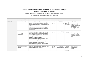 PROGRAM NAPRAWCZY DLA UCZNIÓW KL. I-III OBOWIĄZUJĄCY W ROKU SZKOLNYM 2015/2016 OPRAC. NA PODSTAWIE WNIOSKÓW Z NADZORU PEDAGOGICZNEGO ZA ROK SZKOL. 2014/2015 W ZSP15 W RYBNIKU STANDARD CZYTANIE Czynnośd wymagająca poprawy Umiejętnośd czytania ze zrozumieniem Umiejętnośd czytania ze zrozumieniem poprzez propagowanie czytelnictwa. Pamięciowe opanowanie wierszy Działania prowadzące do uzyskania lepszego wyniku Uczestnicy Osoby odpowiedzialne Termin realizacji działania Dowody realizacji Kontynuowad dw. utrwalające i doskonalące czytanie ze zrozumieniem z wykorzystaniem gotowych tekstów. Zadbad o ich systematyczną realizację. Przeprowadzad szereg dwiczeo oceniających stopieo opanowania umiejętności czytania ze zrozumieniem. Obowiązek prowadzenia dzienniczka lektur wraz z zapisem tytułu książki i jego autora, planu wydarzeo oraz krótkiego opisu wrażeo z lektury ozdobionego ilustracją. Nagradzanie najlepszych czytelników tytułem: Najlepszy Czytelnik w Klasie. Omówienie lektur następuje w ramach zaplanowanych 3- dniowych bloków tematycznych. W związku z Rokiem Czytelnictwa zorganizowad w klasie biblioteczki .Systematycznie ,przynajmniej raz w tygodniu czytad wybrane baśnie i opowiadania. Nauczyciel dba, by uczniowie nauczyli się min. 2 wierszyków w każdym półroczu. ucz. klas I – III n-lki edukacji wczesnoszkolnej raz w tyg. przez cały rok szkolny Krótka notatka w zeszycie przedmiotowym redagowana przez uczniów z pomocą n-la (począwszy od kl. II). W kl. I notatkę podaje nauczyciel. ucz. klas II– III n-lki edukacji wczesnoszkolnej bibliotekarz cały rok szkolny Dzienniczek lektur udostępniony przez wychowawcę do wglądu dyrektorowi Zespołu. Współpraca z bibliotekarzem. ucz. klas I – III n-lki edukacji wczesnoszkolnej cały rok szkolny – dwa razy w semestrze Wpis w dzienniku (osobna kolumna z ocenami) . 1 PISANIE Czytanie ze zrozumieniem treści zadao matematycznych n-lki edukacji wczesnoszkolnej cały rok szkolny Zeszyt przedmiotowy i karty pracy do wglądu rodziców, dyr. szkoły. Nauczyciel dba o dokładne przeanalizowanie z uczniami treści zadao na lekcji. N-l uczy umiejętności czytania ze zrozumieniem tekstów literackich i zadao matematycznych. Zadania do samodzielnej pracy w domu powinny obejmowad materiały /e. polonistycznej, matematycznej itp./ przerabiane na lekcji. Nauczyciel dba o to, by ucz. dobrze opanowali podstawowe działania matematyczne, w tym tabliczkę mnożenia. ucz. klas II – III Kaligrafia W zeszycie przedmiotowym uczeo realizuje dodatkowe dwiczenia z kaligrafii. Nauczyciel zadaje dwiczenie kaligrafii do domu (począwszy od literek przez pojedyncze wyrazy do krótkich tekstów). ucz. klas I – III n-lki edukacji wczesnoszkolnej cały rok szkolny Zeszyt przedmiotowy do wglądu dyr. szkoły z widocznymi oznakami sprawdzania przez wychowawcę. Rozwijanie umiejętności redagowania form wypowiedzi pisemnych i ustnych. Nauczyciel wspólnie z uczniami redaguje notatki z lekcji począwszy od kl. II. ucz. klas II – III n-lki edukacji wczesnoszkolnej cały rok szkolny Zeszyty przedmiotowe. Nauczyciel zadaje uczniom do domu zadania pisemne (na miarę ich możliwości). Ćwiczenia mają za zadanie rozwijanie sprawności językowej, wzbogacenie zasobu słownictwa, wyrabianie poprawności ortograficznej i interpunkcyjnej. Obowiązkiem nauczyciela jest zawsze sprawdzenie tych zadao. ucz. klas I – III n-lki edukacji wczesnoszkolnej cały rok szkolny Zeszyty przedmiotowe. Rozwijanie umiejętności redagowania form wypowiedzi pisemnych i ustnych. N-l systematycznie sprawdza zeszyt ucznia i ocenia go przynajmniej dwa razy w półroczu. ucz. klas I – III n-lki edukacji wczesnoszkolnej Przynajmniej 2 razy w każdym półroczu Wpis (komentarz) n-la z oceną w zeszycie przedmiotowym/ zeszytach dwiczeo. Realizacja materiału wiąże się z systematyczną pracą n-la w zakresie kontroli zad. domowych, zeszytów, zasobu umiejętności i wiedzy ucznia z jednoczesnym przestrzeganiem zasad WSO, biorąc pod uwagę zalecenia PPP. 2 N-l motywuje ucz. do uczenia się i dwiczenia ortografii oraz interpunkcji, przeprowadza raz w m-cu dyktando. Osiągnięcia ucz. ukierunkowują dalsze działania n-la w danym obszarze pracy. Pisanie z pamięci w kl. I ( II półrocze). Ucz. kl. II-III Kształcenie umiejętności rozpoznawania części mowy. N-l wykorzystuje do dwiczenia części mowy różnorodnych plansz, krzyżówek, gotowych tekstów lub notatek zapisywanych w zeszycie przez ucznia. ucz. kl. I-III n-lki edukacji wczesnoszkolnej cały rok szkolny Zeszyt przedmiotowy i karty pracy do wglądu rodziców, dyr. szkoły. Kształcenie logicznego myślenia poprzez rozwiązywanie zadao tekstowych N-l stosuje podczas lekcji gry i zabawy kształcące logiczne myślenie. Uczniowie podczas lekcji / w domu/ rozwiązują zadania tekstowe, ustalają ich rozwiązanie, podają odpowiedź pełnym zdaniem. N-l dokonuje systematycznej kontroli zadao domowych uczniów. Objęcie dzieci wykazujących trudności w nauce wsparciem w postaci możliwości udziału w zajęciach. ucz. kl. I-III n-lki edukacji wczesnoszkolnej cały rok szkolny Zeszyt przedmiotowy i karty pracy do wglądu rodziców, dyr. szkoły. KORZYSTANIE Z INFORMACJI Kształcenie umiejętności posługiwania się źródłem informacji N-l jak najczęściej korzysta podczas lekcji ze słowników, encyklopedii, itp. Nauczyciel wypożycza z biblioteki szkolnej tak często jak to tylko możliwe różnego rodzaju słowniki lub inne źródła informacji. Uczniowie muszą mied możliwośd korzystania ze słownika co najmniej w parach lub małych grupach. ucz. kl. I-III n-lki edukacji wczesnoszkolnej cały rok szkolny Rejestracja wypożyczeo w bibliotece szkolnej. WYKORZYSTYWANIE WIEDZY W PRAKTYCE Określanie położenia przedmiotów w przestrzeni i względem siebie Nauczyciel stosuje gry orientacyjno – porządkowe, również w czasie pobytu na boisku szkolnym lub sali gimnastycznej (podczas lekcji wych