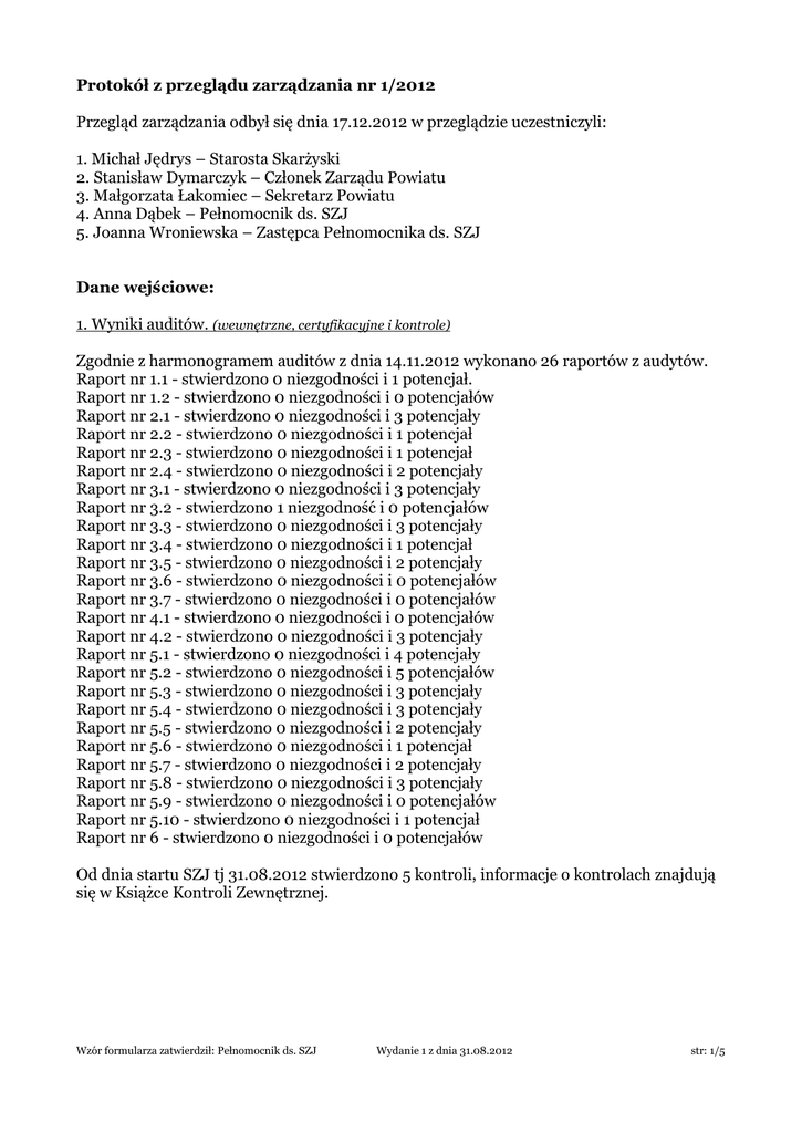 Protokół z przeglądu zarządzania nr 1/2012 Przegląd zarządzania odbył się dnia 17.12.2012 w przeglądzie uczestniczyli: 1. Michał Jędrys – Starosta Skarżyski 2. Stanisław Dymarczyk – Członek Zarządu Powiatu 3. Małgorzata Łakomiec – Sekretarz Powiatu 4. Anna Dąbek – Pełnomocnik ds. SZJ 5. Joanna Wroniewska – Zastępca Pełnomocnika ds. SZJ Dane wejściowe: 1. Wyniki auditów. (wewnętrzne, certyfikacyjne i kontrole) Zgodnie z harmonogramem auditów z dnia 14.11.2012 wykonano 26 raportów z audytów. Raport nr 1.1 - stwierdzono 0 niezgodności i 1 potencjał. Raport nr 1.2 - stwierdzono 0 niezgodności i 0 potencjałów Raport nr 2.1 - stwierdzono 0 niezgodności i 3 potencjały Raport nr 2.2 - stwierdzono 0 niezgodności i 1 potencjał Raport nr 2.3 - stwierdzono 0 niezgodności i 1 potencjał Raport nr 2.4 - stwierdzono 0 niezgodności i 2 potencjały Raport nr 3.1 - stwierdzono 0 niezgodności i 3 potencjały Raport nr 3.2 - stwierdzono 1 niezgodność i 0 potencjałów Raport nr 3.3 - stwierdzono 0 niezgodności i 3 potencjały Raport nr 3.4 - stwierdzono 0 niezgodności i 1 potencjał Raport nr 3.5 - stwierdzono 0 niezgodności i 2 potencjały Raport nr 3.6 - stwierdzono 0 niezgodności i 0 potencjałów Raport nr 3.7 - stwierdzono 0 niezgodności i 0 potencjałów Raport nr 4.1 - stwierdzono 0 niezgodności i 0 potencjałów Raport nr 4.2 - stwierdzono 0 niezgodności i 3 potencjały Raport nr 5.1 - stwierdzono 0 niezgodności i 4 potencjały Raport nr 5.2 - stwierdzono 0 niezgodności i 5 potencjałów Raport nr 5.3 - stwierdzono 0 niezgodności i 3 potencjały Raport nr 5.4 - stwierdzono 0 niezgodności i 3 potencjały Raport nr 5.5 - stwierdzono 0 niezgodności i 2 potencjały Raport nr 5.6 - stwierdzono 0 niezgodności i 1 potencjał Raport nr 5.7 - stwierdzono 0 niezgodności i 2 potencjały Raport nr 5.8 - stwierdzono 0 niezgodności i 3 potencjały Raport nr 5.9 - stwierdzono 0 niezgodności i 0 potencjałów Raport nr 5.10 - stwierdzono 0 niezgodności i 1 potencjał Raport nr 6 - stwierdzono 0 niezgodności i 0 potencjałów Od dnia startu SZJ tj 31.08.2012 stwierdzono 5 kontroli, informacje o kontrolach znajdują się w Książce Kontroli Zewnętrznej. Wzór formularza zatwierdził: Pełnomocnik ds. SZJ Wydanie 1 z dnia 31.08.2012 str: 1/5 2. Informacje zwrotne od klientów. Dane wynikające z badania satysfakcji Klienta zostały opisane w raporcie z dnia 20.10.2012 Założenia: działania korygujące/zapobiegawcze podejmuje się gdy pojawi się ocena 1 lub 2 (skala 1-5) minimum 3 razy dotycząca tego samego zagadnienia lub średnia w będzie niższa niż 3.75. Poziom zadowolenia wyznaczono na minimum 4,3 dla pytania 5 i 6. Wyniki dla pkt. 5: Ogólna ocena standardu obsługi klienta – 4,58 Jakość informacji ułatwiającej dotarcie do odpowiedniego urzędnika – 4,34 Dostęp do druków wniosków i formularzy – 4,41 Czas oczekiwania na obsłużenie – 4,27 Terminowość zamykania spraw – 4,36 Wyniki dla pkt. 6: Kompetencje - znajomość przepisów i procedur – 4,73 Komunikatywność – jasne i wyczerpujące przekazywanie informacji – 4,54 Zaangażowanie w załatwianie sprawy – 4,61 Kultura i uprzejmość urzędnika – 4,66 Szybkość obsługi na stanowisku – 4,56 Od dnia startu SZJ tj 31.08.2012 wpłynęła jedna uzasadniona skarga na Wydział Komunikacji i Transportu, mająca charakter incydentalny. 3. Funkcjonowanie procesów i zgodności wyrobów. Wyniki pomiarów procesów i analiza wyrobów niezgodnych. Miary procesów opisane są w dokumencie „Wykaz najważniejszych celów do realizacji w roku 2012 wyznaczonych przez poszczególne komórki organizacyjne Starostwa Powiatowego w Skarżysku-Kamiennej”. Pomiar nastąpi po końcu roku 2012. Od dnia startu SZJ tj. 31.08.2012 wpłynęło 12 odwołań od decyzji, 8 z nich jest bezzasadnych, a 4 są w rozstrzygnięciu. Od dnia startu SZJ tj. 31.08.2012 nie stwierdzono wyrobów niezgodnych. 4. Status działań korygujących i zapobiegawczych. Wystawiono 1 kartę działań korygujących dotyczącą doprowadzenia do zgodności z przepisami prawa, termin zakończenia 30.06.2012. 5. Przegląd polityki i celów jakości. Polityka jakości i cele jakości pozostają aktualne i adekwatne. 6. Działania podjęte w następstwie wcześniejszych przeglądów zarządzania. Jest to pierwszy przegląd zarządzania. Wzór formularza zatwierdził: Pełnomocnik ds. SZJ Wydanie 1 z dnia 31.08.2012 str: 2/5 7. Wszelkie zmiany w organizacji, które mogą wpływać na SZJ. Zmian nie stwierdzono. 8. Zalecenia dotyczące doskonalenia. 1. Zmiana regulaminu organizacyjnego w celu usystematyzowania kompetencji poszczególnych wydziałów oraz właściwego podziału obowiązków. 2. Opracowanie koncepcji poprawy komunikacji wewnętrznej w Starostwie. 3. Usprawnienie systemu obiegu dokumentów między poszczególnymi wydziałami. 4. Dalsze podnoszenia kompetencji pracowników urzędu poprzez systematyczne szkolenia. 5. Umożliwienie załatwiania większej ilości spraw dla mieszkańców przez telefon i Internet. 6. Opracowanie koncepcji remontu Sali Herbowej . Opracowały: 1. Małgorzata Łakomiec – Sekretarz Powiatu 2. Anna Dąbek – Pełnomocnik ds. SZJ 3. Joanna Wroniewska – Zastępca Pełnomocnika ds. SZJ Dnia 17.12.2012 Wzór formularza zatwierdził: Pełnomocnik ds. SZJ Wydanie 1 z dnia 31.08.2012 str: 3/5 Dane wyjściowe: 1. Doskonalenie skuteczności SZJ i jego procesów. 1. Dziękuję Paniom Małgorzacie Łakomiec, Annie Dąbek, Joanna Wroniewskiej za wdrożenie, udokumentowanie i utrzymywanie SZJ wg ISO 9001 oraz proszę je o ciągłe doskonalenie tego systemu. 2. Proszę komórki organizacyjne w których były przeprowadzane kontrole od dnia startu SZJ tj. 31.08.2012 o wystawienie kart działań korygujących gdy kontrole wykazały istotne zalecenia, nakazy. 3. Proszę p. Małgorzatę Łakomiec o dopilnowanie rozliczenia przez Wydziały najważniejszych celów do realizacji w roku 2012, prz