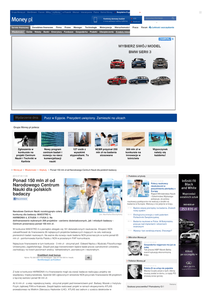 Grupa Money.pl : MenStream Favore BBlog myMoney Bezpłatne E-gazety e-Prawnik iWoman Interaktywnie Platine Market Money Zaloguj się w Money.pl Nowa polityka prywatności wyszukaj informacje Na skróty Serwis finansowy Wiadomości Doradztwo finansowe Giełda Waluty Banki Firma Emerytury Prawo Manager Fundusze Technologie Gospodarka Podatki Motoryzacja Ubezpieczenia Nieruchomości Praca Forum Lekkość oszczędzania Kredyty mieszkaniowe Gotówki Twoje finanse Pucz w Egipcie. Prezydent uwięziony. Zamieszki na ulicach Grupa Money.pl poleca: Zgłoszenia w konkursie na projekt Centrum Nauki i Techniki w Karlinie Money.pl Wiadomości Nowy program centrum badań i rozwoju na rzecz komercjalizacji nauki Artykuły 127 osób z wysokimi stypendiami. To elita NCBR przyznał 250 mln zł na badania stosowane 300 mln zł w konkursie na innowacje w lotnictwie Wypoczynek należy się każdemu! Ponad 150 mln zł od Narodowego Centrum Nauki dla polskich badaczy Podobne artykuły 2013-07-03 11:05 Ponad 150 mln zł od Narodowego Centrum Nauki dla polskich badaczy Recommend Narodowe Centrum Nauki rozstrzygnęło cztery [fot: AlexRaths/iStockphoto] konkursy dla badaczy: MAESTRO 4, HARMONIA 4, ETIUDA 1 i FUGA 2. Na dofinansowanie wybranych 209 projektów - zarówno doświadczonych, jak i młodych badaczy Centrum przeznaczy ponad 150 mln zł. W konkursie MAESTRO 4 o pieniądze ubiegało się 161 doświadczonych naukowców. Eksperci NCN zakwalifikowali do finansowania 26 najlepszych projektów badawczych mających na celu realizację pionierskich badań naukowych. Na ważne dla rozwoju nauki badania NCN przeznaczyło w sumie ponad 65 mln zł - poinformowała Kamila Patoła z NCN w przesłanym PAP komunikacie. Najwyższe finansowanie w tym konkursie - 3 mln zł - otrzymał prof. Edward Nęcka z Wydziału Filozoficznego Uniwersytetu Jagiellońskiego. Zespół pod jego kierownictwem będzie badał proces samokontroli człowieka, zachodzący na trzech poziomach analizy: behawioralnym, poznawczym i neuronalnym. Kreditkort med bonus Nyhet: Få 300 SEK hos Norwegian. Upp till 100 000 kr i kredit. BankNorwegian.se/Kreditkort 2013-03-18 20:49 Polscy naukowcy nieskuteczni w pozyskiwaniu pieniędzy z Europy Raport Ministerstwa Nauki i Szkolnictwa Wyższego pokazuje, że polscy naukowcy praktycznie nie walczą o środki na badania w Europie. Walczą o nie jedynie w kraju. 07:32 Będzie więcej pieniędzy na badania. Znaleźli nowy system 08:43 Ekologiczna energia z rzeki patentem Politechniki Świętokrzyskiej 08:16 Badania naukowe w Polce. W Białymstoku pracuja nad implantami i siłowniami wiatrowymi 18:23 Wysocy i łysi zarabiają więcej. Dlaczego? Mikrofon Money.pl 2013-07-05 06:29 Gospodarka najgorsze ma już za sobą Tak prezes NBP Marek Belka ocenił sytuację ekonomiczną kraju. Felieton Money.pl 2013-07-04 06:30 Z kolei w konkursie HARMONIA 4 o finansowanie mogli się starać badacze realizujący projekty we współpracy międzynarodowej. Spośród 320 zgłoszonych wniosków NCN przyznało finansowanie 68 projektom o łącznej wartości ponad 58 mln zł. Aż 6 mln zł - a więc największą kwotę - otrzymał projekt pod kierownictwem prof. Barbary Wosiek z Instytutu Fizyki Jądrowej PAN w Krakowie. Zespół będzie realizować projekt w ramach eksperymentu ATLAS prowadzonego na Wielkim Zderzaczu Hadronów (LHC). ATLAS jest jednym z sześciu detektorów w Polska B na urlop nie pojedzie Maciej Czujko pisze o tych, którzy muszą zostać w domu, a rządy PO znoszą coraz gorzej. Szukasz pracownika? Pomożemy Ci ! Reklama prowadzonego na Wielkim Zderzaczu Hadronów (LHC). ATLAS jest jednym z sześciu detektorów w akceleratorze cząstek w ośrodku CERN pod Genewą. Dodaj ofertę pracy do Praca.Money.pl Polscy naukowcy działają aktywnie na arenie międzynarodowej. Dzięki rozstrzygniętemu już po raz czwarty konkursowi HARMONIA nasi najlepsi badacze mogą prowadzić projekty naukowe korzystając z doświadczeń kolegów z zagranicy i najlepszych urządzeń badawczych, takich jak Wielki Zderzacz Hadronów - podkreśla dyrektor Centrum, prof. Andrzej Jajszczyk. Ponad 1 400 000 osób poszukujących pracy, ponad 150 000 odbiorców newslettera więcej » Centrum po raz pierwszy rozstrzygnęło konkurs ETIUDA 1. Stypendia na czas przygotowywania rozprawy doktorskiej otrzyma 100 badaczy, w sumie trafi do nich ponad 8 mln zł. Jednym z podstawowych warunków otrzymania stypendium było zaplanowanie przez wnioskodawcę trwającego od 3 do 6 miesięcy stażu w zagranicznym ośrodku naukowym. Laureaci mają już otwarty przewód doktorski i muszą obronić pracę doktorską najpóźniej w ciągu roku po zakończeniu pobierania stypendium. W konkursie FUGA 2 na staże podoktorskie złożono 177 wniosków o finansowanie. NCN przekaże badaczom w sumie ponad 21 mln zł, z czego najwięcej, bo aż 9 mln zł trafi w ręce humanistów. 49 laureatów konkursu będzie odbywać staż poza województwem dotychczasowego zamieszkania lub zatrudnienia. Chcemy wspierać mobilność kadry naukowej w Polsce oraz zwiększać kompetencje badaczy przez ich udział w zespołach naukowych w rożnych częściach kraju. Wyłonieni w konkursie stażyści otrzymali znaczne środki na prowadzenie badań, z których mogą korzystać w sposób niezwykle elastyczny - zaznacza prof. Michał Karoński, przewodniczący Rady NCN. Czytaj więcej w Money.pl Raporty Money.pl Najlepsi dostaną więcej? Rząd chce zmienić... Od ponad dwóch lat działa pakiet ustaw, które zasadniczo zmieniły funkcjonowanie polskiej nauki. 2013-06-27 06:00 TMT, czyli media, technologie i telekomunikacja Wygrywa ten, kto odkrywa zupełnie nową niszę, albo ten, kto dobrze przewidzi potrzeby rynku. [artykuł To wielki krok dla nauki. Mają nowy system Jest szansa na specjalny, ciągły program finansowania niektórych badań. sponsorowany] Klonowanie zarodków. To nie ostatni krok Naukowcy nie powstrzymają się przed sklonowaniem człowieka - uważa profesor 06:00 Rządowi brak
