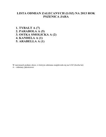 LISTA ODMIAN ZALECANYCH (LOZ) NA 2013 ROK PSZENICA JARA 1. TYBALT A (7) 2. PARABOLA A (5) 3. OSTKA SMOLICKA A (2) 4. KANDELA A (1) 5. ARABELLA A (1) W nawiasach podano okres, w którym odmiana znajdowała się na LOZ (liczba lat) A – odmiany jakościowe PSZENICA JARA – LOZ 2013 TYBALT Odmiana jakościowa (grupa A). Odporność na mączniaka i rdzę brunatną - duża, na septoriozę liści, septoriozę plew, fuzariozę kłosów i choroby podstawy źdźbła - średnia, na rdzę źdźbłową - dość mała. Rośliny niskie do bardzo niskich, o dość dużej odporności na wyleganie. Termin kłoszenia dość późny, dojrzewania średni. Masa 1000 ziarn duża, wyrównanie dość słabe, gęstość w stanie zsypnym mała. Odporność na porastanie ziarna bardzo duża, liczba opadania duża do bardzo dużej. Zawartość białka dość duża, ilość glutenu duża. Wskaźnik sedymentacji SDS duży do bardzo dużego. Ogólna wydajność mąki dość dobra. Plenność bardzo dobra; najlepsza wśród wszystkich obecnie zarejestrowanych odmian tego gatunku. Przedstawiciel hodowcy: Irena Szyld, Kalisz PARABOLA Odmiana jakościowa (grupa A). Odporność na wszystkie ważniejsze choroby średnia. Rośliny średniej wysokości, o przeciętnej odporności na wyleganie. Termin kłoszenia wczesny, dojrzewania dość wczesny. Masa 1000 ziarn bardzo duża, gęstość w stanie zsypnym średnia. Odporność na porastanie ziarna w kłosie mała. Liczba opadania duża do bardzo dużej, zawartość białka duża, wskaźnik sedymentacji SDS bardzo duży. Ilość glutenu duża do bardzo dużej. Plenność dobra. Tolerancja na zakwaszenie gleby dość mała. Hodowca: Małopolska HR-HBP OSTKA SMOLICKA Odmiana jakościowa (grupa A). Plenność dość dobra. Przyrost plonu przy uprawie na wysokim poziomie agrotechniki większy niż średnio dla gatunku. Odporność na septoriozę plew – duża, na rdzę brunatną, brunatną plamistość liści, septoriozę liści, fuzariozę kłosów i choroby podstawy źdźbła – średnia, na mączniaka – dość mała, na rdzę żółtą – mała. Rośliny średniej wysokości, o przeciętnej odporności na wyleganie. Termin kłoszenia średni, dojrzewania dość późny. Masa 1000 ziaren dość duża, wyrównanie dość dobre, gęstość w stanie zsypnym bardzo duża. Odporność na porastanie ziarna dość duża, liczba opadania duża. Zawartość białka i ilość glutenu średnie. Wskaźnik sedymentacyjny SDS bardzo duży. Wydajność ogólna mąki dość słaba. Tolerancja na zakwaszenie gleby przeciętna. Hodowca: HR Smolice. KANDELA Odmiana jakościowa (grupa A). Plenność dobra do bardzo dobrej. Przyrost plonu przy uprawie na wysokim poziomie agrotechniki średni. Odporność na rdzę żółtą – duża do bardzo dużej, na mączniaka i rdzę brunatną – duża, na brunatną plamistość liści, septoriozę liści i plew – średnia, na fuzariozę kłosów oraz choroby podstawy źdźbła – dość mała. Rośliny średniej wysokości, o małej odporności na wyleganie. Termin kłoszenia i dojrzewania średni. Masa 1000 ziaren średnia, wyrównanie dość słabe, gęstość w stanie zsypnym bardzo duża. Odporność na porastanie ziarna przeciętna, liczba opadania duża do bardzo dużej. Zawartość białka i ilość glutenu duże. Wskaźnik sedymentacyjny SDS bardzo duży. Wydajność ogólna mąki dość dobra. Tolerancja na zakwaszenie gleby przeciętna. Hodowca: Danko HR Choryń. ARABELLA Odmiana jakościowa (grupa A). Plenność dobra do bardzo dobrej. Przyrost plonu przy uprawie na wysokim poziomie agrotechniki poniżej średniej. Odporność na mączniaka i rdzę żółtą – duża, na rdzę brunatną – dość duża, na septoriozę liści i plew, fuzariozę kłosów oraz brunatną plamistość liści – średnia, na choroby podstawy źdźbła – dość mała. Rośliny średniej wysokości, o przeciętnej odporności na wyleganie. Termin kłoszenia wczesny, dojrzewania dość wczesny. Masa 1000 ziaren dość mała, wyrównanie przeciętne, gęstość w stanie zsypnym bardzo duża. Odporność na porastanie w kłosie dość mała, liczba opadania duża. Zawartość białka duża, ilość glutenu dość duża. Wskaźnik sedymentacyjny SDS bardzo duży. Wydajność ogólna mąki średnia. Tolerancja na zakwaszenie gleby przeciętna. Hodowca: Danko HR Choryń.