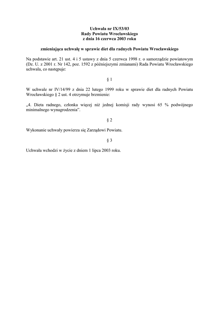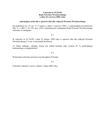 Uchwała nr IX/53/03 Rady Powiatu Wrocławskiego z dnia 16 czerwca 2003 roku zmieniająca uchwałę w sprawie diet dla radnych Powiatu Wrocławskiego Na podstawie art. 21 ust. 4 i 5 ustawy z dnia 5 czerwca 1998 r. o samorządzie powiatowym (Dz. U. z 2001 r. Nr 142, poz. 1592 z późniejszymi zmianami) Rada Powiatu Wrocławskiego uchwala, co następuje: §1 W uchwale nr IV/14/99 z dnia 22 lutego 1999 roku w sprawie diet dla radnych Powiatu Wrocławskiego § 2 ust. 4 otrzymuje brzmienie: „4. Dieta radnego, członka więcej niŜ jednej komisji rady wynosi 65 % podwójnego minimalnego wynagrodzenia”. §2 Wykonanie uchwały powierza się Zarządowi Powiatu. §3 Uchwała wchodzi w Ŝycie z dniem 1 lipca 2003 roku.
