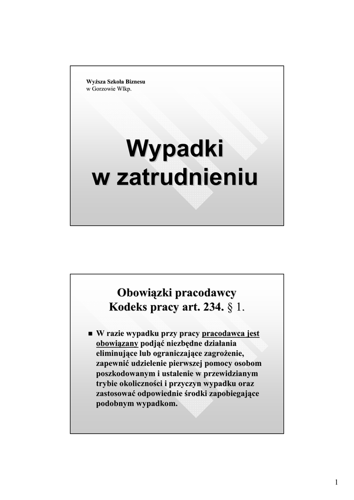 WyŜ WyŜsza Szkoł Szkoła Biznesu w Gorzowie Wlkp. Wypadki w zatrudnieniu Obowiązki pracodawcy Kodeks pracy art. 234. § 1. W razie wypadku przy pracy pracodawca jest obowią obowiązany podjąć podjąć niezbę niezbędne dział działania eliminują eliminujące lub ograniczają ograniczające zagroŜ zagroŜenie, zapewnić zapewnić udzielenie pierwszej pomocy osobom poszkodowanym i ustalenie w przewidzianym trybie okolicznoś okoliczności i przyczyn wypadku oraz zastosować zastosować odpowiednie środki zapobiegają zapobiegające podobnym wypadkom. 1 c.d. § 2. Pracodawca jest obowią obowiązany niezwł niezwłocznie zawiadomić zawiadomić właściwego inspektora pracy i prokuratora o śmiertelnym, cięŜ kim lub cięŜkim zbiorowym wypadku przy pracy oraz o kaŜ kaŜdym innym wypadku, któ który wywoł wywołał wymienione skutki, mają mającym zwią związek z pracą pracą, jeŜ jeŜeli moŜ moŜe być być uznany za wypadek przy pracy. § 3. Pracodawca jest obowią obowiązany prowadzić prowadzić rejestr wypadkó wypadków przy pracy. § 4. Koszty zwią związane z ustalaniem okolicznoś okoliczności i przyczyn wypadkó wypadków przy pracy ponosi pracodawca. Art. 235. § 1. Pracodawca jest obowią obowiązany niezwł niezwłocznie zgł zgłosić osić właściwemu organowi Pań Państwowej Inspekcji Sanitarnej i wł właściwemu inspektorowi pracy kaŜ kaŜdy przypadek rozpoznanej choroby zawodowej albo podejrzenia o taką taką chorobę chorobę. § 2. Obowią Obowiązek, o któ którym mowa w § 1, dotyczy takŜ takŜe lekarza, któ który rozpoznał rozpoznał lub podejrzewa przypadek choroby zawodowej. 2 c.d. § 3. W razie rozpoznania u pracownika choroby zawodowej, pracodawca jest obowią obowiązany: 1. ustalić ustalić przyczyny powstania choroby zawodowej oraz charakter i rozmiar zagroŜ zagroŜenia tą tą chorobą chorobą, dział działają ając w porozumieniu z wł właściwym organem Pań Państwowej Inspekcji Sanitarnej, 2. przystą przystąpić pić niezwł niezwłocznie do usunię usunięcia czynnikó czynników powodują powodujących powstanie choroby zawodowej i zastosować zastosować inne niezbę niezbędne środki zapobiegawcze, 3. zapewnić zapewnić realizację realizację zaleceń zaleceń lekarskich. § 4. Pracodawca jest obowią obowiązany prowadzić prowadzić rejestr zachorowań zachorowań na choroby zawodowe i podejrzeń podejrzeń o takie choroby. Art. 236. Pracodawca jest obowiązany systematycznie analizować przyczyny wypadków przy pracy, chorób zawodowych i innych chorób związanych z warunkami środowiska pracy i na podstawie wyników tych analiz stosować właściwe środki zapobiegawcze. 3 Art. 237. § 1. Rada Ministró Ministrów okreś określi, w drodze rozporzą rozporządzenia: 1. szczegó szczegółowe zasady postę postępowania przy ustalaniu okolicznoś okoliczności i przyczyn wypadkó wypadków przy pracy oraz sposó sposób ich dokumentowania, a takŜ takŜe zakres informacji zamieszczanych w rejestrze wypadkó wypadków przy pracy, 2. wykaz choró chorób zawodowych, 3. szczegó szczegółowe zasady postę postępowania dotyczą dotyczące zgł ł aszania podejrzenia, rozpoznawania i stwierdzania zg choró chorób zawodowych oraz podmioty wł właściwe w tych sprawach. c.d. § 2. Minister wł właściwy do spraw pracy okreś określi, w drodze rozporzą rozporządzenia, wzó wzór protokoł protokołu ustalenia okolicznoś okoliczności i przyczyn wypadku przy pracy zawierają zawierający dane dotyczą dotyczące poszkodowanego, skł składu zespoł zespołu powypadkowego, wypadku i jego skutkó skutków, stwierdzenie, Ŝe wypadek jest lub nie jest wypadkiem przy pracy, oraz wnioski i zalecane środki profilaktyczne, a takŜ takŜe pouczenie dla stron postę postępowania powypadkowego. 4 Art. 237. § 3. Minister właściwy do spraw pracy określi, w drodze rozporządzenia, wzór statystycznej karty wypadku przy pracy, uwzględniając dane dotyczące pracodawcy, poszkodowanego, wypadku przy pracy, a takŜe jego skutków oraz sposób i terminy jej sporządzania i przekazywania do właściwego urzędu statystycznego. Art. 237. § 4. Minister wł właściwy do spraw zdrowia okreś określi, w drodze rozporzą rozporządzenia: 1. sposó sposób dokumentowania choró chorób zawodowych i skutkó skutków tych choró chorób, a takŜ takŜe prowadzenia rejestró rejestrów choró chorób zawodowych, uwzglę uwzględniają dniając w szczegó szczególnoś lności wzory dokumentó dokumentów stosowanych w postę postępowaniu dotyczą dotyczącym tych choró chorób oraz dane obję objęte rejestrem, 2. wytyczne diagnostycznodiagnostyczno-orzecznicze i kryteria rozpoznawania choró chorób zawodowych, uwzglę uwzględniają dniając w szczegó szczególnoś lności rodzaj choroby oraz czynniki szkodliwe i uciąŜ liwe wywoł uciąŜliwe wywołują ujące te choroby. 5 Art. 2371. § 1. Pracownikowi, któ który uległ uległ wypadkowi przy pracy lub zachorował zachorował na chorobę chorobę zawodową zawodową okreś określoną loną w wykazie, o któ którym mowa w art. 237 § 1 pkt 2, przysł przysługują ugują świadczenia z ubezpieczenia społ społecznego, okreś określone w odrę odrębnych przepisach. § 2. Pracownikowi, któ który uległ uległ wypadkowi przy pracy, przysł przysługuje od pracodawcy odszkodowanie za utratę utratę lub uszkodzenie w zwią związku z wypadkiem przedmiotó przedmiotów osobistego uŜ uŜytku oraz przedmiotó przedmiotów niezbę niezbędnych do wykonywania pracy, z wyją wyjątkiem utraty lub uszkodzenia pojazdó pojazdów samochodowych oraz wartoś wartości pienięŜ nych. pienięŜnych. Grupy wypadków: Wypadki przy pracy. Wypadki zrównane z wypadkami przy pracy. Wypadki w szczególnych okolicznościach. Wypadki w drodze do lub z pracy. 6 Definicja wypadku przy pracy: Nagłe zdarzenie wywołane przyczyną zewnętrzną, powodujące uraz lub śmierć, które nas