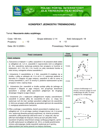 KONSPEKT JEDNOSTKI TRENINGOWEJ Temat: Nauczanie ataku szybkiego. Czas: 100 min. Przybory: Grupa wiekowa: U 14 - 12 Data: 09.12.2009 r. Ilość ćwiczących: 18 - 12 Prowadzący: Rafał Legierski Treść ćwiczenia Czas trwania 1. Ćwiczenie w trójkach + 1 piłka: zawodnik A i B ustawieni obok siebie w odległości ok. 1,5 m. zawodnik C naprzeciwko nich w odległości ok. 4m, zawodnicy wykonują podania bez przyjęcia w truchcie w kolejności: A-C, C-B, B-C, C-A, trucht na całej szerokości boiska w obie strony, następnie zmiana zawodnika 3 5 min Uwagi Część wstępna: 2. Ustawienie 3 zawodników w 1 linii, zawodnik B znajduje się w środku z piłką w odstępie ok. 4 m od A i C, wykonuje podanie w kierunku A i biegnie na jego miejsce, zawodnik A robi to samo w stronę zawodnika C, zaś C w stronę A, podania wykonywane są bez przyjęcia i wew. częścią stopy 2 min 3. Ustawienie j/w: zawodnik w środku podaje piłkę do jednego ze skrajnych i biegnie w jego miejsce, ten przyjmuje dowolnym sposobem i podaje piłkę sposobem półgórnym do drugiego skrajnego i biegnie w jego miejsce 4. Ustawienie j/w z większymi odległościami między zawodnikami: zawodnik A podaje piłkę do zawodnika B wew. cz. stopy ten wykonuje ruch do niej i podaje sposobem półgórnym do zawodnika A, który po przyjęciu piłki podaje ją sposobem górnym do zawodnika C, następuje powtórzenie ćwiczenia - zmiana środkowego co 2 minuty, zwracać uwagę na ruch środkowego do piłki, te same uwagi do ćw. następnego 6 min 6 min 5. Piłka u jednego z zawodników, dwóch pozostałych znajduje się w odległości ok. 1,5 m od niego z jednej i drugiej strony i ok. 2 m przed nim, wykonują dowolną pozycję wyjściową, np. leżenie przodem, zawodnik z piłką wykonuje uderzenie wew. cz. stopy tak, aby tor piłki był równoległy do leżących, którzy po tym jak piłka minie wysokość ich głowy natychmiast wstają i próbują ją dogonić, sprint do piłki wykonywać na odległości ok. 10 m, co każde powtórzenie zmiana uderzającego, każdy zawodnik wykonuje po 4 sprinty, odpoczynkiem jest wolny powrót na miejsca startowe. 4 min Część główna: 1. Zawodnik A wykonuje podanie do zawodnika B ten oddaje piłkę do zawodnika A, który podaje sposobem górnym na dobiegnięcie do zawodnika C, ten po przyjęciu wykonuje dośrodkowanie w pole karne, w którym pozycje zajęli zawodnik A i B odpowiednio na wysokości słupków, oddanie strzału na bramkę, należy zmieniać zawodnika dośrodkowującego, zmieniać strony 10 min 2. Ćw. j/w z dwoma pasywnymi obrońcami w polu karnym 10 min 3. Ćw. można wykonywać na 2 bramki jednocześnie, zawodnicy zmieniają się rolami po każdym powtórzeniu, po 5 min zmian stron, po 10 min chorągiewki zastępują pasywni obrońcy: zawodnik A wykonuje wrzut z linii bocznej do zawodnika B, ten bez przyjęcia odgrywa piłkę wew. cz. stopy do zawodnika C, który również bez przyjęcia zagrywa sposobem górnym piłkę do zawodnika A, który w tym czasie zdążył przemieścić się na wysokość pola karnego, po opanowaniu piłki zagrywa na wys. 14-15 metra pola karnego, gdzie następuje strzał do bramki przez zawodnika B lub C 20 min 4. Podanie od bramkarza do zawodnika A ręką lub nogą, ten 20 min przyjmuje piłkę i zagrywa do zawodnika B, który bez przyjęcia oddaje między chorągiewki stwarzając sytuację 1x1 z bramkarzem, ćwiczenie można realizować po obu stronach boiska, należy pamiętać o zmianie bramkarzy, środkowych i podających, chorągiewki po pewnym czasie mogą zostać zastąpione przez pasywnych obrońców, którzy w miarę upływu czasu ujawniają swoją aktywność Część końcowa: 1. Rzuty rożne po obu stronach bramki, na zmianę, 3-4 nabiegających atakujących i 2 pasywnych obrońców, którzy tylko wykonują ruch w stronę piłki, zadaniem atakujących jest uprzedzenie obrońcy 7 min 2. Gra na połowie boiska 4x2, małe bramki ustawione na liniach bocznych, drużyna atakująca składa się z większej ilości zawodników, jej celem jest przeprowadzanie możliwie jak najszybszych ataków, po 3 minutach korekcja w składach, broniący stają się atakującymi 10 min