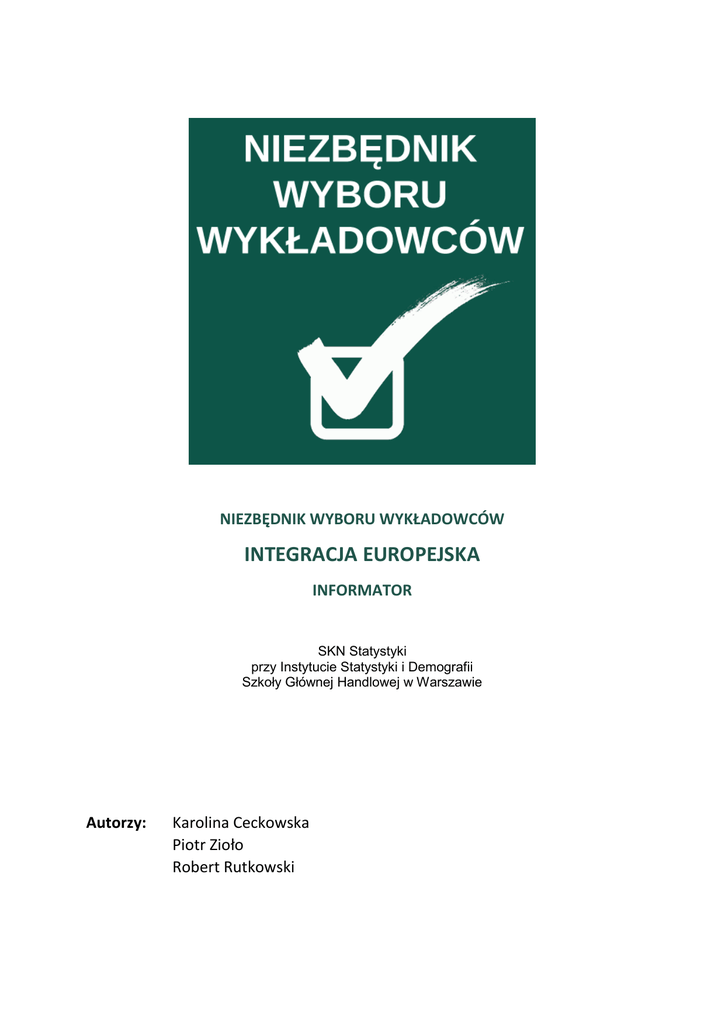 NIEZBĘDNIK WYBORU WYKŁADOWCÓW INTEGRACJA EUROPEJSKA INFORMATOR SKN Statystyki przy Instytucie Statystyki i Demografii Szkoły Głównej Handlowej w Warszawie Autorzy: Karolina Ceckowska Piotr Zioło Robert Rutkowski Wstęp Próba dla całego przedmiotu wynosiła 66 osób. Tak mała liczebność jest spowodowana faktem, iż realizacja tego przedmiotu nie cieszy się dużą popularnością, gdyż jest on wymienny z nauką o państwie. Niestety, prawdopodobnie z uwagi na niedostateczną liczbę obserwacji, nie udało nam się znaleźć wiarygodnych zależności, na przykład pomiędzy oceną z przedmiotu a średnią skumulowaną, ani pomiędzy uczęszczaniem na wykłady a terminem zaliczenia przedmiotu zarówno w skali samego wykładowcy, jaki w skali całego przedmiotu. W związku z tym, została podjęta decyzja, aby stworzyć informator, który ma w sobie najważniejsze informacje dotyczące danego prowadzącego. W informatorze zostały zawarte informację o dwóch wykładowcach, ponieważ tylko w tych dwóch przypadkach liczebność próby pozwala na wyciągnięcie wiarygodnych wniosków. Dr Józef Biskup (26 odpowiedzi) Przedmiot zaliczany jest przez egzamin końcowy (złożony z pytań otwartych) Średnia ocen z egzaminu wyniosła 3,48 15% studentów zaliczyło przedmiot w terminie zerowym, natomiast 19% musiało podejść do drugiego terminu 73% studentów uważa, że zaliczenie przedmiotu wymagało od nich dużego nakładu pracy Według 85% studentów wykład był prowadzony w ciekawy sposób 65% ankietowanych studentów była obecna na większości wykładów 35% uważa, że wykładowca jest „prostudencki” 50% osób wybrałoby tego wykładowcę ponownie Przy wyborze tego wykładowcy studenci kierowali się swoją ambicją Prof. Dr hab. Ewa Latoszek (26 odpowiedzi) Przedmiot zaliczany jest przez referat lub egzamin końcowy (złożony z pytań otwartych) Średnia ocen z egzaminu wyniosła 4,42 46% studentów zaliczyło egzamin w terminie zerowym (lub referatem). Reszta zdała egzamin w pierwszym terminie 11% studentów uważa, że zaliczenie przedmiotu wymagało od nich dużego nakładu pracy 46% osób wybrałoby tego wykładowcę ponownie Według 15% studentów wykład był prowadzony w ciekawy sposób 35% studentów było obecnych na większości wykładów 65% uważa, że wykładowca jest „prostudencki” Przy wyborze tego wykładowcy studenci kierowali się łatwością zaliczenia