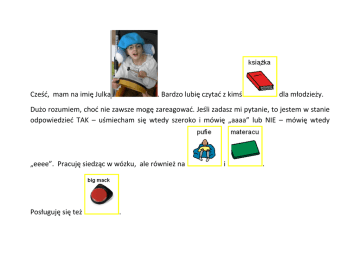 Cześć, mam na imię Julka . Bardzo lubię czytać z kimś dla młodzieży. Dużo rozumiem, choć nie zawsze mogę zareagować. Jeśli zadasz mi pytanie, to jestem w stanie odpowiedzieć TAK – uśmiecham się wtedy szeroko i mówię „aaaa” lub NIE – mówię wtedy „eeee”. Pracuję siedząc w wózku, ale również na Posługuję się też . i .
