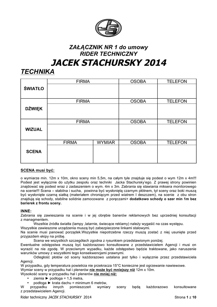 ZAŁĄCZNIK NR 1 do umowy RIDER TECHNICZNY JACEK STACHURSKY 2014 TECHNIKA FIRMA OSOBA TELEFON FIRMA OSOBA TELEFON FIRMA OSOBA TELEFON OSOBA TELEFON ŚWIATŁO DŹWIĘK WIZUAL FIRMA WYMIAR SCENA SCENA musi być: o wymiarze min. 12m x 10m, okno sceny min 5,5m, na całym tyle znajduje się podest o wym 12m x 4m!!! Podest jest wyłącznie do użytku zespołu oraz techniki Jacka Stachursky’ego. Z prawej strony powinien znajdować się podest wraz z zadaszeniem o wym. 4m x 3m. Zabrania się stawiania miksera monitorowego na scenie!!! Scena – stabilna i sucha, powinna być wysłoniętą czarnym płótnem, tył sceny oraz boki muszą być wysłonięte czarną siatką (materiałem chroniącym przed wiatrem I deszczem), na scenie z obu stron znajdują się schody, stabilne solidnie zamocowane z poręczami+ dodatkowo schody o szer min 1m bez barierek z frontu sceny. INNE: Zabrania się zawieszania na scenie i w jej obrębie banerów reklamowych bez uprzedniej konsultacji z managmentem. Wszelkie źródła światła (lampy ,latarnie, świecące reklamy) należy wygaśić na czas występu. Wszystkie zawieszone urządzenia muszą być zabezpieczone linkami stalowymi. Na scenie musi panować porządek.Wszystkie niepotrzebne rzeczy muszą zostać z niej usunięte przed przyjazdem ekipy na próbę. Scena we wszystkich szczegółach zgodna z rysunkiem przedstawionym poniżej. Ewentualne odstępstwa muszą być każdorazowo konsultowane z przedstawicielem Agencji i musi on wyrazić na nie zgodę. W przeciwnym wypadku, każde odstępstwo będzie traktowane, jako naruszenie warunków umowy z wszystkimi tego konsekwencjami prawnymi. Odległość płotów od sceny każdorazowo ustalana jest tylko i wyłącznie przez przedstawiciela Agencji. W przypadku, gdy temperatura powietrza nie przekracza 15°C konieczne jest ogrzewanie nawiewowe. Wymiar sceny w przypadku hal i plenerów nie może być mniejszy niż 12m x 10m. Wysokość sceny w przypadku hal i plenerów nie mniej niż: • ziemia ► podłoga = 1,5 metra, • podłoga ► krata dachu = minimum 6 metrów, W przypadku innych pomieszczeń wymiary sceny będą każdorazowo konsultowane z przedstawicielem Agencji. Rider techniczny JACEK STACHURSKY 2014 Strona 1 z 10 PLAN SCENY JACEK STACHURSKY 2014 EKRAN DIODOWY PODWYŻSZENIE SCENY PERKUSJA na podwyższeniu sceny 12 MIKROFONÓW (patrz imput lista) KLAWISZ na podwyższeniu sceny 2 x D.I,BOX KARTA DZWIĘKOWA 6x D.I.BOX 2 x 230 uu Mix- 4- Klawisz (monitor podłogowy) Mix- 5-Linia XLR do Perkusisty Mix- 6-Drum file PIEC BASOWY na podwyższeniu sceny 1 x D.I.BOX 1x Mikrofon EV RE 20 1 x 230 V u statyw l 1 x Shure SM beta 58 bezprzewodowa Mix- 3 – Bass L (ucho) do Matrix 3 (monitor podłogowy) GITARA AKUSTYCZNA 1 x D.I.BOX WZMACNIACZ GITAROWY VOX 1 x SHURE SM 58 1 x Sennhiser e609 1 x 230 V u WZMACNIACZ GITAROWY MARSCHALL 1 x SHURE SM 58 1 x 230 V u Mix- 2 - Gitara P(ucho) do Matrix 2 (monitor podłogowy) WOKAL GŁÓWNY JACEK STACHURSKY Mix- 1 – Stachursky (ucho) do Matrix 1 (monitor podłogowy) statyw l 1 x Shure BETA 58 bezprzewodowy SCHODY PUBLICZNOŚĆ PUBLICZNOŚĆ LEGENDA: l - statywy z mikrofonami - D.I. BOX u - punkt zasilający 220V – 230V 50 Hz zabezpieczony 16A typ B Rider techniczny JACEK STACHURSKY 2014 Strona 2 z 10 KANAŁY WEJŚCIOWE JACEK STACHURSKY 2014 KANAŁ INSTRUMENT MICOPHONE/ D.I.BOX INSERT F.O.H. VCA /DCA 1 KICK SHURE BETA 52 Gate 1 2 KICK SHURE BETA 91 Gate 1 3 SNARE UP SHURE BETA 57 Compresor 1 4 SNARE DN SHURE SM 57 Compresor 1 5 H/H SHURE SM 81 Compresor 1 6 H/H SHURE SM 81 Compresor 1 7 1. TOM-TOM SHURE BETA 98 Gate 2 8 2. TOM-TOM SHURE BETA 98 Gate 2 9 3. FLOOR-TOM SHURE BETA 98 Gate 2 10 OH AKG C 414/SM 91 Compresor 3 11 OH AKG C 414/SM 91 Compresor 3 12 RIDE AKG C 414/SM 91 Compresor 3 13 BASS XLR Compresor 14 GUITAR VOX L SHURE SM 58 4 15 GUITAR VOX R SENNHISER e609 4 16 GUITAR MARSCHAL SHURE SM 58 4 17 GUITAR AQ D.I.BOX ACTIV BSS 5 18 KEYBOARD D.I.BOX ACTIV BSS 5 19 KEYBOARD D.I.BOX ACTIV BSS 5 20 LINE OUTPUT 1 D.I.BOX ACTIV BSS 5 21 LINE OUTPUT 2 D.I.BOX ACTIV BSS 5 22 LINE OUTPUT 3 D.I.BOX ACTIV BSS 5 23 LINE OUTPUT 4 D.I.BOX ACTIV BSS 5 24 LINE OUTPUT 5 D.I.BOX ACTIV BSS 5 25 LINE OUTPUT 6 D.I.BOX ACTIV BSS 5 26 VOC JACEK Shure Beta 58A Wireless Compresor 27 VOC KEYBOARD Shure Beta 58A Wireless Compresor 28 COMPUTER LINE L D.I.BOX ACTIV BSS 29 COMPUTER LINE R D.I.BOX ACTIV BSS 30/31 LEXICON PCM 91 AES/EBU 32/33 LEXICON PCM 91 AES/EBU 8 Możliwe są drobne zmiany w tabeli kanałów wejściowych FOH i MONITOR !! Rider techniczny JACEK STACHURSKY 2014 Strona 3 z 10 WYMAGANIA TECHNICZNE Niniejszy dokument zawiera niezbędne minimum techniczne, umożliwiające wykonawcom i realizatorom dźwięku przeprowadzenie koncertu na właściwym poziomie artystycznym i technicznym. JACEK STACHURSKY przyjeżdża z realizatorem dźwięku F.O.H. oraz realizatorem MONITOROWYM, technicznymi sceny BACKLINE, mimo to wymagana jest obecność technika znającego dobrze przygotowany system nagłośnieniowy, realizatorów, techników sceny. Aparatura powinna być zainstalowana, wysterowana, uruchomiona, sprawdzona, skonfigurowana zgodnie z riderem (opięcie stołu przodowego i monitorowego) przed przyjazdem zespołu – na około 2 godziny przed planowanym rozpoczęciem próby.Czas próby + montaż backlin‘u 2- 3 godzin. NAGŁOŚNIENIE • • • • • • • • Ważne jest aby cały system nagłośnieniowy (strona lewa + prawa, front fill, out fill) były od jednego producenta i tej samej klasy, aby uniknąć zmiany charakteru dźwięku Rekomendowane systemy: ADAMSON Y18, Y10, EV – X-Array, X-LINE, XLC, XLD, Turbosound Flashlight, EAW KF850, 750, 740, 730. Meyersound - MSL-4, MILO, MICA, , Martin F-2, LAcoustics, Ohm EMLS, DYNACORD, NEXO GEO T-D, JBL V-tec, Coda audio, etc.. Na koncertach plenerowych i halach wymagane są systemy dedykowane do powyższych miejsc (żadnych „małych” systemów np. MEYERSOUND: MELODIE i tym podobne - Niezależnie od miejsca i zastosowanego systemu, MINI
