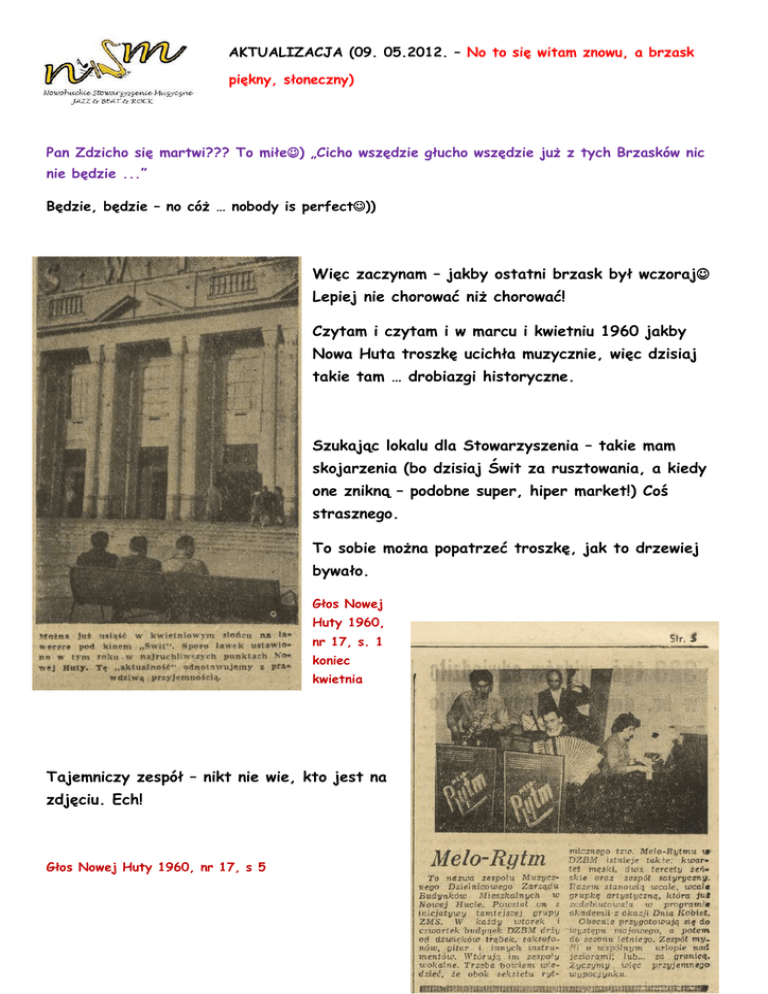 AKTUALIZACJA (09. 05.2012. – No to się witam znowu, a brzask piękny, słoneczny) Pan Zdzicho się martwi??? To miłe☺ ☺) „Cicho wszędzie głucho wszędzie już z tych Brzasków nic nie będzie ...” Będzie, będzie – no cóż … nobody is perfect☺ ☺)) Więc zaczynam – jakby ostatni brzask był wczoraj☺ ☺ Lepiej nie chorować niż chorować! Czytam i czytam i w marcu i kwietniu 1960 jakby Nowa Huta troszkę ucichła muzycznie, więc dzisiaj takie tam … drobiazgi historyczne. Szukając lokalu dla Stowarzyszenia – takie mam skojarzenia (bo dzisiaj Świt za rusztowania, a kiedy one znikną – podobne super, hiper market!) Coś strasznego. To sobie można popatrzeć troszkę, jak to drzewiej bywało. Głos Nowej Huty 1960, nr 17, s. 1 koniec kwietnia Tajemniczy zespół – nikt nie wie, kto jest na zdjęciu. Ech! Głos Nowej Huty 1960, nr 17, s 5 Do wydarzeń muzycznych dokładam audycje z płyt, które w MPiK-u prowadził Jerzy Kaszycki – stereofoniczne audycje. Podobno młodzież waliła tam drzwiami i oknami! Głos Nowej Huty 1960, nr 11, s. 7, 12-18 marca Dziennik Polski 1960, nr 97, s. 10, 24,25 kwietnia I jeszcze otwarcie Jaszczurów – potem tam szalała nowohucko-krakowska Biała Gwiazda! Dokładam kalendarz ówczesny, żeby lepiej się orientować! KALENDARIUM: ROK 1955 1. 27 listopada 1955 – pierwszy koncert quasi jazzowy w Domu Młodego Robotnika 2. 7 grudnia 1955 – koncert zespołu Andrzeja Kurylewicza i Wandy Warskiej w sali Zespołu Pieśni i Tańca na os. C-2 (obecnie os. Górali) 3. 17 grudnia 1955 – ponownie Andrzej Kurylewicz i Wanda Warska, także Zbigniew Cieplik na harmonijce ustnej (sala Teatru Ludowego). ROK 1956 4. Luty 1956 (2 lutego) - Usłyszymy urocze piosenki francuskie i polskie w wykonaniu milutkiej Michel Balard, Polski z Francji, która powróciła do ojczyzny i tym razem śpiewa przy akompaniamencie pierwszego prawdziwie jazzowego zespołu nowohuckiego, wychowanków ZDK…. Koncert w ramach powstałej właśnie Estrady przy Teatrze Ludowym – kierownik artystyczny Jerzy Horecki. 5. 5 marca 1956 – koncert „Błękitnego jazzu” w hali sportowej ZS „Gwardia” oklaskiwało ponad 5 tys. Robotników Huty im. Lenina 6. 12 kwietnia – koncert Zespołu Estradowego z Morawskiej Ostrawy 7. Maj 1956 - koncert autorstwa Stanisława Florka „Kombinat humoru, piosenki, jazzu i tańca” 8. 9 czerwca 1956 r. „Turniej jazzowy” w hali ZS „Gwardia” z udziałem zespołu „Drążek i Pięciu” z Krakowa, zespołu Władysława Kowalczyka z Warszawy i zespołu Jerzego Grzewińskiego z Poznania. Wystąpiła także Jeanne Johnstone. Zapowiadał Leszek Herdegen. No i chyba to jednak HALA WISŁY! 9. Czerwiec 1956 – zespół rytmiczny ZDK HiL gra jazz w Ostrawie (w tym zespole na pewno grał Józef Krzeczek, kto jeszcze – na razie nie wiem, może ktoś wie?) 10. 3, 4, 5 lipca – koncert orkiestry jazzowej Karola Vlacha w hali ZS „Gwardia” w Nowej Hucie. Tutaj także – pewnie jednak Hala Wisły. 11. 24 lipca w Nowej Hucie koncert m.in. orkiestry jazzowej Charlesa Bovery – oczywiście Hala Garaży! 12. Październik – grudzień - konkurs instrumentalistów i zespołów jazzowych i rozrywkowych „Echa Krakowa” oraz Polskiego Radia Kraków. ROK 1957 13. 22 lutego 1957 – jam-session w Nowohuckim Klubie Jazzowym prowadzonym przez Stanisława Florka. Występują zespoły nowohuckie: Kolorowy jazz, Modern Sekstet, zespół kierowany przez Henryka Figla, Taddy Jazz, Jazz-Plastic. Gościnnie: Andrzej Kurylewicz, Lesław Lic, Andrzej Trzaskowski i inni. 14. Marzec – zmiana lokalu ZDK – z ulicy Bulwarowej, z Domu Młodego Robotnika przenosi się do Domu Młodego Hutnika, os. C-2 Południe. 15. 7 kwietnia – impreza w Klubie Jazzowym (DMR? Czy Ognisko Młodych ZMS?) – grają: Kolorowy Jazz, Melodix, Andrzej Trzaskowski, Wojciech Karolak, Jan Byrczek, Jan Chmielewski i inni goście z Krakowa (Kto?) 16. 11 kwietnia – orkiestra Glenna Millera gra w Filharmonii, potem jam-session w Yacht Klubie przy ul. Zwierzynieckiej – obecny m.in. Stanisław Florek, szef właśnie powstałego oficjalnie Nowohuckiego Klubu Jazzowego. Zaś solo na trąbce gra wtedy Józef Krzeczek. 17. 1 maja – koncert „Kolorowego jazzu” na placu obok kina Świt 18. 1 maja – dom kultury ZBM (co to za skrót?) – koncert orkiestry „Błękitny jazz” 19. 13 czerwca – Hala Gwardii – koncert szwajcarskiego zespołu jazzowego „The Tremble kids”. Czy byli w Nowej Hucie? 20. 21 lipca – Hala Garaży – Zgaduj Zgadula – gra zespół jazzowy J. Mazurkiewicza, soliści Dana Lerska i H. Chmielewska, M. Jurga 21. 6 grudnia - jam-session w Ognisku Młodych ZMS, os. Młodości 1. Dominował styl nowoczesny, w którym na szczególną uwagę zasługiwała gra Stanisława Kalwińskiego (bs) i Wojciecha Karolaka (as), natomiast z muzyków nowohuckich wyróżnił się Józef Krzeczek (Tb). 22. 11 grudnia - jam-session w Ognisku Młodych ZMS, os. Młodości 1 z udziałem zachodnio-niemieckiego zespołu Paula Würgesa ROK 1958 23. 6 lutego – zabawa taneczna z zespołem „Rytm” w Klubie Rozrywkowym przy ul. Kocmyrzowskiej 24. 13 marca – jam session w Ognisku Młodych ZMS z udziałem Katarzyny Gaertner i ….. 25. 14, 15 marca – występy zespołu Dave Brubecka w Rotundzie, jam-session w Klubie Literatów 26. Grudzień 1958 – konkurs śpiewaczy, a później zespołów jazzowych i rozrywkowych w Ognisku Młodych ZMS (os. Młodości). ROK 1959 27. W styczniu występował w Arkadii zespół 4 tancerek „Mambo Girls” – podobno z dużym powodzeniem, a najbardziej podobało się hula-hoop i rumba. Hula-hoop – ponieważ ogłaszano w tym zakresie☺ konkurs dla panów. Jakiś Pan pamięta? 28. 18 listopada – koncert orkiestry Andrzeja Kurylewicza z Wandą Warską. Organizował ZDK HiL czyli albo sala Ogniska Młodych, sala ZPiT lub może Hala Garaży. Ktoś pamięta i wie, gdzie to było? ROK 1960 29. 7 stycznia „Świat na jazzowo