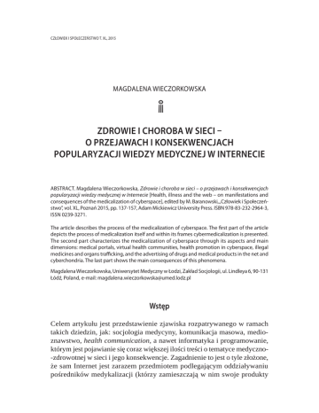 Człowiek i Społeczeństwo t. XL, 2015 Magdalena Wieczorkowska ! Zdrowie i choroba w sieci – o przejawach i konsekwencjach popularyzacji wiedzy medycznej w Internecie ABSTRACT. Magdalena Wieczorkowska, Zdrowie i choroba w sieci – o przejawach i konsekwencjach popularyzacji wiedzy medycznej w Internecie [Health, illness and the web – on manifestations and consequences of the medicalization of cyberspace], edited by M. Baranowski, „Człowiek i Społeczeństwo”, vol. XL, Poznań 2015, pp. 137-157, Adam Mickiewicz University Press. ISBN 978-83-232-2964-3, ISSN 0239-3271. The article describes the process of the medicalization of cyberspace. The first part of the article depicts the process of medicalization itself and within its frames cybermedicalization is presented. The second part characterizes the medicalization of cyberspace through its aspects and main dimensions: medical portals, virtual health communities, health promotion in cyberspace, illegal medicines and organs trafficking, and the advertising of drugs and medical products in the net and cyberchondria. The last part shows the main consequences of this phenomena. Magdalena Wieczorkowska, Uniwersytet Medyczny w Łodzi, Zakład Socjologii, ul. Lindleya 6, 90-131 Łódź, Poland, e-mail: [email protected] Wstęp Celem artykułu jest przedstawienie zjawiska rozpatrywanego w ramach takich dziedzin, jak: socjologia medycyny, komunikacja masowa, medioznawstwo, health communication, a nawet informatyka i programowanie, którym jest pojawianie się coraz większej ilości treści o tematyce medyczno-zdrowotnej w sieci i jego konsekwencje. Zagadnienie to jest o tyle złożone, że sam Internet jest zarazem przedmiotem podlegającym oddziaływaniu pośredników medykalizacji (którzy zamieszczają w nim swoje produkty 138 Magdalena Wieczorkowska i usługi) i podmiotem medykalizującym życie człowieka w różnych jego wymiarach. Ustalenie, co jest przejawem umedycznienia sieci, a co jego konsekwencją, może nastręczać trudności, jednak znaczenie informacji medycznych dla użytkowników Internetu jest bezsprzeczne – wyniki badania „European eHealth Consumer Trends Survey” przeprowadzonego na zlecenie Światowej Organizacji Zdrowia (WHO) w siedmiu krajach członkowskich Unii Europejskiej, opublikowane w 2007 r., pokazują, że 71% użytkowników Internetu wykorzystuje go do poszukiwania informacji o zdrowiu1. Badania Antoniny Doroszewskiej przeprowadzone w Polsce w 2008 r. na próbie ponad 5 tysięcy internautów pokazały, że prawie 90% z nich wykorzystuje Internet jako źródło informacji o zdrowiu i chorobie2. Z kolei Polskie Badania Internetu z 2012 r. dowiodły, że dla 84% użytkowników Internetu był on głównym źródłem ogólnych informacji o zdrowiu, zaś dla 43% także pierwszym źródłem informacji w sytuacji choroby3. Nie byłoby to możliwe, gdyby nie istniały strony poświęcone tej tematyce. Internet i medycyna Internet stał się ważnym obszarem publikowania treści o tematyce medyczno-zdrowotnej. Medium to posiada cechy, które sprzyjają umieszczaniu takich treści i korzystaniu z nich. Formuła MEDIUM4 mówi, że Internet jest: – Mass (masowy, globalny) – daje możliwość dotarcia do bardzo dużych grup ludzi rozproszonych przestrzennie, – Economic (ekonomiczny) – jest tani, jeśli chodzi o koszty publikowania, a także korzystania z jego zawartości, – Direct (bezpośredni) – dociera prosto do odbiorcy zwykle w takiej formie, w jakiej został nadany (ze względu na małą kontrolę treści w Internecie), H.K. Andreassen, M.M. Bujnowska-Fedak, C.E. Chronaki, R.C. Dumitru, I. Pudule, S. Santana, H. Voss, R. Wynn, European citizens’ use of E-health services: A study of seven countries, „BMC Public Health” 7 (53)/2007, http://www.biomedcentral.com/14712458/7/53 [15.06.2015]. 2 A. Doroszewska, Wpływ Internetu na zachowania w zdrowiu i chorobie, w: K. Popielski, M. Skrzypek, E. Albińska (red.), Zdrowie i choroba w kontekście psychospołecznym, Lublin 2010, ss. 299-311. 3 A. Garapich, Internet a decyzje zakupowe – rola Internetu w procesie zakupu leków i preparatów zdrowotnych, Warszawa 2012, http://www.pbi.org.pl/ [15.06.2015]. 4 R. Nowacki, Reklama. Podręcznik, Warszawa 2006. 1 Zdrowie i choroba w Sieci – o przejawach i konsekwencjach popularyzacji wiedzy medycznej... 139 – Interactive (interaktywny) – umożliwia nie tylko bierny odbiór treści, ale także czynne uczestnictwo w procesie komunikacji. Należy jednak pamiętać o specyfice komunikacji w Sieci – może być ona oparta na słowie pisanym (np. e-maile, czaty, komentarze pod artykułami; aby wzbogacić przekaz używa się specjalnych znaków, tzw. emotikonów, które mają pokazać uczucia rozmówcy), przekazie słownym (np. niektóre komunikatory dają możliwość rozmowy podobnej do rozmowy telefonicznej) bądź przekazie audiowizualnym (np. telekonferencja, która ma prawie wszystkie cechy typowej komunikacji twarzą w twarz, z wyjątkiem kontaktu fizycznego), – Ultrafast (ultraszybki) – umożliwia szybkie docieranie ważnych informacji do odbiorcy i ich archiwizowanie (i powrót do treści, które są już nieaktualne), – Measurable (mierzalny) – oferuje wiele instrumentów (od najprostszych liczników wejść na stronę po skomplikowane algorytmy informatyczne) pozwalających monitorować częstość odwiedzin strony, popularność artykułów i publikacji, poziom satysfakcji z usług czy kolejność odwiedzanych stron. Przedstawiony model nie uwzględnia jeszcze jednej cechy, jaką jest anonimowość. W przypadku treści o charakterze medycznym jest to element niezwykle istotny. Internet umożliwia korzystanie z różnych form komunikacji. W ujęciu Petera J. Murraya są to: – komunikacja jednostronna – nadawca komunikatu nie zwraca się bezpośrednio do odbiorcy przekazu, a tym samym nie oczekuje od niego odpowiedzi. Ta forma komunikacji jest charakterystyczna dla stron www, baz dan
