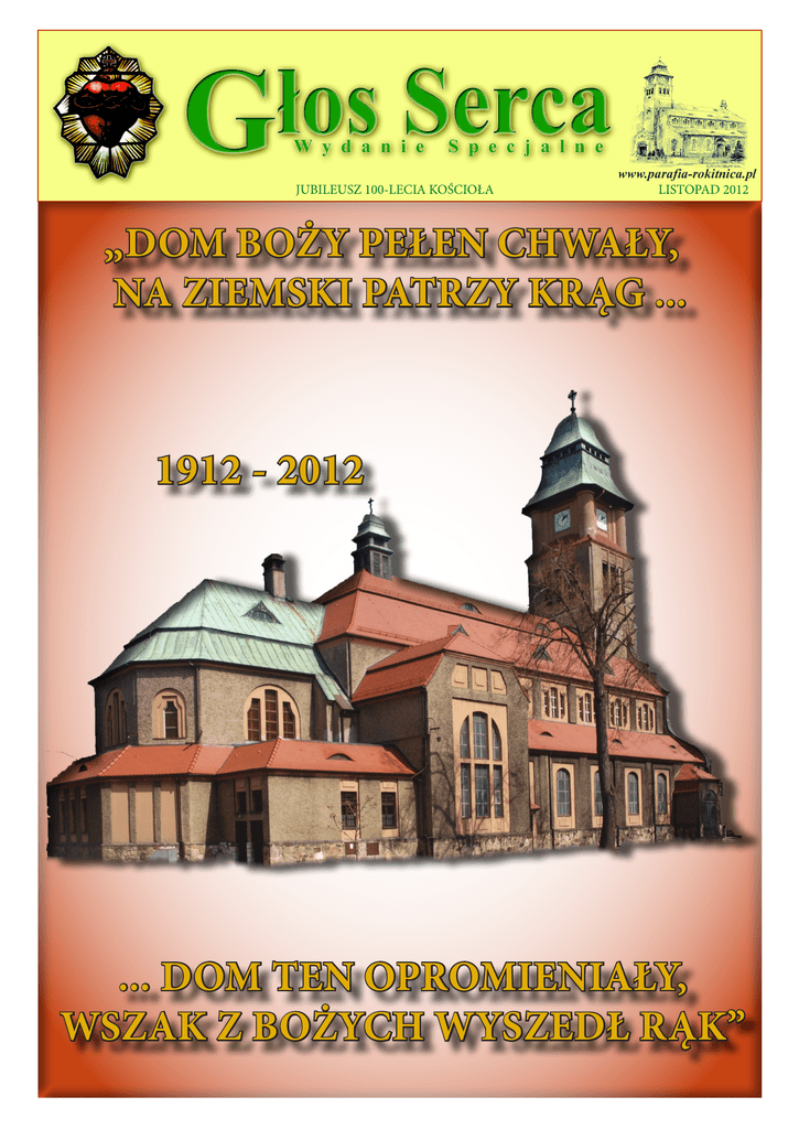 JUBILEUSZ 100-LECIA KOŚCIOŁA LISTOPAD 2012 „DOM BOŻY PEŁEN CHWAŁY, NA ZIEMSKI PATRZY KRĄG ... 1912 - 2012 ... DOM TEN OPROMIENIAŁY, WSZAK Z BOŻYCH WYSZEDŁ RĄK” 2 Wyjątkowy rok, wyjątkowa rocznica dla naszego kościoła Jubileusz stulecia! Ten rok jest szczególny dla naszej parafii, bo właśnie w czasie jego trwania, a dokładnie 17 listopada 2012 roku, dana jest nam łaska świętowania stu okrągłych lat ukończenia budowy i poświęcenia naszego kościoła. Dzięki tej rocznicy jeszcze pełniej stajemy się dziedzicami wielkiej hojności Bożej. ALEKSANDRA POŁOCZAŃSKA C ofnijmy się w czasie o sto lat. Jak głosi „Posłaniec niedzielny”, ówczesny tygodnik katolicki, dnia 17 listopada 1912 roku, o godzinie m.in. hrabiego Ballestrema, dyrektora górniczego Kocksa, dyrektora generalnego Pielera, jak i twórcy naszego kościoła profesora dr Kühna Gazeta z 1912 r. 8:30 zawołały czyste dźwięki dzwonów kościelnych by zgromadzić nie tylko rokitniczan należąc ych do dopiero co wybudowanego kościoła, lecz także wszystkich zainteresowanych z okolic i dalszych stron, a wszystko to, po to, by okazać serdeczny współudział w pierwszym dniu narodzin tego pięknego kościoła. Jak donosi „Posłaniec”, na twarzach zgromadzonych odbijała się radość wewnętrzna, ujawniająca wyraźnie, jak bardzo każdy czuł potrzebę posiadania odtąd własnej świątyni. Ta wielka uroczystość nie mogła się odbyć bez wyższych osobistości, które swym przybyciem lub wysłaniem przedstawicieli objawili swe żywe zainteresowanie tym dziełem. Tego dnia nie zabrakło obecności z Drezna, a także naczelnika urzędu dr Lazarka. Punktualnie o godzinie 9 poświęcenia świątyni dokonał ks. radca Emanuel Buchwald. Po odśpiewaniu przeznaczonych na tę uroczystość pieśni gregoriańskich otwarto zgromadzonemu tłumnie ludowi bożemu uroczyście drzwi kościoła. Wnet obszerna świątynia zapełniła się po brzegi po to, by przeżywać pierwszą w dziejach tej świątyni uroczystość. Pierwsze kazanie wygłosił ks. proboszcz Kubis z Bytomia Bobrka. Po uroczystości kościelnej odbyła się na probostwie uczta, podczas której to przemówił ówczesny, a zarazem pierwszy proboszcz - ks. Ernest Lange. W słowach najserdeczniejszego podziękowania i niekłamanej radości wewnętrznej wyraził On w imieniu parafian najserdeczniejsze podziękowanie wszystkim tym, którzy w jakikolwiek sposób umożliwi tak szybką budowę naszej świątyni. Tyle z historii. Istota rocznicy Zatrzymajmy się na chwilę nad znaczeniem słowa „jubi l e us z”. We d ł u g Starego Testamentu rok jubileuszowy to czas przywrócenia Bożego porządku. Bóg chce, żeby każdy Izraelita odzyskał wolność i ziemię - Jego dary, bez których Izrael nie byłby sobą. Ten biblijny wzór jest też podstawą do chrześcijańskiego świętowania jubileuszu. Rok jubileuszowy w Kościele to dla chrześcijan czas, by przywrócić w sercach pierwotny Boży porządek. Najpierw w wymiarze indywidualnym a również w wymiarze wspól- noty. Jednak najważniejsze nie są odremontowane świątynie, obchody „ku czci”, wmurowane tablice i odsłonięte pomniki najważniejsze jest to, co dzieje się w sercu człowieka i w myśleniu wspólnoty. Warto tu zauważyć, że jubileusz wymaga od człowieka wysiłku. Świadectwem tego jest już sam fakt, że jubileusz nie zaczynał się w święto związane ze świąteczną ucztą tylko w pokutny, postny dzień przebłagania. Dlatego też przygotowując się do naszego jubileuszu ks. proboszcz zorganizował misje święte. Jubileusz to wielka chwila wdzięczności za dar kościoła na naszej rokitnickiej ziemi, zwłaszcza za wiarę i trud naszych przodków. Ale to także spojrzenie w przyszłość przez pryzmat historii, która nas stworzyła i nadal tworzy. Nasi przodkowie przez wiarę budując kościół, dali nam „korzenie” i „skrzydła”! „Korzenie”, abyśmy wiedzieli, gdzie jest nasz dom - Boży i ludzki, zaś „skrzydła”, abyśmy wiarą niesieni urzeczywistniali to, czego nauczyliśmy się w domu - Bożym i ludzkim. Mam nadzieję, że obchody jubileuszu głęboko zapadną w sercach naszych parafian, a także wszystkich gości, którzy wraz z nami w tym dniu śpiewają szczere i pełne wdzięczności „Te Deum Laudamus”. Pierwsza widokówka kościoła z 1912 r. 3 Zacheuszki - miejsca namaszczenia Znaki dedykacyjne PAULINA KWAŚNIEWSKA Nasza Parafia obchodzi właśnie 100-lecie poświęcenia kościoła. Warto przy tej okazji zwrócić uwagę na niewielkie, złote symbole na wewnętrznych ścianach świątyni, znajdujące się w dwunastu różnych miejscach. To zacheuszki - miejsca, w których biskup, podczas poświęcenia świątyni przed stu laty, kreślił świętym olejem znaki krzyża. Miejsca namaszczeń oznaczano dotąd w różny sposób. Stosowano kamienne płyty z rytowanym w nich znakiem krzyża. Czasami zacheuszki malowano bezpośrednio na tynku. Na ścianach nieotynkowanych, miejsca konsekracji oznaczano drewnianymi bądź metalowymi krzyżykami, te z kolei wykonane były często w formie kutych kinkietów z miejscem na świecę. Zacheuszki malowane na tynku przyjmowały formę krzyża równoramiennego wpisanego w koło. Niekiedy ramiona krzyża rozszerzały się nieco na końcach. Rysunek, zazwyczaj jednokolorowy, konturowy, imitował r yt wykonany na kamieniu. Nazwa zacheuszki pochodzi od Zacheusza - celnika, który przyjął Jezusa w swoim domu. Był on zwierzchnikiem celników w Jerychu. Gdy Jezus przechodził przez miasto, zapowiedział swą wizytę u Zacheusza, a ten oświadczył wówczas, iż połowę swego majątku odda ubogim, a skrzywdzonych przez siebie wynagrodzi poczwórnie. Po tych słowach Jezus nazwał go prawdziwym synem Abrahama. Dawniej namaszczenia ścian i ołtarza dokonywał wyłącznie biskup. Kreślił na ścianach kościoła oraz ołtarza Świętym olejem niewielkie krzyże równoramienne. Obrzęd zwyczajowo z