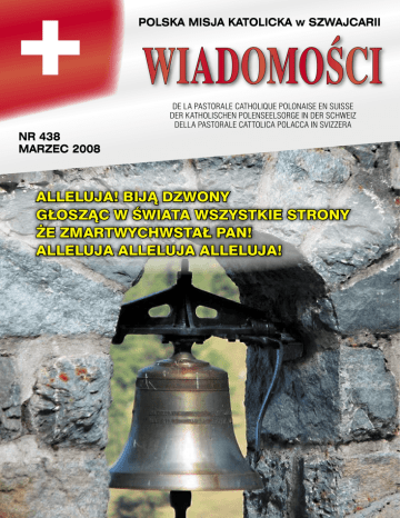 POLSKIEMISJA DUSZPASTERSTWO KATOLICKIE POLSKA KATOLICKA w SZWAJCARII w SZWAJCARII WIADOMOŚCI NR 438 431 NR LIPIEC - SIERPIEŃ 2007 MARZEC 2008 DE LA PASTORALE CATHOLIQUE POLONAISE EN SUISSE DE LA PASTORALE CATHOLIQUE POLONAISE EN SUISSE DER KATHOLISCHEN POLENSEELSORGE IN DER SCHWEIZ DER KATHOLISCHEN POLENSEELSORGE IN DER SCHWEIZ DELLA PASTORALE CATTOLICA POLACCA IN SVIZZERA DELLA MISSIONE CATOLICA POLACCA DI SVIZZERA ALLELUJA! BIJĄ DZWONY GŁOSZĄC W ŚWIATA WSZYSTKIE STRONY ŻE ZMARTWYCHWSTAŁ PAN! ALLELUJA ALLELUJA ALLELUJA! WIADOMOŚCI – NR 438 (MARZEC) 1 2 WIADOMOŚCI – NR 438 (MARZEC) SŁOWO KSIĘDZA REKTORA Drodzy Czytelnicy Już niedługo Wielkanoc. Najważniejsze Święto dla Chrześcijan. Drogocenny czas, pozwalający głębiej zrozumieć sens i cel naszego życia. To czas, kiedy uświadamiamy sobie, że bez zmartwychwstania wszystkie uroczystości, święta nie mają większego sensu. Pisał już o tym św. Paweł w Liście do Koryntian: „Jeśli Chrystus nie zmartwychwstał, daremne jest nasze nauczanie, próżna jest także wasza wiara” (1 Kor 15,14). Dlatego w tym numerze „Wiadomości” dużo miejsca poświęciliśmy na informacje o rekolekcjach w PMK, tekstom o znaczeniu Triduum Paschalnego, głębokim przemyśleniom bpa Józefa Zawitkowskiego i Ojca Bocheńskiego na temat Wielkiej Nocy. Tak wielu naszych Czytelników ceni sobie ten pokarm duchowy, który staramy się podawać w każdym numerze Wiadomości. Założyciel naszej Misji mówił o takich ludziach: „Ci, którzy mają odwagę myśleć”. Nasi Czytelnicy stawiają nam wysokie wymagania, ale to bardzo dobrze, bo przecież pracując nad naszym miesięcznikiem, każdy z nas rozwija siebie. Trafnie ujął to wielki filozof Seneka: „Ucząc innych uczymy siebie”. Chociaż nadal nie brakuje trudności, to przecież radość z faktu, że jest dla kogo pracować - jest dużo większa. Radość tym cenniejsza, że pojawiają się nowi ludzie, którzy spieszą z pomocą. Chciałbym w tym miejscu serdecznie podziękować każdemu, kto choćby w najmniejszym stopniu przyczynił się do tworzenia i propagowania „Wiadomości”. Niech radość i pokój, którymi obdarza Zmartwychwstały, będą najpiękniejszym uznaniem i podziękowaniem za Wasz wkład i poświęcenie. Cieszy mnie to, że otrzymujemy fantastyczne świadectwa od ludzi świeckich. W niniejszym numerze naprawdę warto przeczytać - i to nie jeden raz –refleksję pt.: „Życie odkryte na nowo”. Refleksja nad tym głębokim w swej wymowie tekstem może stać się swoistym skupieniem rekolekcyjnym: podniesie na duchu i pozwoli dostrzec działanie Pana Boga we własnym życiu. Świadectwa, które prezentujemy, mają na celu pokazanie, że są ludzie - tacy jak my - którzy z wielkich prób życiowych wyszli zwycięsko. Ich doświadczenie może dodać wiary tym osobom, które zmagają się z trudnymi sytuacjami w swoim życiu. Na uwagę zasługuje wywiad z Panem Jerzym Gorgoniem, słynnym polskim piłkarzem, który jest związany z Ośrodkiem Duszpasterskim w St. Gallen. Na wolne chwile polecamy tekst zachęcający do zdrowego stylu życia, oparty na doświadczeniu fizjoterapii praktycznej w gabinecie Państwa Majorów zaangażowanych w Ośrodku Duszpasterskim Biel-Bern. Od samego początku mojej posługi w Szwajcarii staram się kłaść duży nacisk na pielęgnowanie pamięci o Polkach i Polakach, którzy swoim życiem realizowali dewizę ś.p. bpa Jana Chrapka: „Idź przez życie tak, aby ślady twoich stóp przetrwały Cię”. W obecnym numerze „Wiadomości” przejdziemy „śladami” dwóch wybitnych Polaków, pana profeso- ra Tadeusza Zawadzkiego i pana Zygmunta Kąpały, którzy pozostawili po sobie niezapomniane wspomnienia. Miesiąc styczeń i luty obfitował w wiele bardzo ważnych spotkań, dotyczących relacji między Polską Misją Katolicką a Kościołem Szwajcarskim. Spotykałem się z wielką otwartością i zrozumieniem dla sytuacji Polskiej Misji w Szwajcarii. Rozmowy, które prowadziliśmy, choć obiecujące, to jednak sięgały daleko w przyszłość: dotyczyły mianowicie roku 2009 i 2010. Taka jest bowiem praktyka u Szwajcarów, że wszystkie sprawy ustala się z dużym wyprzedzeniem. Obecnie naszym zadaniem jest dotrwać do Nowego Roku 2009. Dlatego serdecznie dziękuję tym wszystkim, którzy rozumieją, że na całą Szwajcarię mamy tylko jeden etat i poprzez ofiary przesyłane na konto Misji, czy też składane na tacę sprawiają, że możemy angażować Księży studentów, a praca duszpasterska w naszych Ośrodkach rozwija się. Wydaje się, że najbliższe miesiące powinny zaowocować bardziej konkretnymi rozwiązaniami, o których postaram się jak najszybciej Państwa poinformować. Strona internetowa Polskiej Misji Katolickiej w Szwajcarii: www.polskamisja.ch cieszy się ogromnym zainteresowaniem. Dlatego jesteśmy bardzo wdzięczni tym wszystkim, którzy angażują się w jej przygotowanie i aktualizowanie. W tym kontekście wyrażamy uznanie dla Rady Duszpasterskiej Ośrodka w Bazylei. W ostatnim czasie otrzymaliśmy informacje o dużym spadku powołań w Polsce. Za kilka tak mała liczba powołań będzie miała konsekwencje także dla duszpasterstwa PMK. Reagujemy na tę nową sytuację bardzo szybko, aby w przyszłości nie być posądzonym o brak wyobraźni i działania. Ufam, że Fundusz Stypendialny PMK spełni swoje zadania. Na nadchodzące Święta Wielkanocne, składam Wam, Drodzy Czytelnicy, najserdeczniejsze życzenia. Niech Chrystus Zmartwychwstały będzie źródłem Waszej nadziei, niech obdarzy Was radością i pokojem. Wasz Rektor Ks. Sławomir Kawecki WIADOMOŚCI – NR 438 (MARZEC) 3 Z ŻYCIA KOŚCIOŁA POWSZECHNEGO Benedykt XVI MEDYTACJA O ZNACZENIU TRIDUUM PASCHALNEGO motności, po której przyszło nocne aresztowanie i początek bolesnej drogi na Kalwarię. Triduum Paschalne jest centrum całego roku liturgicznego. Obrzędy Wielkiego Czwartku i uroczystej Wigilii Paschalnej pomog