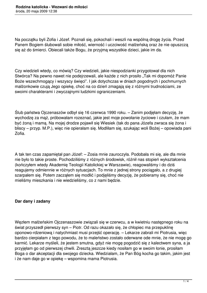Rodzina katolicka - Wezwani do miłości środa, 20 maja 2009 12:38 Na początku byli Zofia i Józef. Poznali się, pokochali i weszli na wspólną drogę życia. Przed Panem Bogiem ślubowali sobie miłość, wierność i uczciwość małżeńską oraz że nie opuszczą się aż do śmierci. Obiecali także Bogu, że przyjmą wszystkie dzieci, jakie im da. Czy wiedzieli wtedy, co mówią? Czy wiedzieli, jakie niespodzianki przygotował dla nich Stwórca? Na pewno nawet nie podejrzewali, ale każde z nich prosiło „Tak mi dopomóż Panie Boże wszechmogący i wszyscy święci”. I jak dotychczas w dniach pogodnych i pochmurnych małżonkowie czują Jego opiekę, choć na co dzień zmagają się z różnymi trudnościami, ze swoimi charakterami i zwyczajnymi ludzkimi ograniczeniami. Ślub państwa Ojczenaszów odbył się 16 czerwca 1990 roku. – Zanim podjęłam decyzję, że wychodzę za mąż, próbowałam rozeznać, jakie jest moje powołanie życiowe i czułam, że mam być żoną i mamą. Na mojej drodze pojawił się Wiesiek (tak do pana Józefa zwraca się żona i bliscy – przyp. M.P.), więc nie opierałam się. Modliłam się, szukając woli Bożej – opowiada pani Zofia. A tak ten czas zapamiętał pan Józef: – Zosia mnie zauroczyła. Podobała mi się, ale dla mnie nie było to takie proste. Pochodziliśmy z różnych środowisk, różnił nas stopień wykształcenia (kończyłem wtedy Akademię Teologii Katolickiej w Warszawie), reagowaliśmy i do dziś reagujemy odmiennie w różnych sytuacjach. To mnie z jednej strony pociągało, a z drugiej szarpałem się. Potem zacząłem się modlić i podjęliśmy decyzję, że pobieramy się, choć nie mieliśmy mieszkania i nie wiedzieliśmy, co z nami będzie. Dar dany i zadany Węzłem małżeńskim Ojczenaszowie związali się w czerwcu, a w kwietniu następnego roku na świat przyszedł pierwszy syn – Piotr. Od razu okazało się, że chłopiec ma przepuklinę oponowo-rdzeniową i natychmiast musi przejść operację. – Lekarze zabrali mi Piotrusia, więc bardzo cierpiałam z tego powodu, że to maleństwo zostało oderwane ode mnie, że nie mogę go karmić. Lekarze myśleli, że jestem smutna, gdyż nie mogę pogodzić się z kalectwem syna, a ja przyjęłam go od pierwszej chwili. Zresztą jeszcze kiedy nosiłam go w swoim łonie, prosiłam Boga o dar akceptacji dla swojego dziecka. Wiedziałam, że Pan Bóg kocha go takim, jakim jest i że nam daje go w opiekę – wspomina mama Piotrusia. 1/4 Rodzina katolicka - Wezwani do miłości środa, 20 maja 2009 12:38 Dla pana Józefa nie było to takie proste. Czekał na swoje pierwsze, wymarzone dziecko i przeżył wstrząs. – Pogodzenie się z wolą Bożą przychodziło stopniowo. Dopiero po czasie zrozumiałem, że dar, na który czekałem, przerasta mnie, że muszę do niego dorosnąć. Zrozumiałem, że Piotruś jest darem nam danym i zadanym. Szybko dojrzewałem w tej sytuacji, bo zostałem wezwany do miłości o jakiej nawet nie myślałem – wyznaje. Otwarci na życie Kiedy mały Piotr przebywał w szpitalu w Krakowie-Prokocimiu, został zarażony żółtaczką. Wtedy też tą chorobą zaraziła się od dziecka pani Zofia. Kiedy choroba stała się widoczna, młoda mama była w pierwszym trymestrze ciąży. Musiała zostawić męża i Piotrusia i ponad trzy tygodnie leżała w szpitalu na oddziale zakaźnym. Martwiła się, że w domu zostawiła najbliższych... 25 sierpnia 1992 roku na świat przyszedł Andrzej. Już kilka miesięcy później malec „łobuzował” ze swoim starszym bratem Piotrem. Chłopcy – jako że Piotr rozwijał się nieco wolniej – do pewnego momentu byli jak bliźniacy... Potem na świat przyszli Ania, Małgosia, Michał i ostatnio Krysia. – Pomiędzy Michałem i Krysią jest osiem lat różnicy. Przez kilka lat więc dzieciom brakowało jeszcze jednej siostrzyczki. Cztery lata prosiły o nią Boga, aż wyprosiły. Teraz są z niej dumne i pomagają przy małej jak mogą – cieszą się rodzice. Krysia wędruje z rąk do rąk, ciesząc rodzinę. Kiedy maleństwo staje się głodne, trafia do maminej piersi i przytulone ssie, a w rączce bezwiednie trzyma krzyżyk i szkaplerz wiszący na szyi mamy. Od czasu do czasu przestaje, wsłuchuje się w to, co mówi mama, i słodko się uśmiecha... - Jestem zadowolona ze swojego życia. Każdego dnia czuję, że jestem potrzebna dzieciom, że dla nich żyję – podkreśla szczęśliwa mama. – Mamy dziś sześcioro dzieci, ale jesteśmy otwarci na każde życie. Nie ma bowiem w życiu piękniejszej przygody niż uczestniczenie wraz z Panem Bogiem w akcie stwórczym człowieka – mówi pan Józef. Dom otoczony modlitwą 2/4 Rodzina katolicka - Wezwani do miłości środa, 20 maja 2009 12:38 Mieszkanie Państwa Ojczenaszów pełne jest ludzi. Odczuwa się w nim jednak pewien spokój. Z czego on płynie? Może od Pana Jezusa, Maryi i świętych, którzy z obrazów powieszonych na ścianach patrzą na wszystkich domowników? A może z modlitwy, która o różnej porze dnia i nocy płynie z tego miejsca do Boga? - W naszym codziennym życiu doświadczamy ułomności, swoich grzechów, zniecierpliwienia. Czasem trudno mnie samej skupić się na modlitwie, czasem trudno całą gromadę zachęcić do modlitwy. Wtedy denerwuję się, a potem jest mi głupio. I w tych sytuacjach doświadczamy miłosierdzia Pana Boga – podkreśla pani Zofia. „Prosili i otrzymali...” Grudzień 2007 roku zapisał się w rodzinie Ojczenaszów cierpieniem. Któregoś dnia wcześnie rano w ich domu zadzwonił telefon i teściowa pani Zofii (do której pojechał pan Józef, a która mieszka 600 kilometrów od Krakowa na Mazurach) powiedziała wówczas swojej brzemiennej synowej, że jej mąż – jedyny żywiciel rodziny – jest w krytycznym stanie. – Lekarze nie dawali mu wielu szans na to, że będzie żył. Wyniki badań były bardzo złe. Zapalenie mózgu, zapalenie płuc, opłucnej nie dawały dobryc