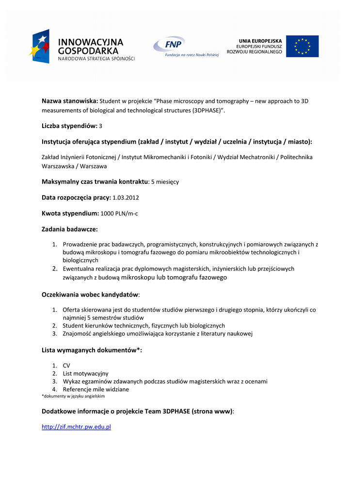 Nazwa stanowiska: Student w projekcie “Phase microscopy and tomography – new approach to 3D measurements of biological and technological structures (3DPHASE)”. Liczba stypendiów: 3 Instytucja oferująca stypendium (zakład / instytut / wydział / uczelnia / instytucja / miasto): Zakład Inżynierii Fotonicznej / Instytut Mikromechaniki i Fotoniki / Wydział Mechatroniki / Politechnika Warszawska / Warszawa Maksymalny czas trwania kontraktu: 5 miesięcy Data rozpoczęcia pracy: 1.03.2012 Kwota stypendium: 1000 PLN/m-c Zadania badawcze: 1. Prowadzenie prac badawczych, programistycznych, konstrukcyjnych i pomiarowych związanych z budową mikroskopu i tomografu fazowego do pomiaru mikroobiektów technologicznych i biologicznych 2. Ewentualna realizacja prac dyplomowych magisterskich, inżynierskich lub przejściowych związanych z budową mikroskopu lub tomografu fazowego Oczekiwania wobec kandydatów: 1. Oferta skierowana jest do studentów studiów pierwszego i drugiego stopnia, którzy ukończyli co najmniej 5 semestrów studiów 2. Student kierunków technicznych, fizycznych lub biologicznych 3. Znajomość angielskiego umożliwiająca korzystanie z literatury naukowej Lista wymaganych dokumentów*: 1. 2. 3. 4. CV List motywacyjny Wykaz egzaminów zdawanych podczas studiów magisterskich wraz z ocenami Referencje mile widziane *dokumenty w języku angielskim Dodatkowe informacje o projekcie Team 3DPHASE (strona www): http://zif.mchtr.pw.edu.pl Imię i nazwisko laureata prowadzącego projekt w ramach którego oferowane jest stypendium: prof. dr hab. inż. Małgorzata Kujawińska Adres przesyłania zgłoszeń: [email protected] (jako tytuł zgłoszenia elektronicznego prosimy podać „3DPhase_TEAM – student”) Termin nadsyłania zgłoszeń: 3.02.2012 Prosimy o zamieszczenie następującej klauzuli w przesłanej dokumentacji: "Wyrażam zgodę na przetwarzanie moich danych osobowych, zawartych w ofercie stypendialnej dla potrzeb niezbędnych dla realizacji procesu rekrutacji, zgodnie z Ustawą z 29.08.97 roku o Ochronie Danych Osobowych Dz.U. nr 133 poz. 883". Jednostka przedstawiająca ofertę stypendialną zastrzega sobie prawo kontaktu z wybranymi kandydatami.